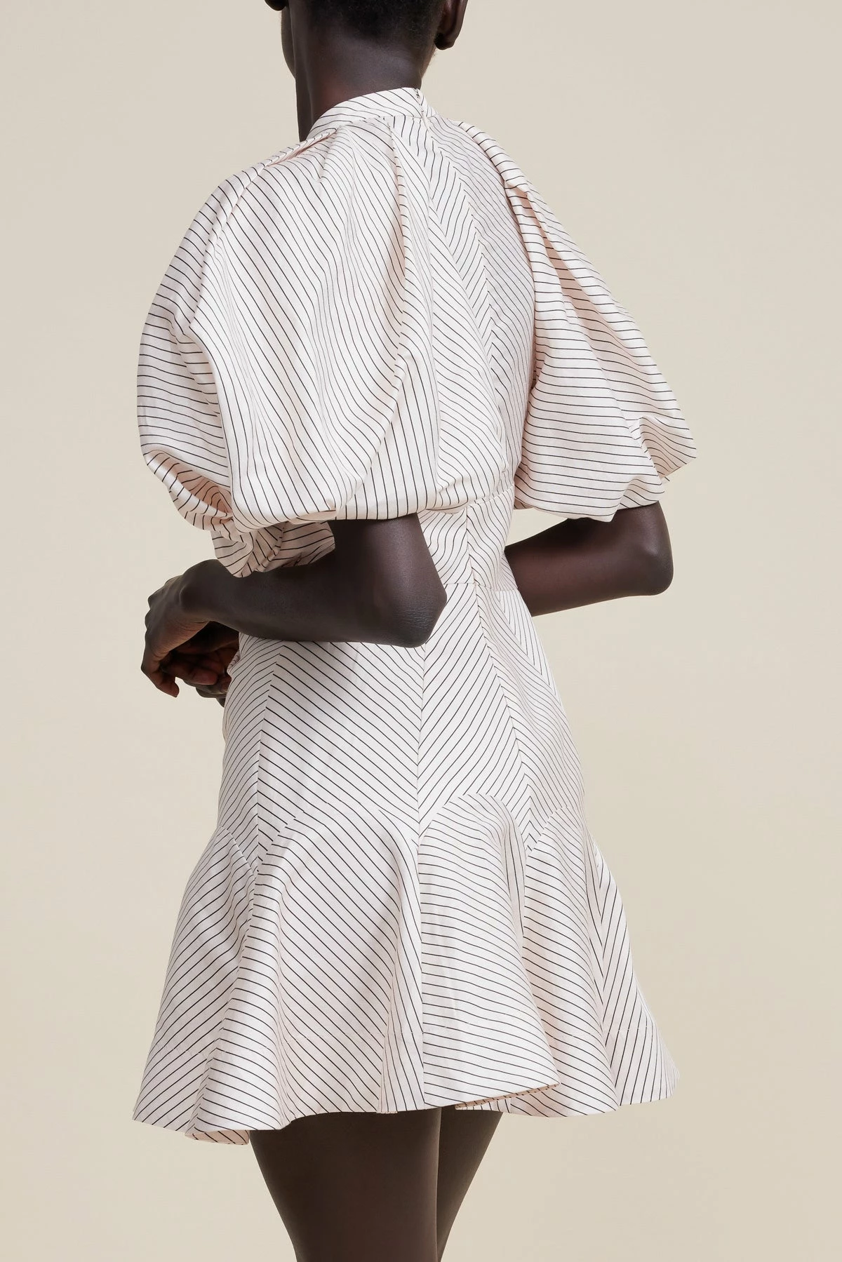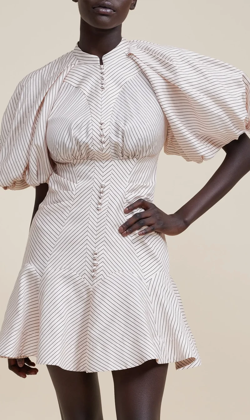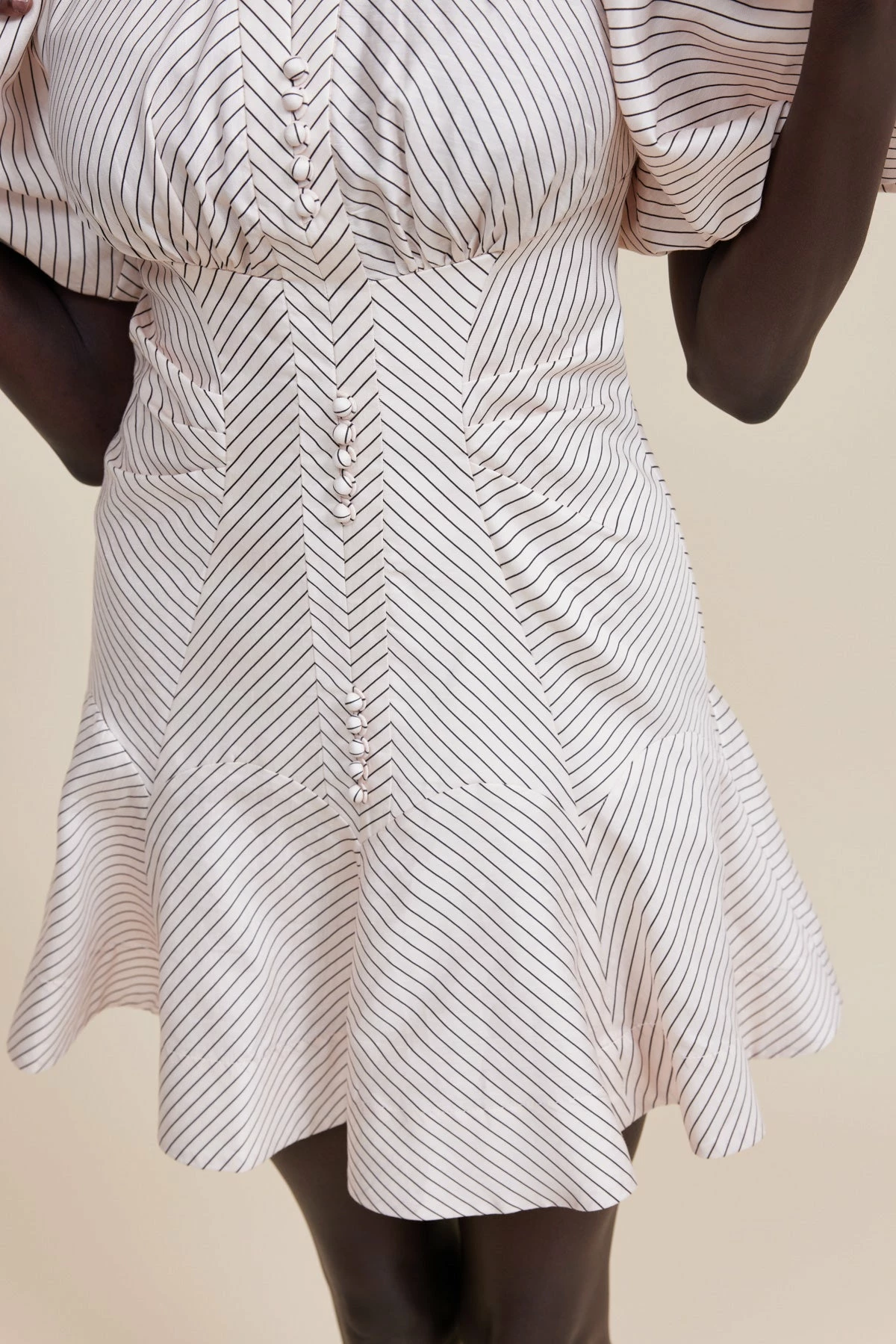 The Acler Heaton Dress in Midnight Stripe is the perfect party dress. Crafted from a fresh fabrication, designed to be fitted at the waist and relaxed towards the hem. With accentuated sleeves, self-coloured buttons and a soft frill towards the hem. Pair yours with a pair of white heels and a clutch for a nighttime look.Â