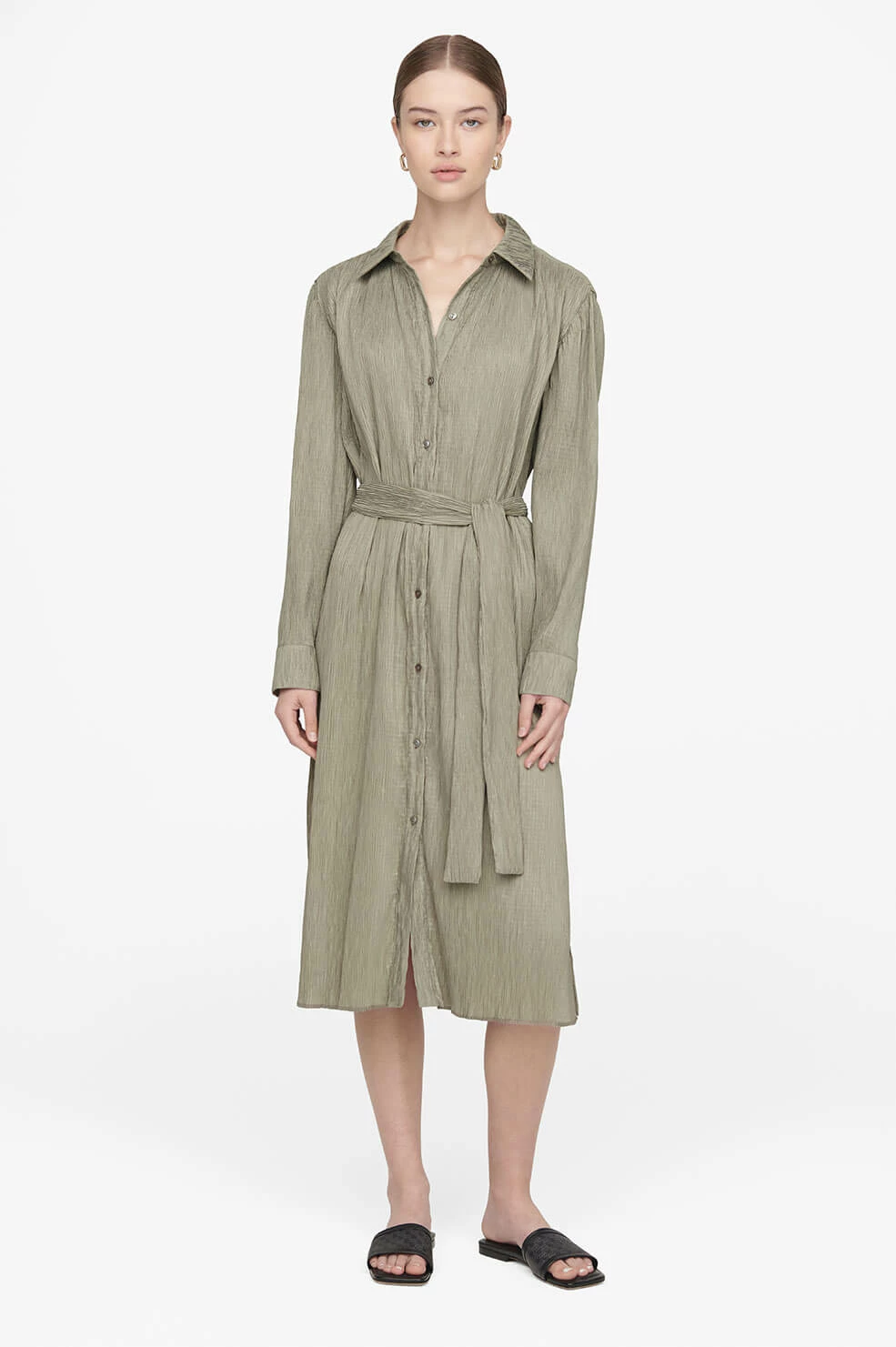 The Anine Bing Alma Dress in green khaki is a versatile, button-up style fabricated in light and airy 100% polyester with crinkled surface texture. It features dropped shoulder seams, relaxed long sleeves, a midi-length hem, and an optional belt to cinch the waistline.