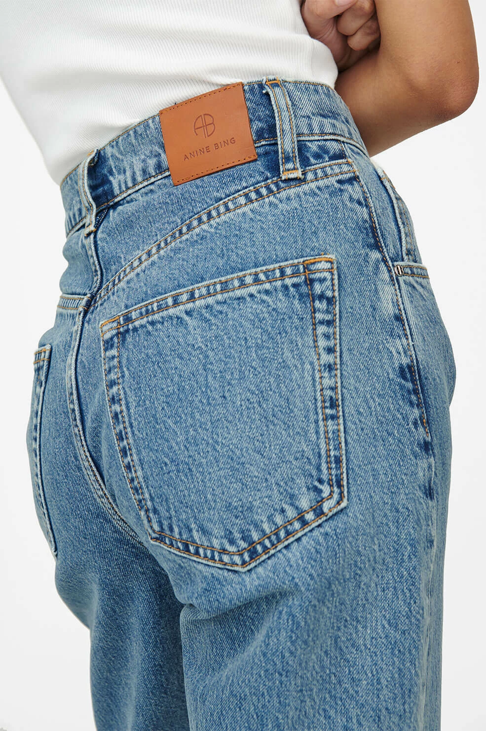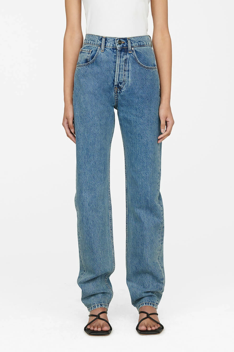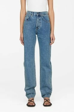 The Anine Bing Frances Jean in River Blue is a new vintage-inspired fit made from 100% rigid organic cotton denim in a clean blue wash with highs and lows throughout. This style features a high waist, slightly dropped crotch, and traditional five-pocket design.