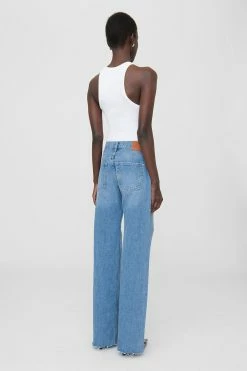 The High Jean by Anine Bing is a relaxed, ’90s-inspired jean constructed from a rigid organic cotton blend in a classic blue wash with vintage-inspired grinding, hand sanding, and highs and lows throughout. The Hugh Jean features a wide leg and raw-edge hem.