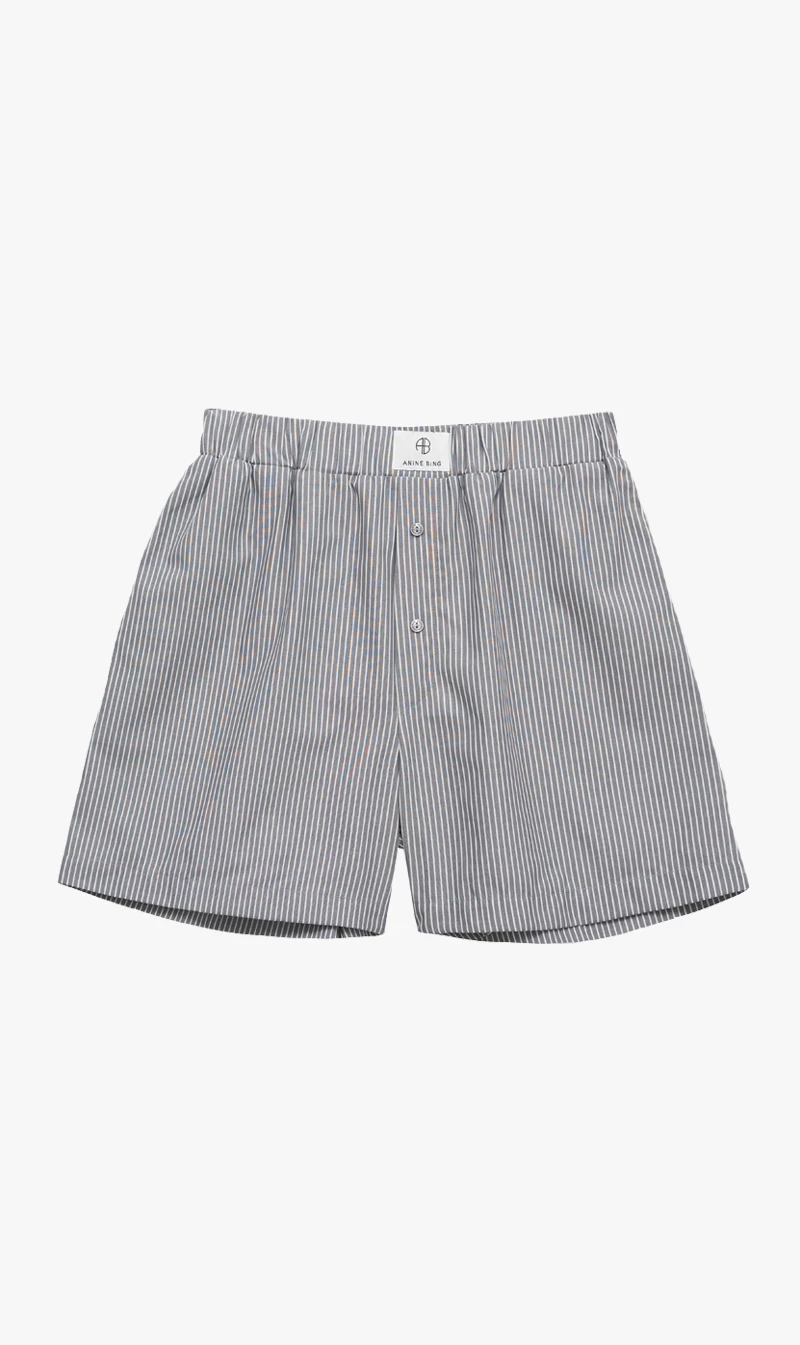 The Anine Bing Liam Boxer Short in Grey And White Stripe is an elevated take on a classic boxer short. Designed to be perfect for lounging, crafted from an unlined, striped cotton-poplin fabrication complete with slant pockets and a sport-inspired label attached to its centre-front waistband.Â