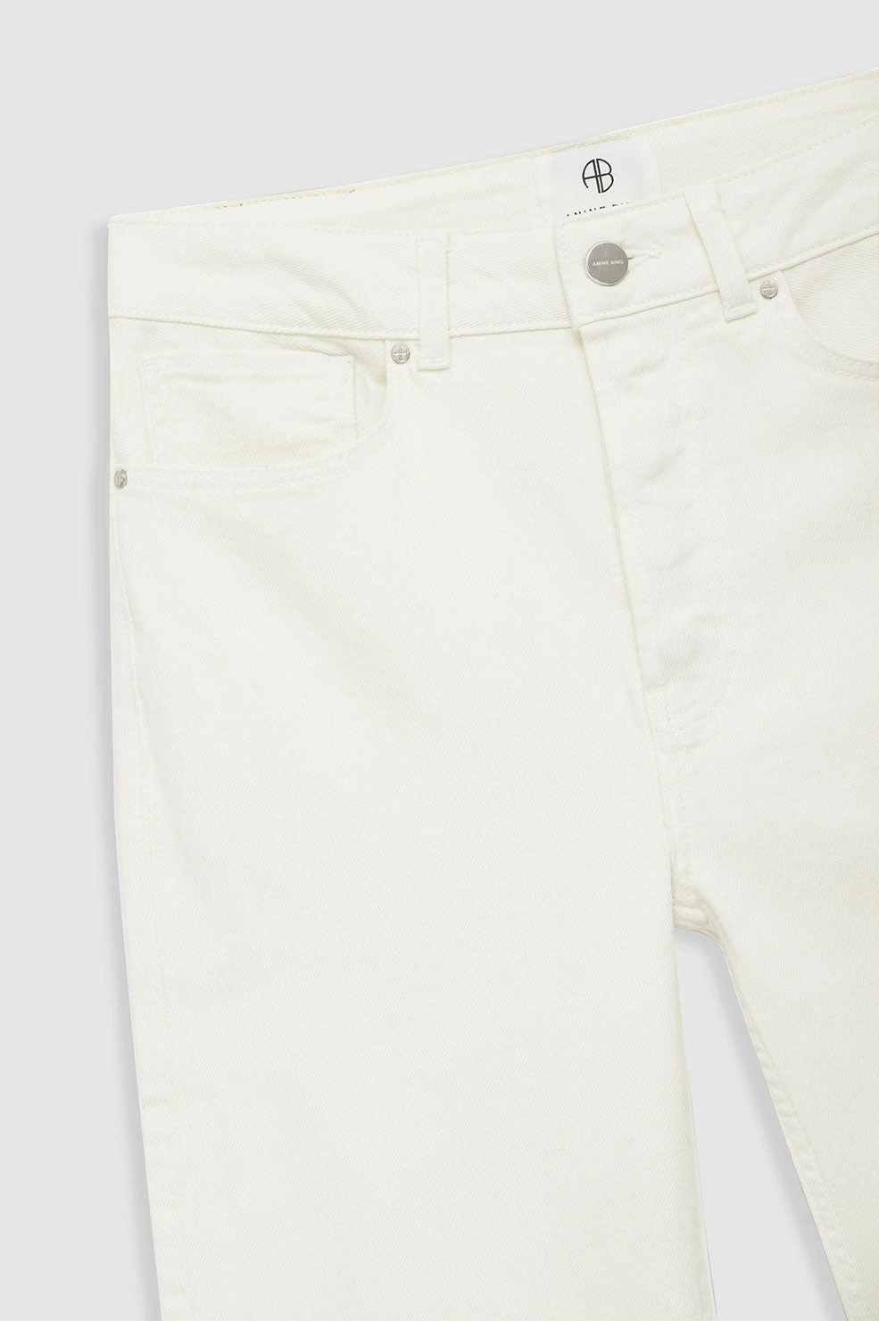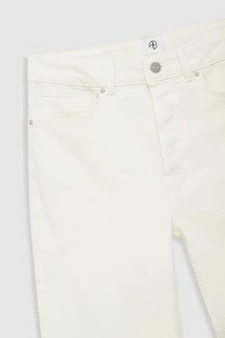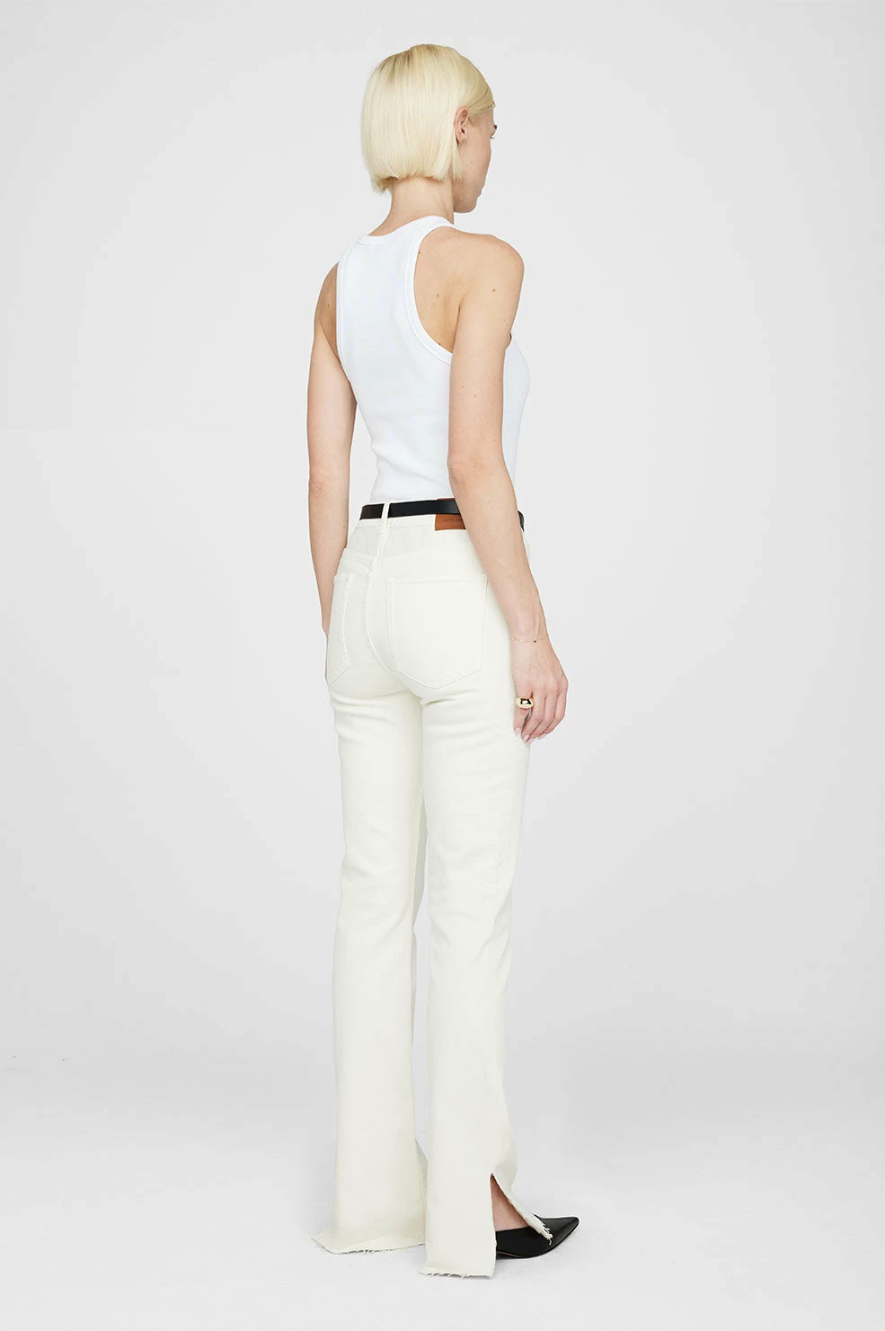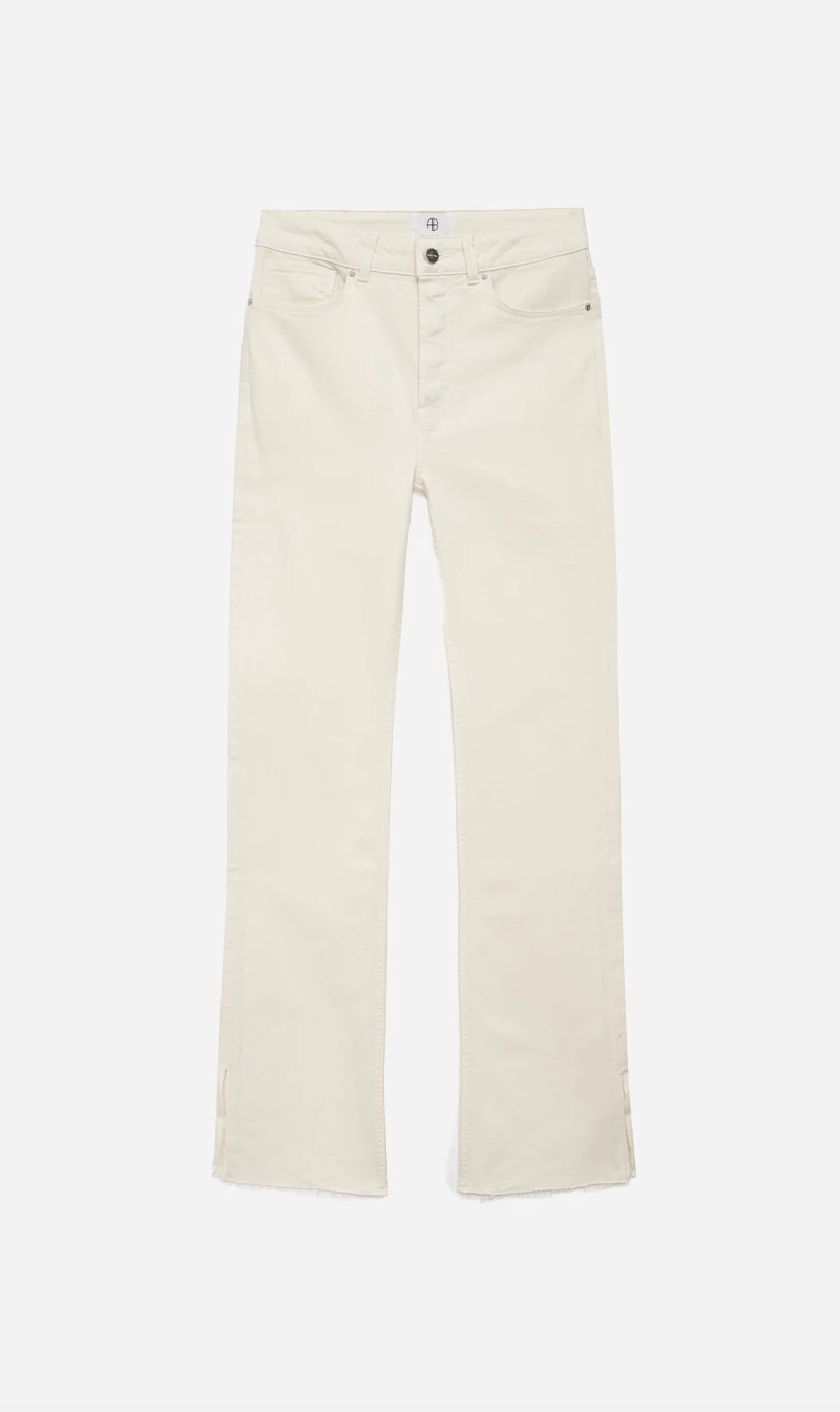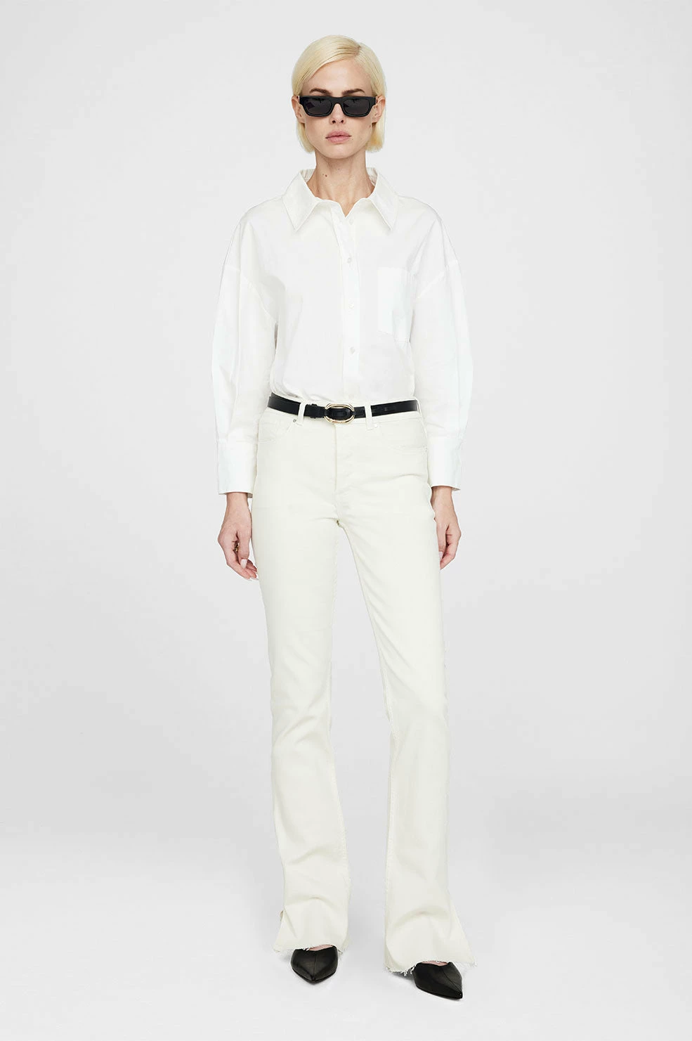 The bootcut Roxanne Jean by Anine Bing is updated for summer in off white. This iconic style is constructed in our signature comfort-stretch denim with authentic, worn-in character. Finishes include a raw-edge hem accented with a single vertical slit detail along both side seams, resulting in a look that is undeniably ’90s inspired. This high-waisted jean is cut for a close, slim fit that extends into a full-length bootcut leg. A raw-edge hem allows for easy modifications if alterations are desired. Take your true size.
