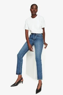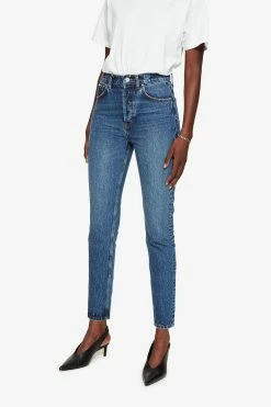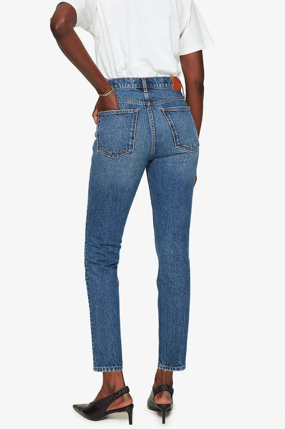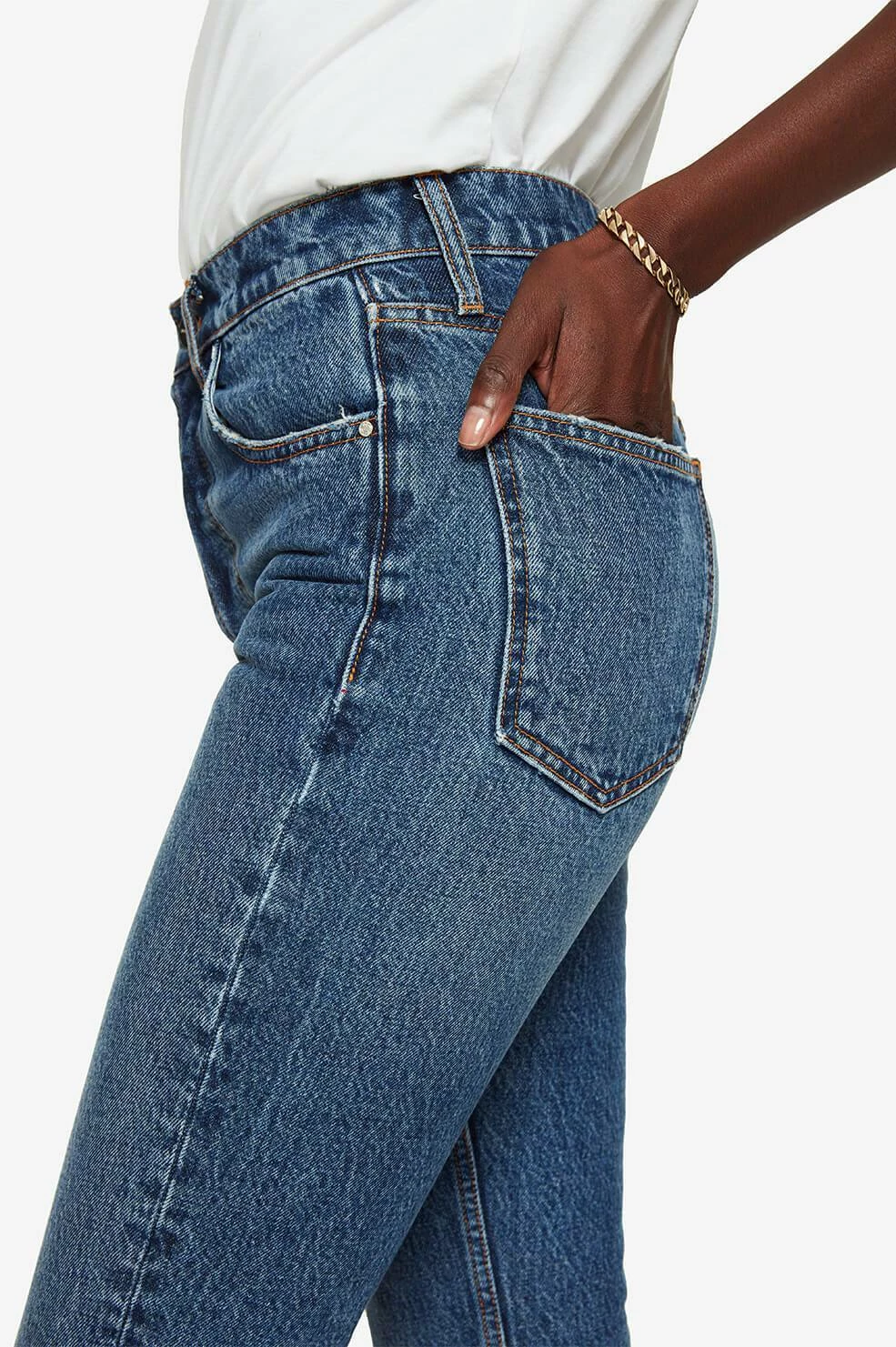 The Anine Bing Sonya Jean is an everyday wardrobe building block. It’s constructed from 100% cotton rigid denim in a versatile mid indigo wash inspired by authentic vintage denim.