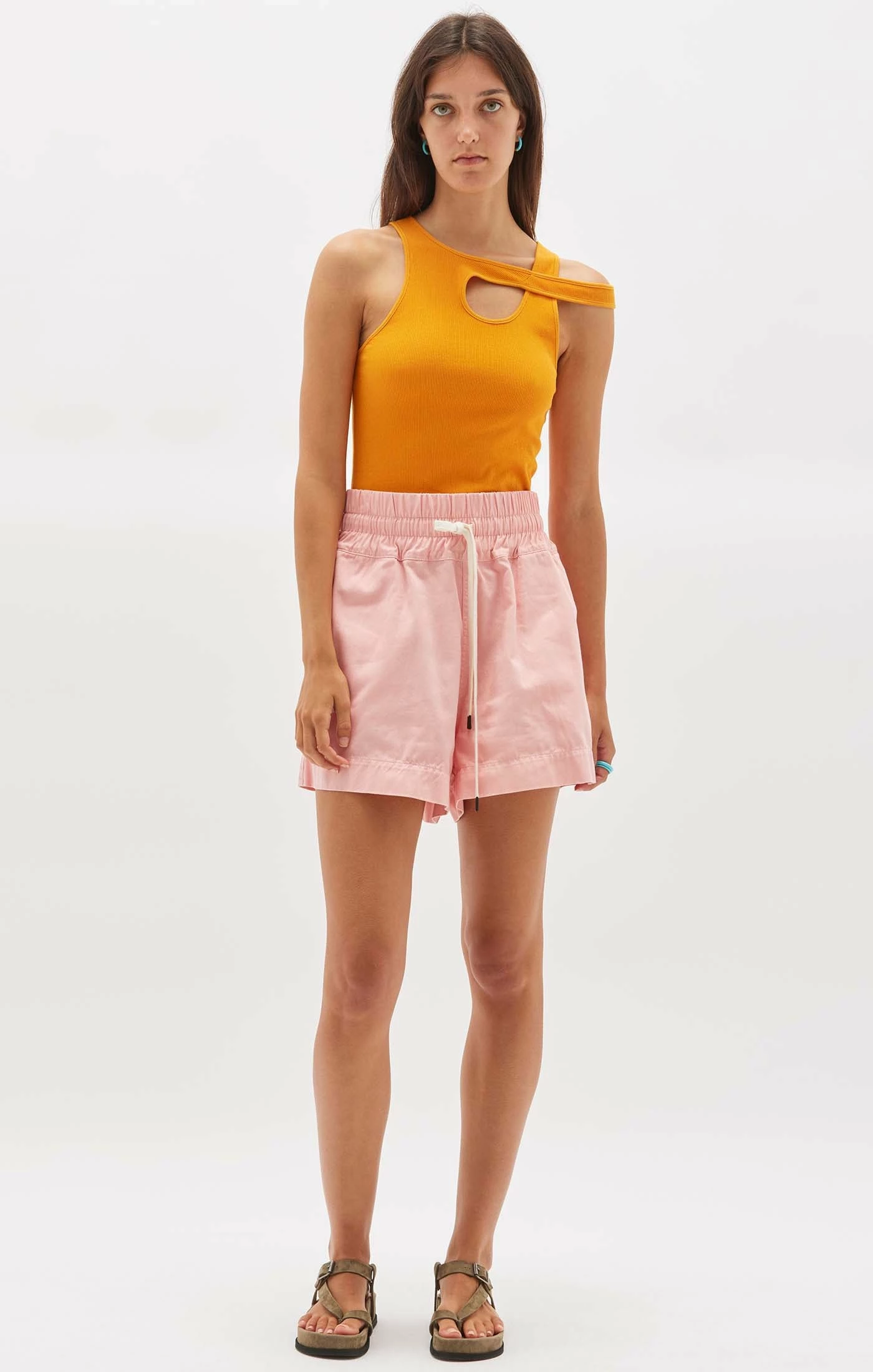 A summer essential, the Cotton Twill Summer Short by Bassike is a high rise pull on short in Japanese cotton twill. Featuring an elasticised waist with wide waistband and slightly flared leg, pair with a simple white tee and tan sandals for a chic and tonal look.Â