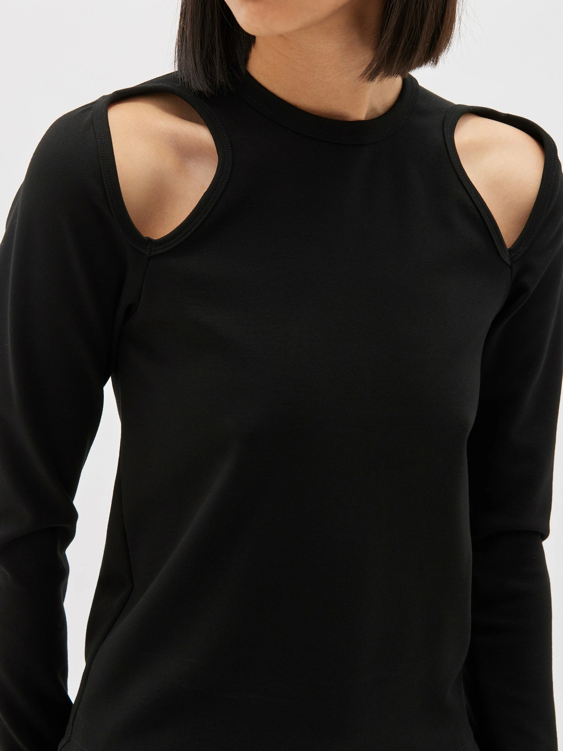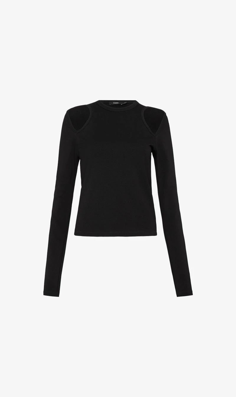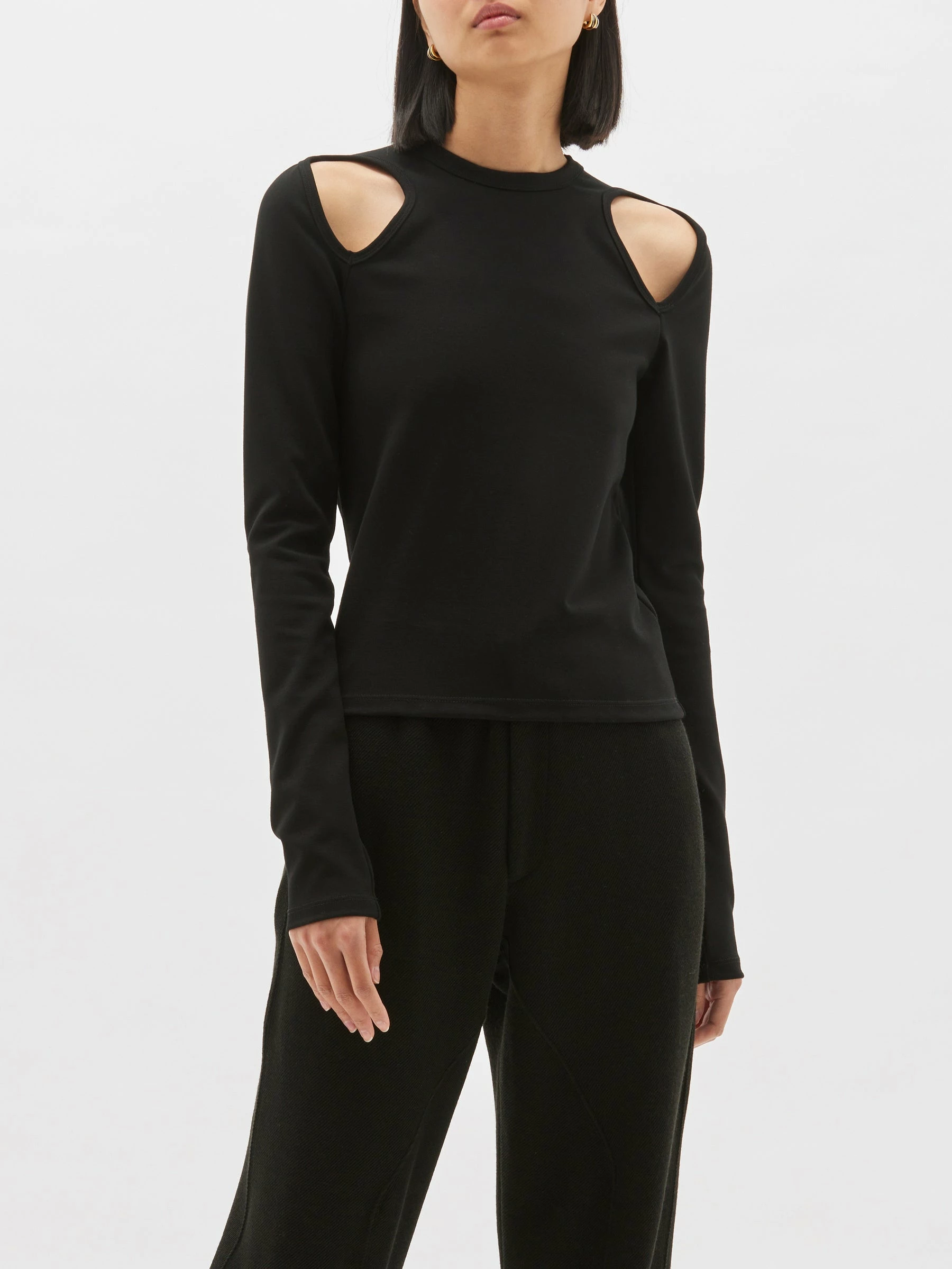 The Bassike Italian Jersey Cut Out Sleeve Top in Black. A slim fit top with cut out detail, in italian double woven jersey viscose.Â