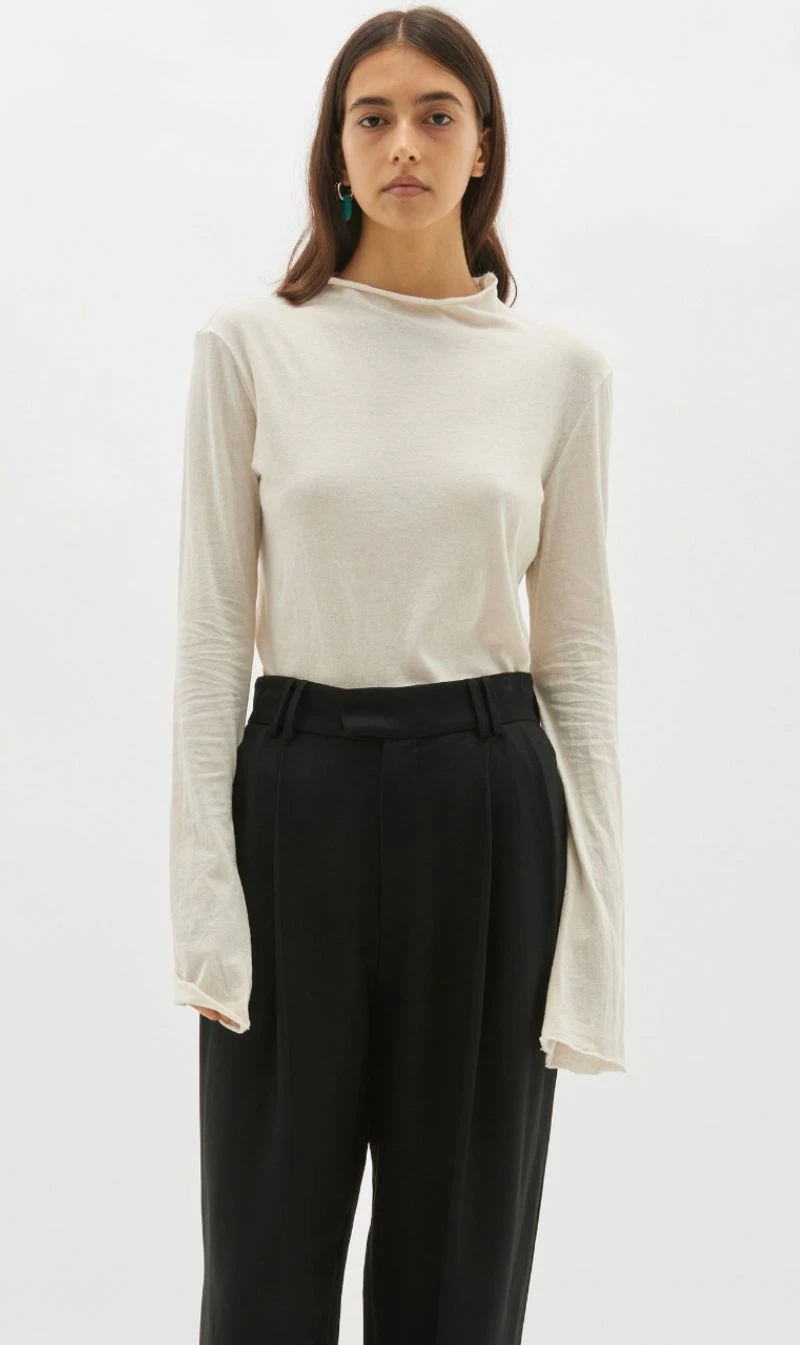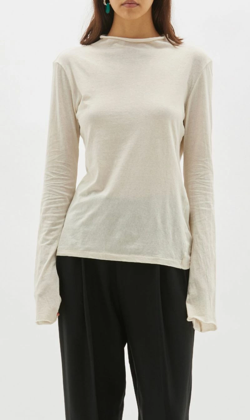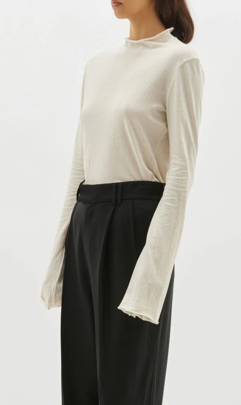 The Bassike Raised Neck Long Sleeve T-Shirt in Salt is a slim fit organic cotton long sleeve t.shirt with a raised funnel neck, raw finish on neckline and cuffs, and a finished bottom hem.