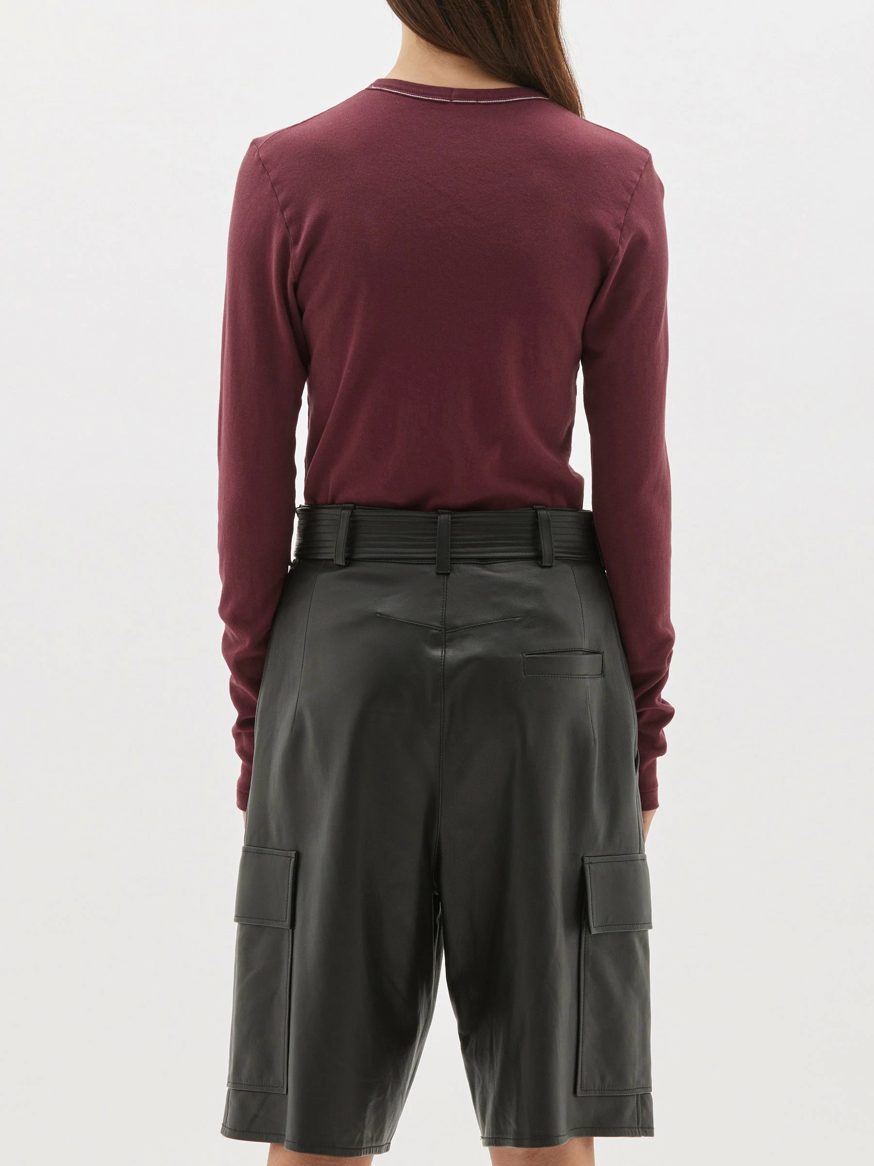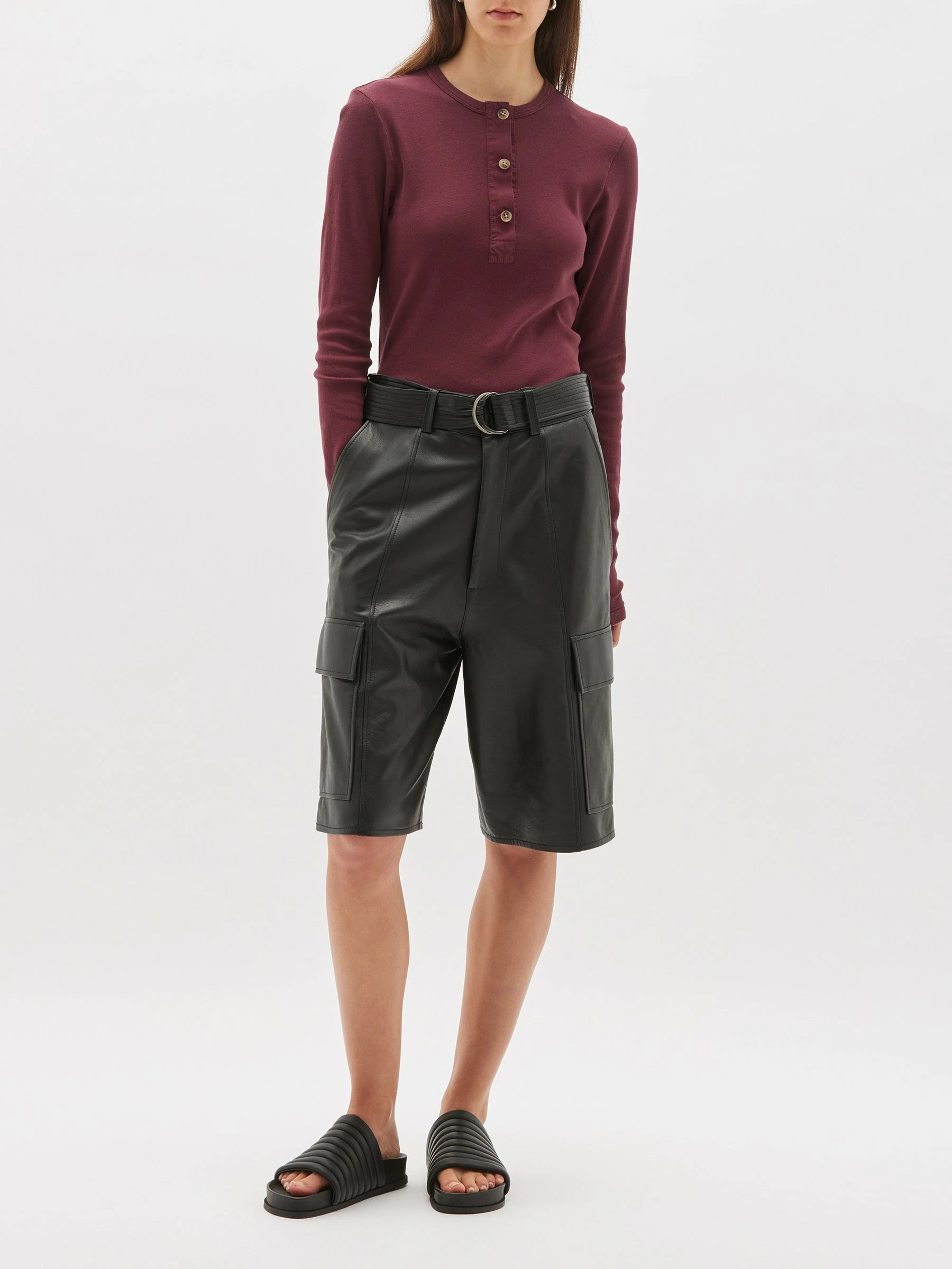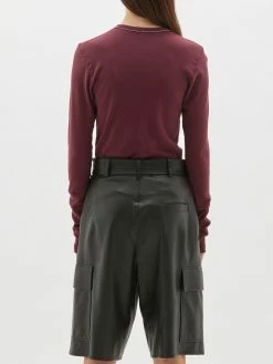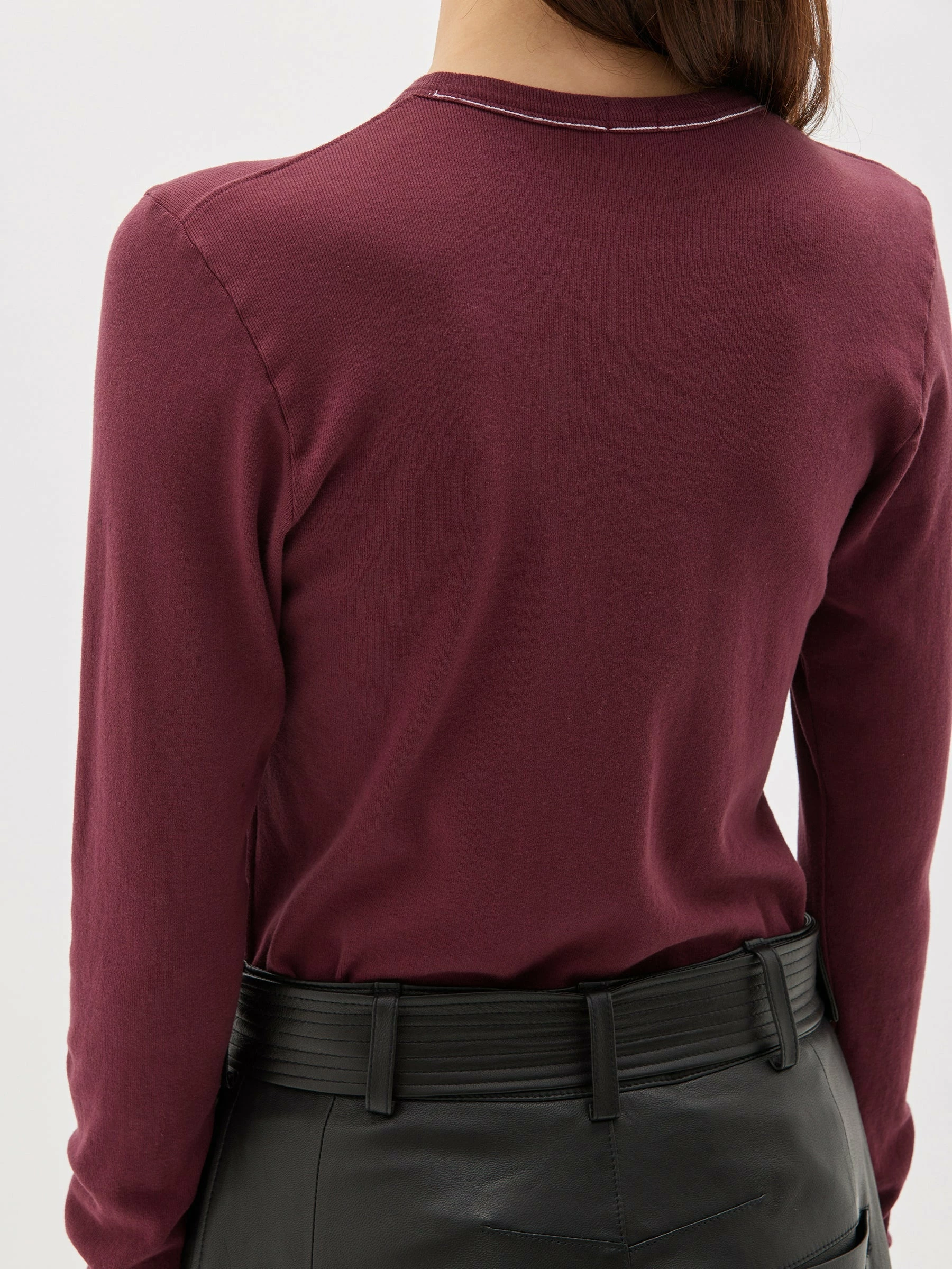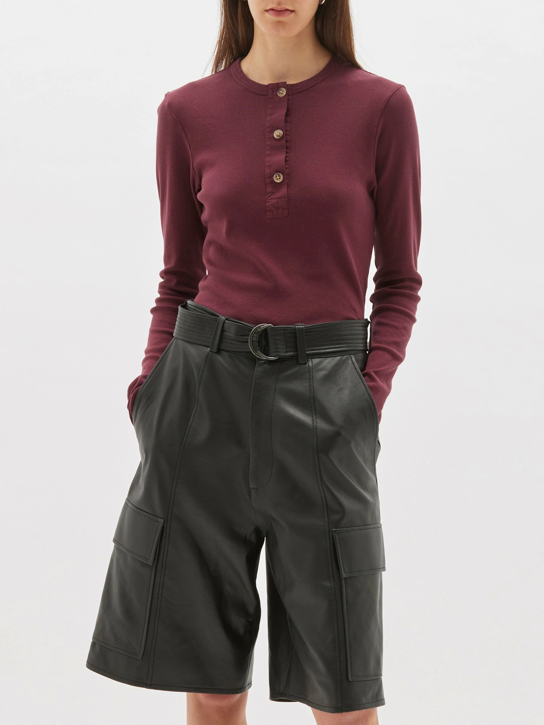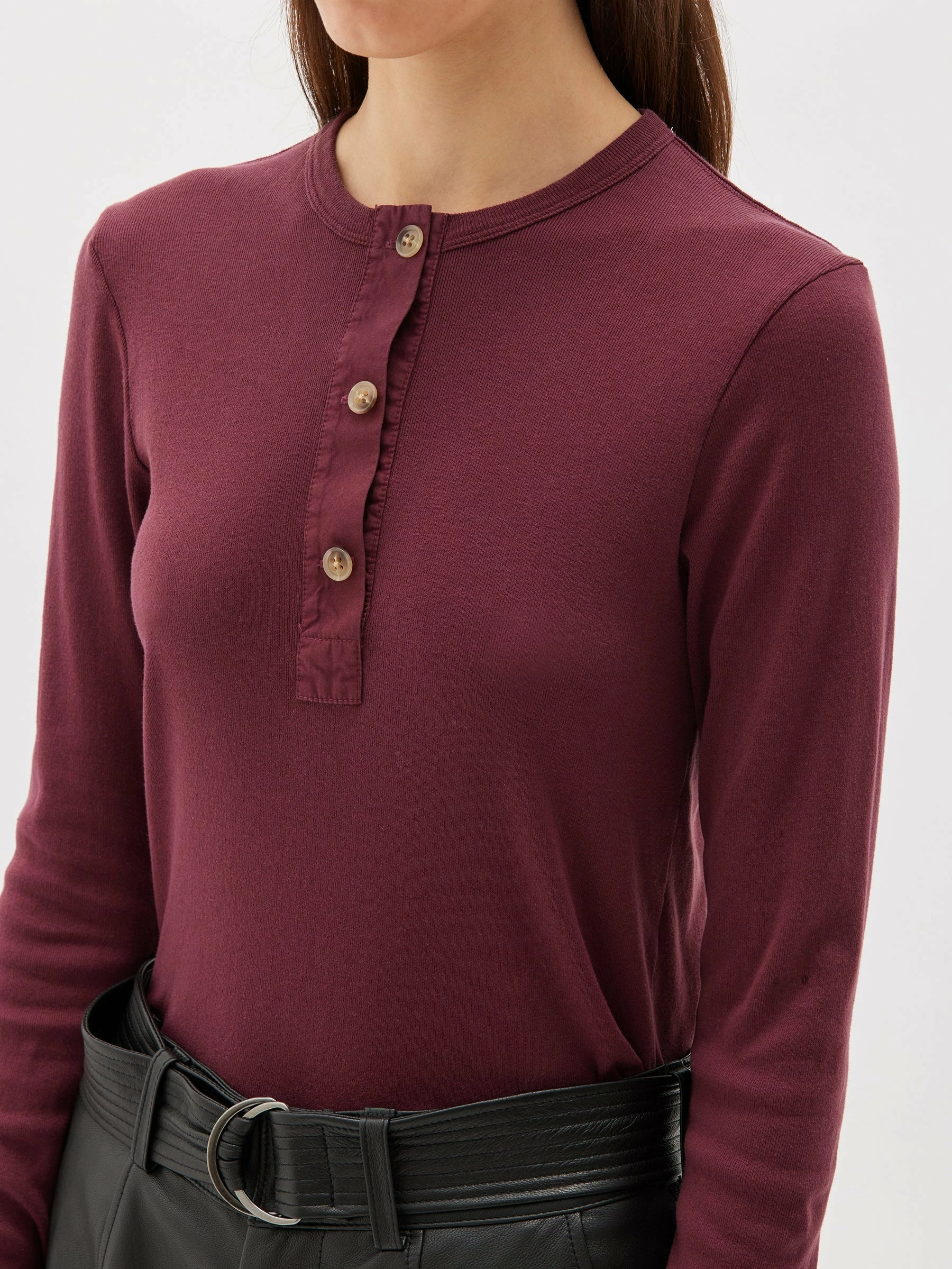 The Bassike Rib Contrast Placket Long Sleeve T.Shirt in Mulberry. A slim fit long sleeve t.shirt with contrast placket, in organic cotton jersey. a cotton poplin front placket with button details.Â