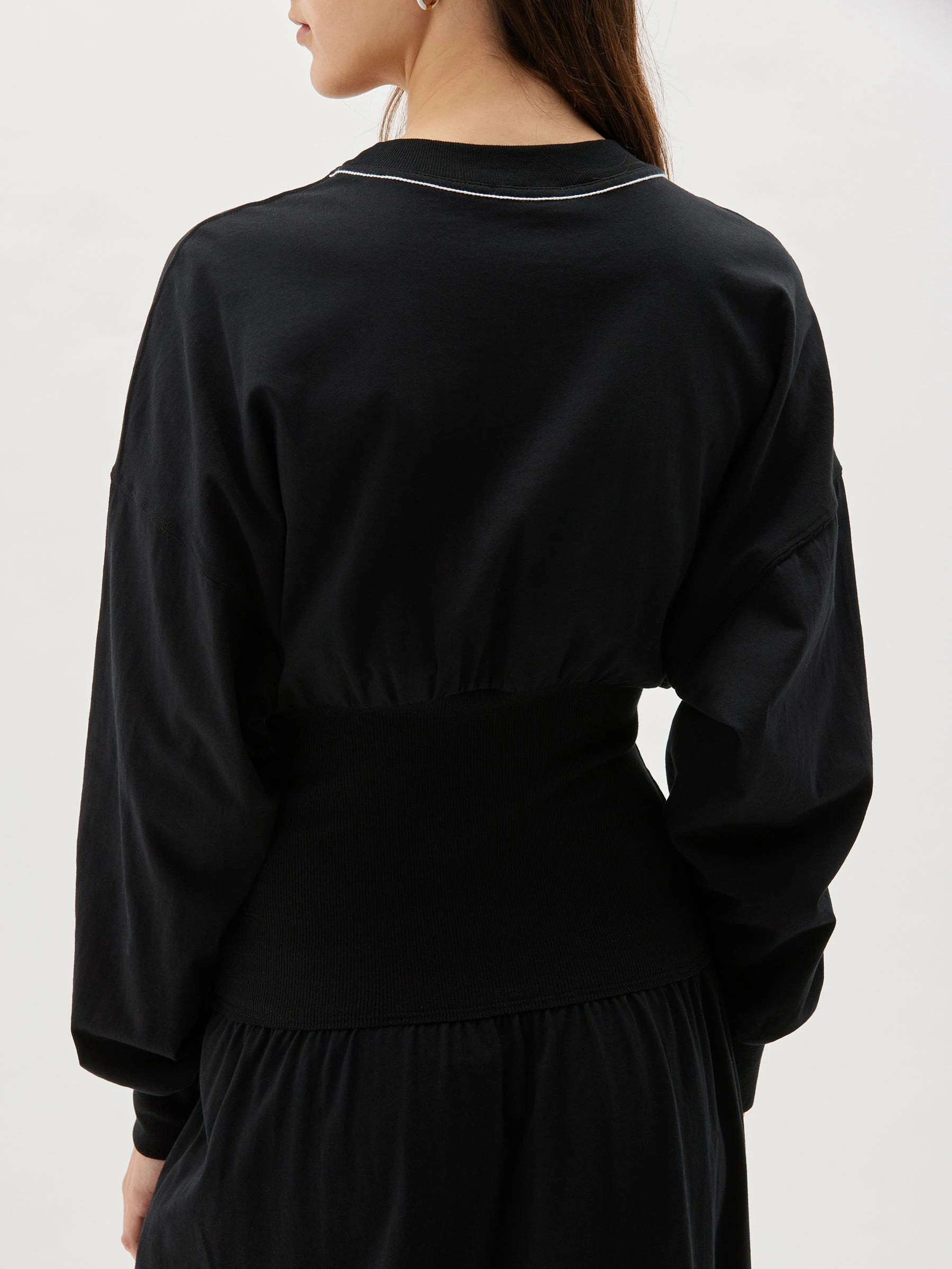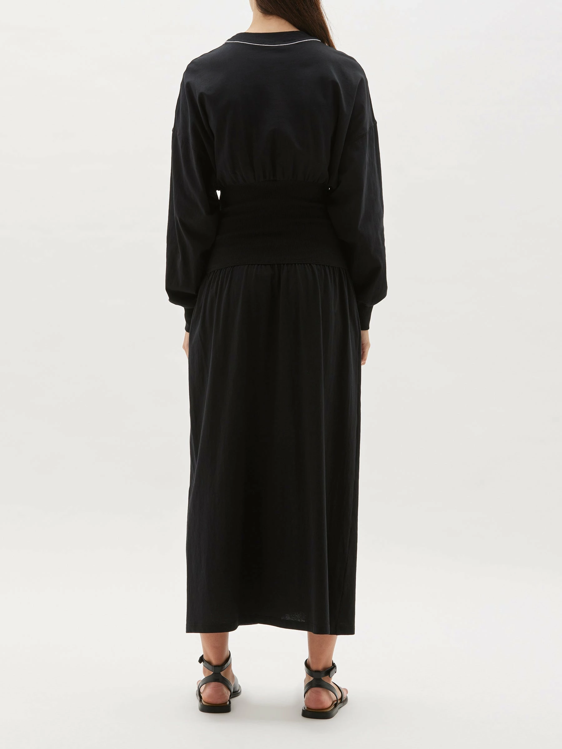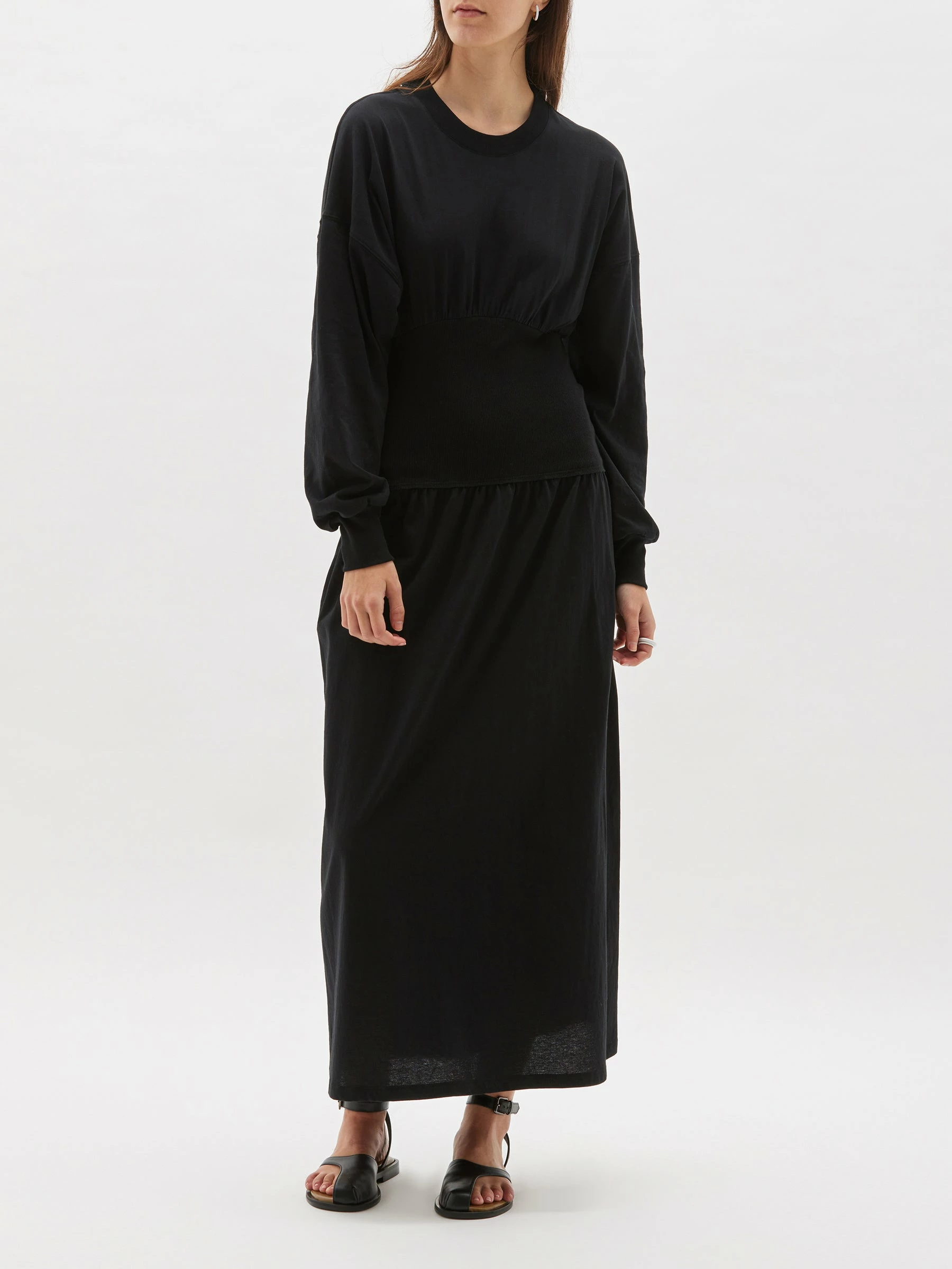 The Bassike Rib Insert Longerline dress in Black. The longerline long sleeve t.shirt dress in organic cotton jersey with cotton mini rib waist panel detail.