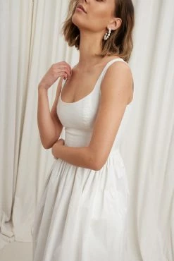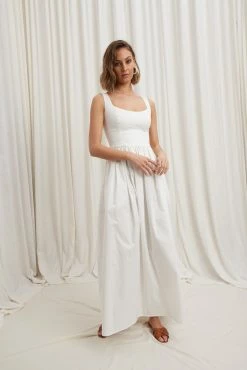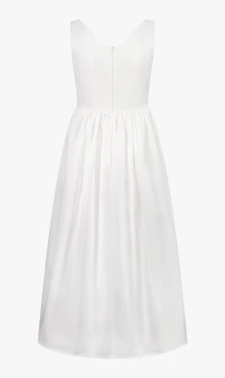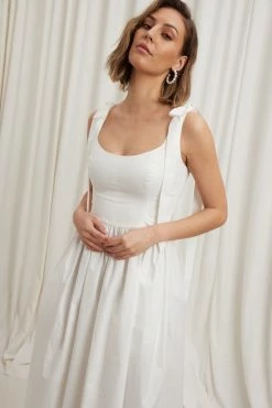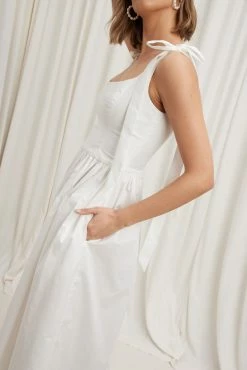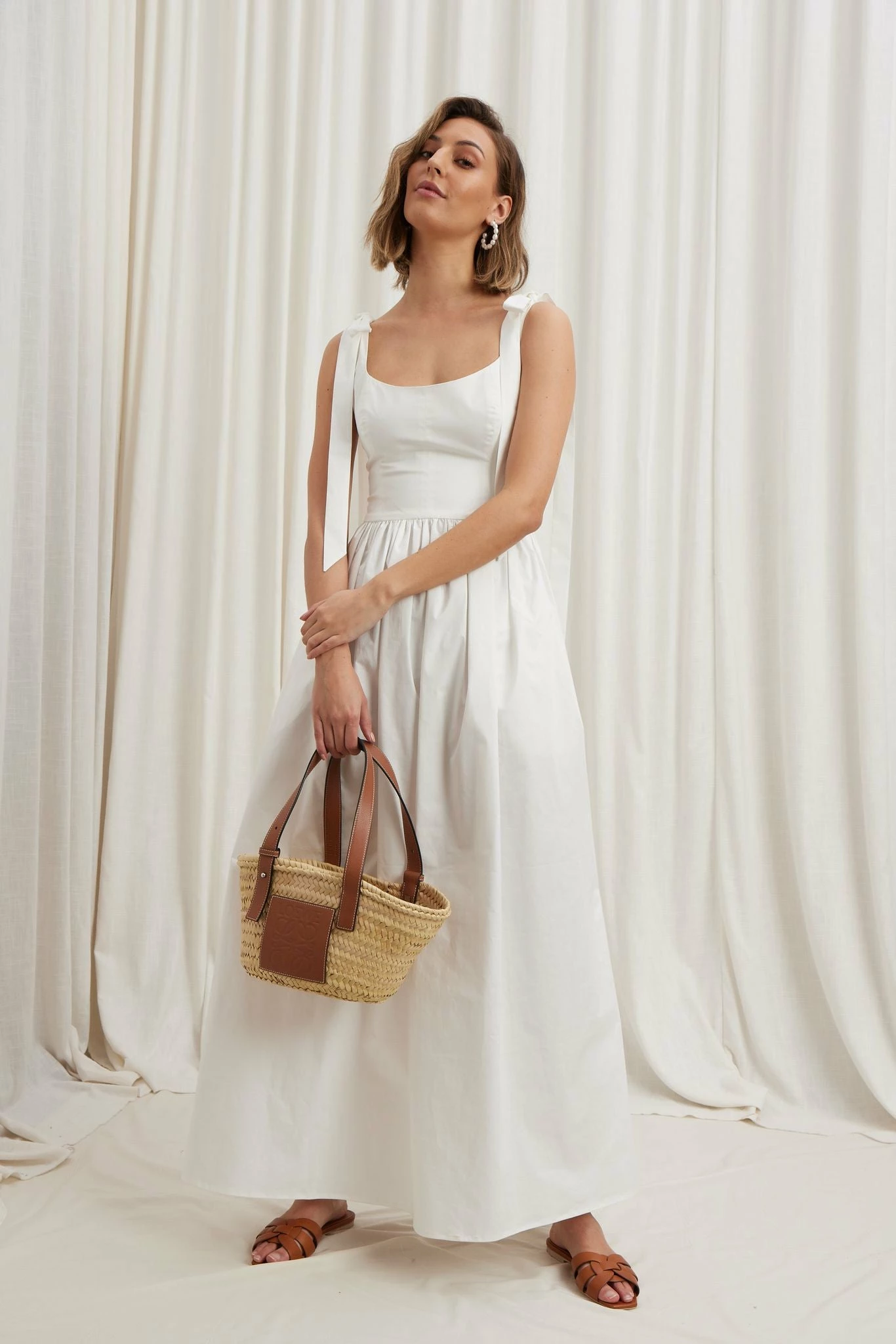The Caitlin Crisp Meadow Dress in White is a classic piece for all your late summer events. Featuring a fitted bodice with the perfect amount of stretch and detachable bow ties on the shoulder. Wear the ties as is, without, or even tie one as a bowed belt.