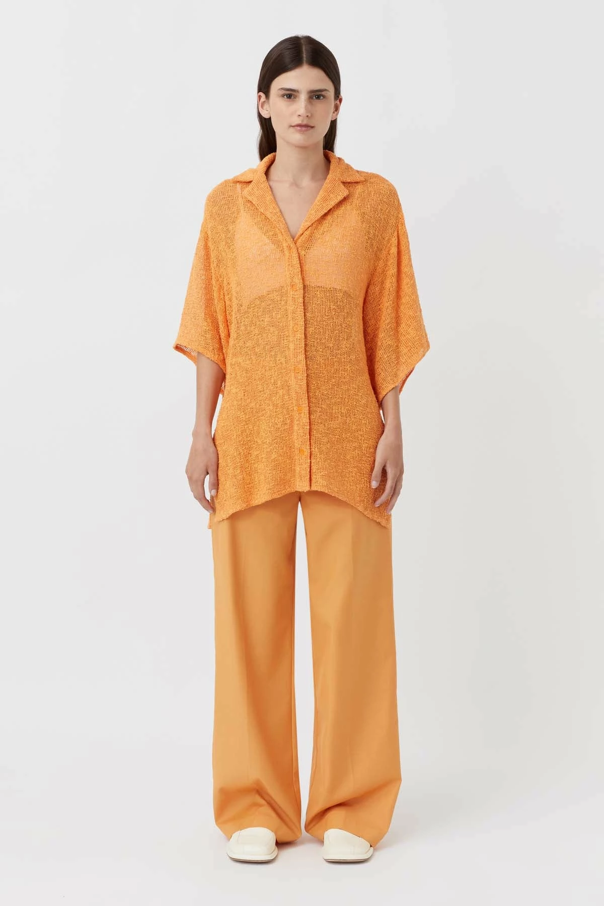 The Camilla and Marc Clementine Shirt in Persimmon will add a fun pop of colour to your look! Crafted with a soft cotton blend yarn in an open weave creating a slight mesh look. Designed to be a men’s style fit shirt, it plays with classic shirting notions like a notched collar, exaggerated short sleeves, and side splits for a feminine touch. This shirt is perfect for either the beach or the bar.