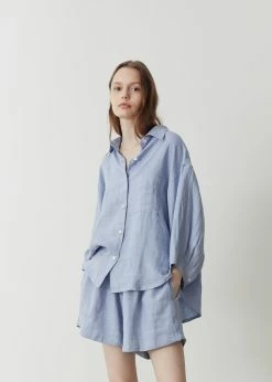The 03 set by Deiji Studios in Cornflower is both simple and relaxed. Featuring an oversized box-fit linen shirt with wide arms and a front pocket, this romantic shirt can be worn separately or together with the matching shorts – a mid-rise, the loose-fitting boxer style shorts have a faux button-down fly and an elastic waist for extra comfort.