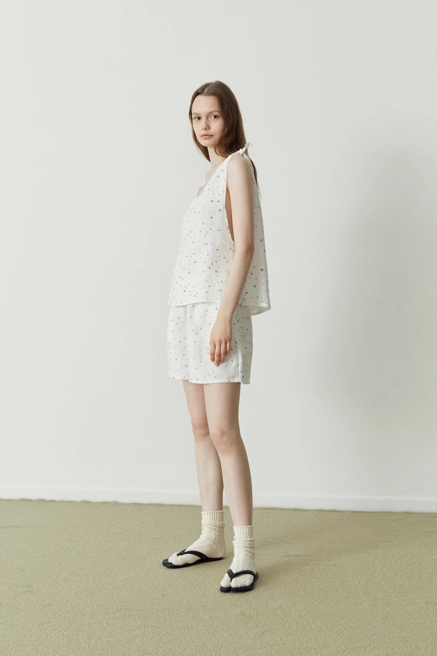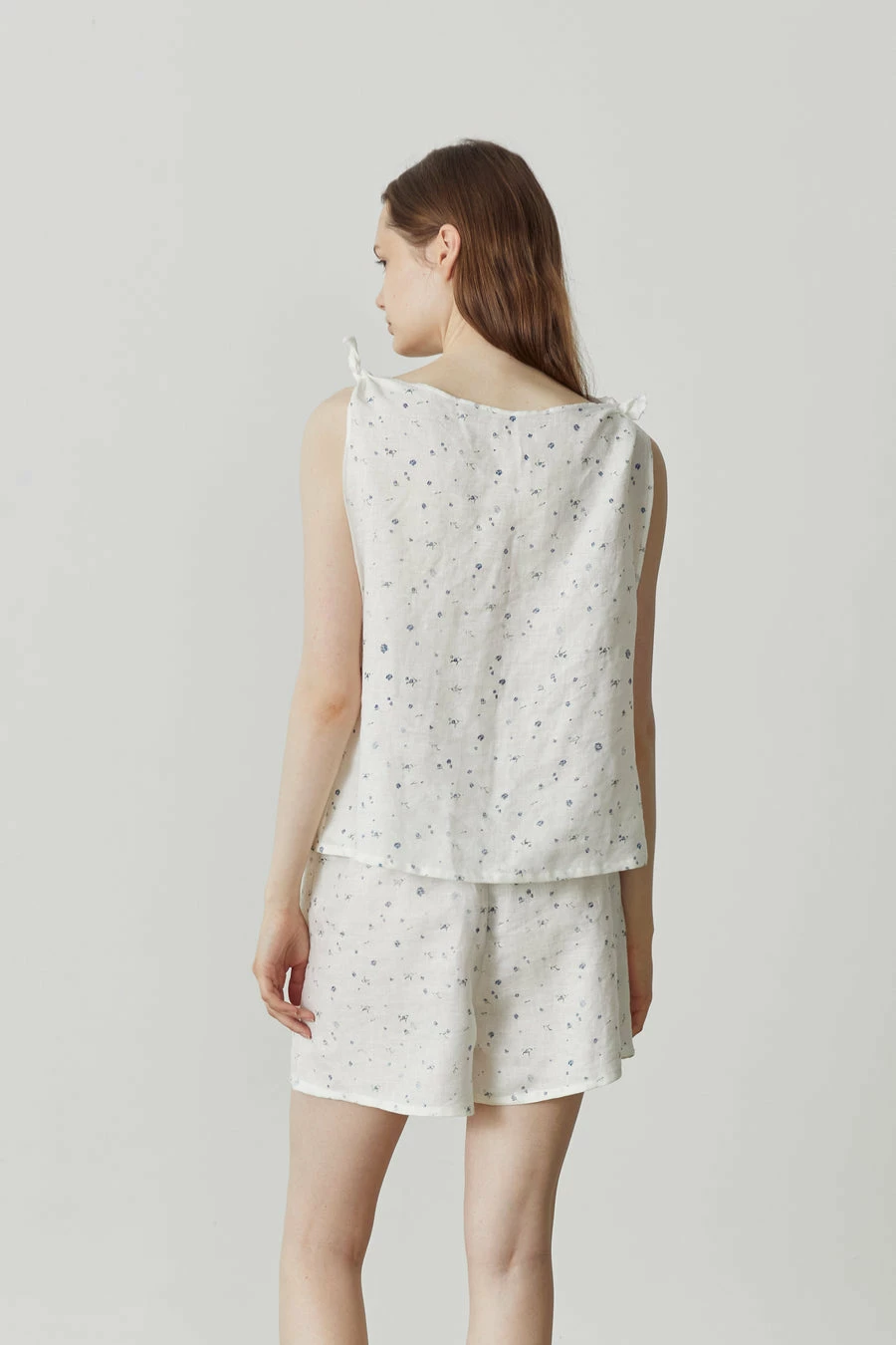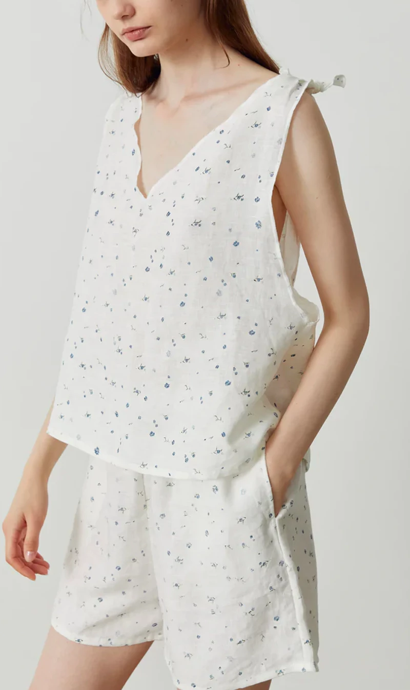 The Knot Set by Deiji Studios in Garden is simple, elevated and luxuriously soft. The top features a flattering v-neckline, angled armholes and baby lock finish detailing and is knotted gently to secure at the shoulders. Wear separately or pairs back with matching shorts that feature a soft elastic high waist short with side seam pockets.