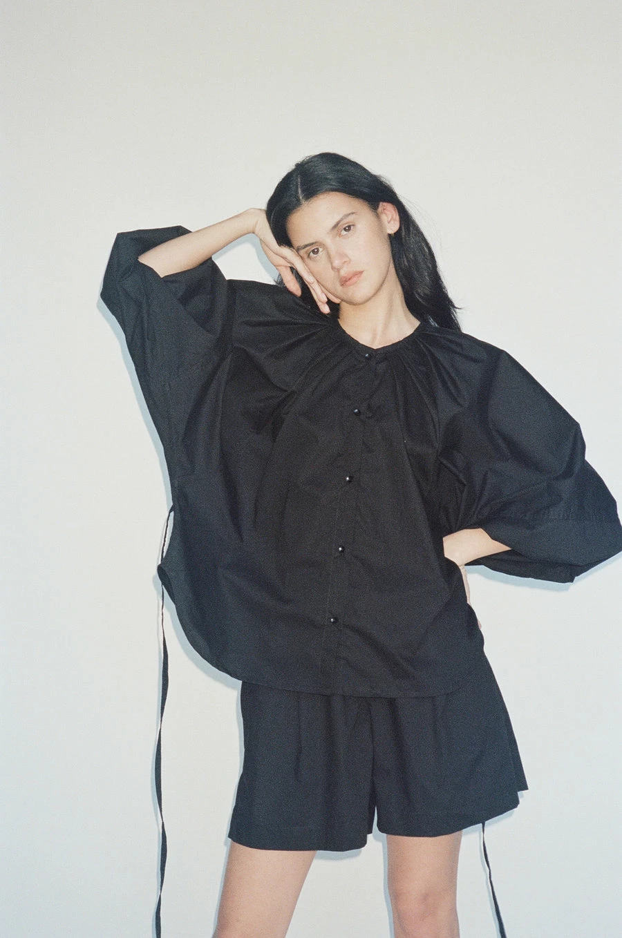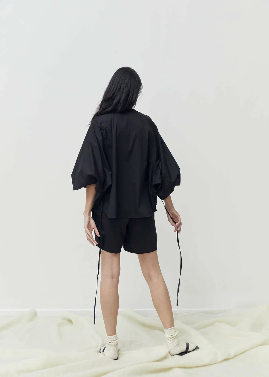 The release tuck set by Deiji Studios in black and court check is a beautiful set for the summer months. Including a crisp button down raglan sleeved shirt with tucks at the neck for a voluminous silhouette, roomy full-length sleeves, an elastic cuff for adjustable length, a curved hem and tie back feature which pairs back neatly with a contrasting soft elastic high waist short with front tucks and side seam pockets. Wear as a set or separately.