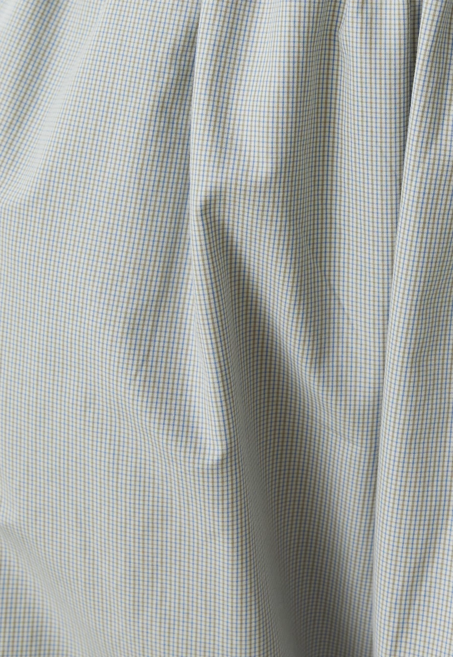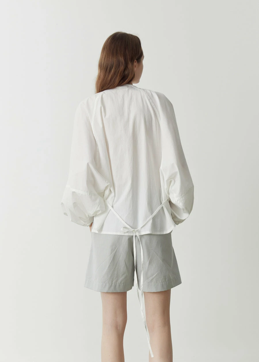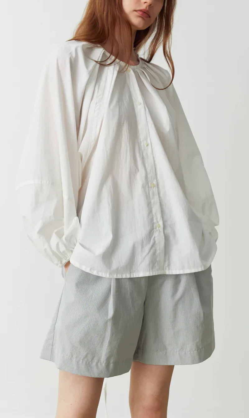 The release tuck set by Deiji Studios in off-white and court check is a beautiful set for the summer months. Including a crisp button down raglan sleeved shirt with tucks at the neck for a voluminous silhouette, roomy full-length sleeves, an elastic cuff for adjustable length, a curved hem and tie back feature which pairs back neatly with a contrasting soft elastic high waist short with front tucks and side seam pockets. Wear as a set or separately.