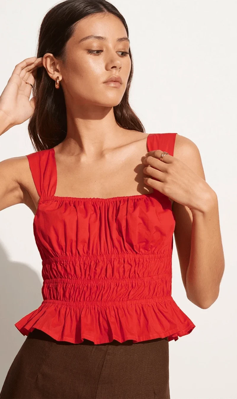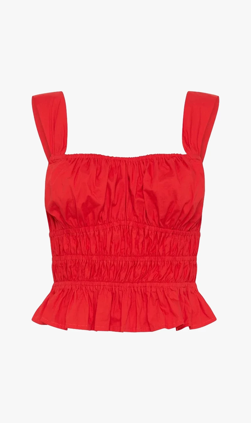 The Faithfull The Brand Tamerici Top Cherry Tomato will add a fun pop of colour to your look. Boasting a square neckline, wide shoulder straps, shirred waistband for an easy fit and frilled hem. Cut and crafted from certified organic cotton poplin, the Tamerici is a bright and bold wardrobe staple you’ll gravitate towards day to date night.