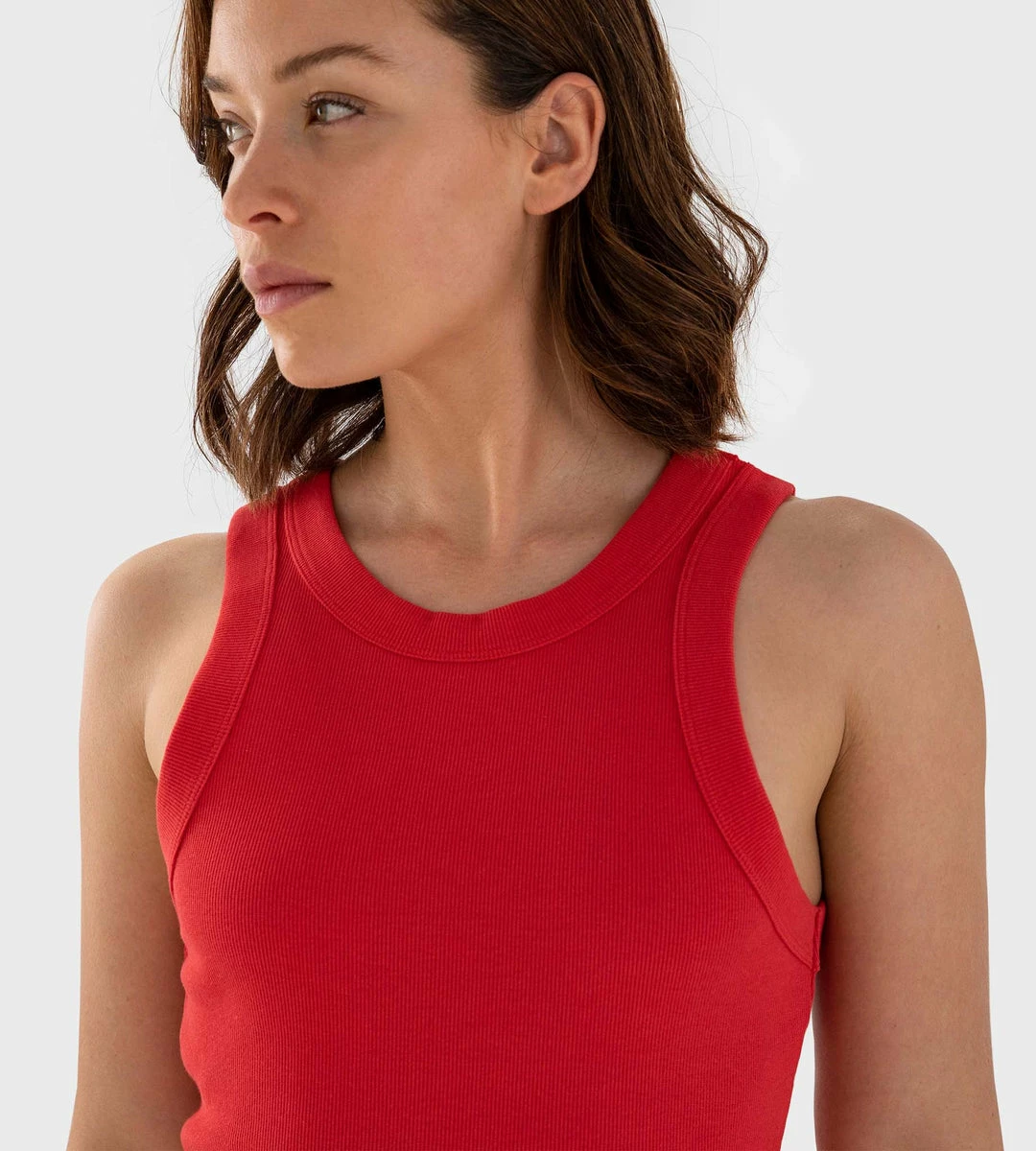 Father Rabbit’s Rib Tank in uplifting Apple Red will elevate your day-to-day and become a true staple piece in your wardrobe you’ll reach for time and again. Ideal for work to weekend, this simple rib tank has a fitted silhouette, simple scoop neckline and tonal binding. Pair with wide-leg pants in crisp white for the ultimate optimistic summer dressing.Â