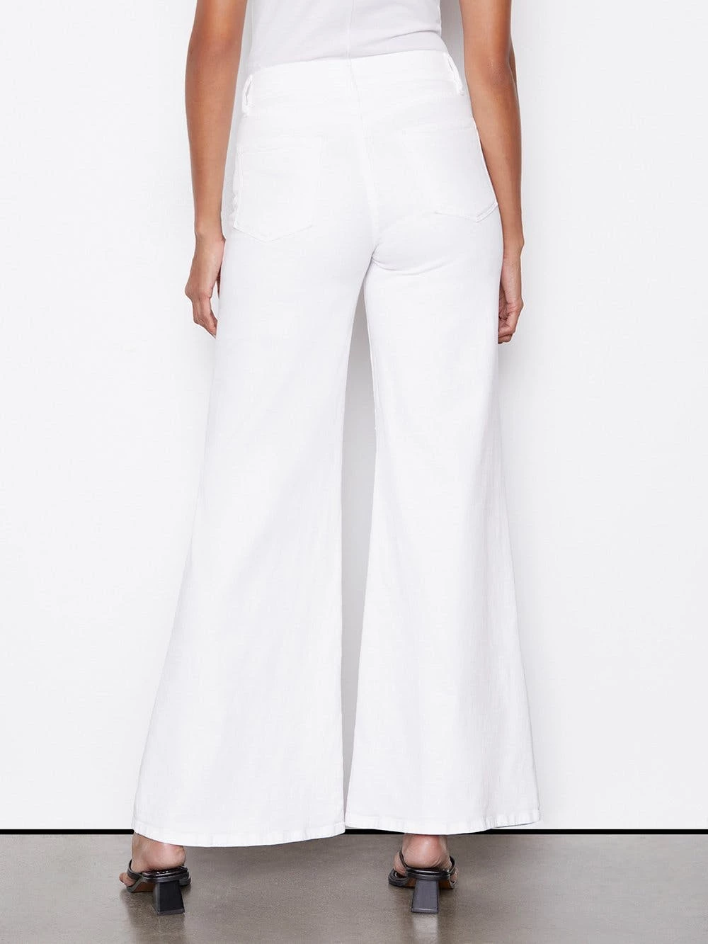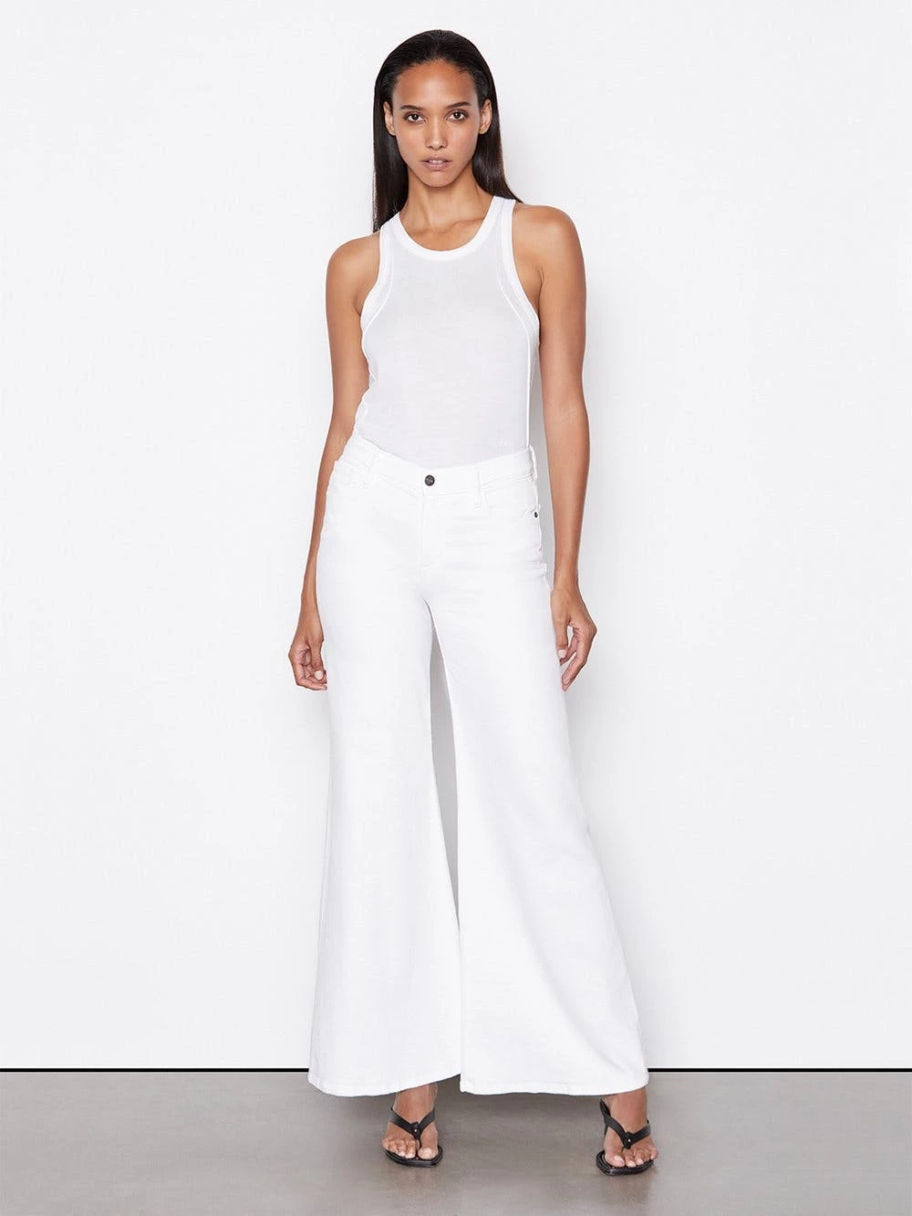 The Frame Denim Le Palazzo Pant in Blanc. A classic 5-Pocket Styling In A Palazzo Silhouette. Constructed Of Premium Denim With A Hint Of Stretch. White Wash, High Rise, Long Wide Leg Finish.