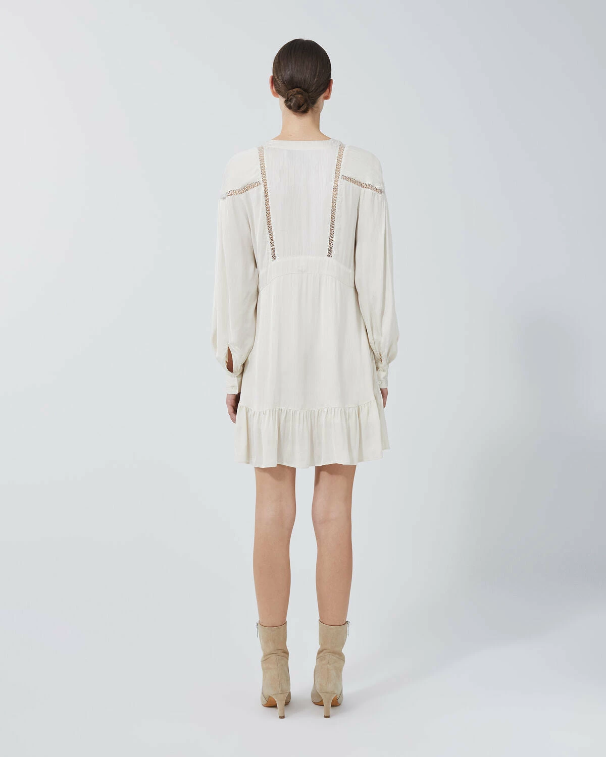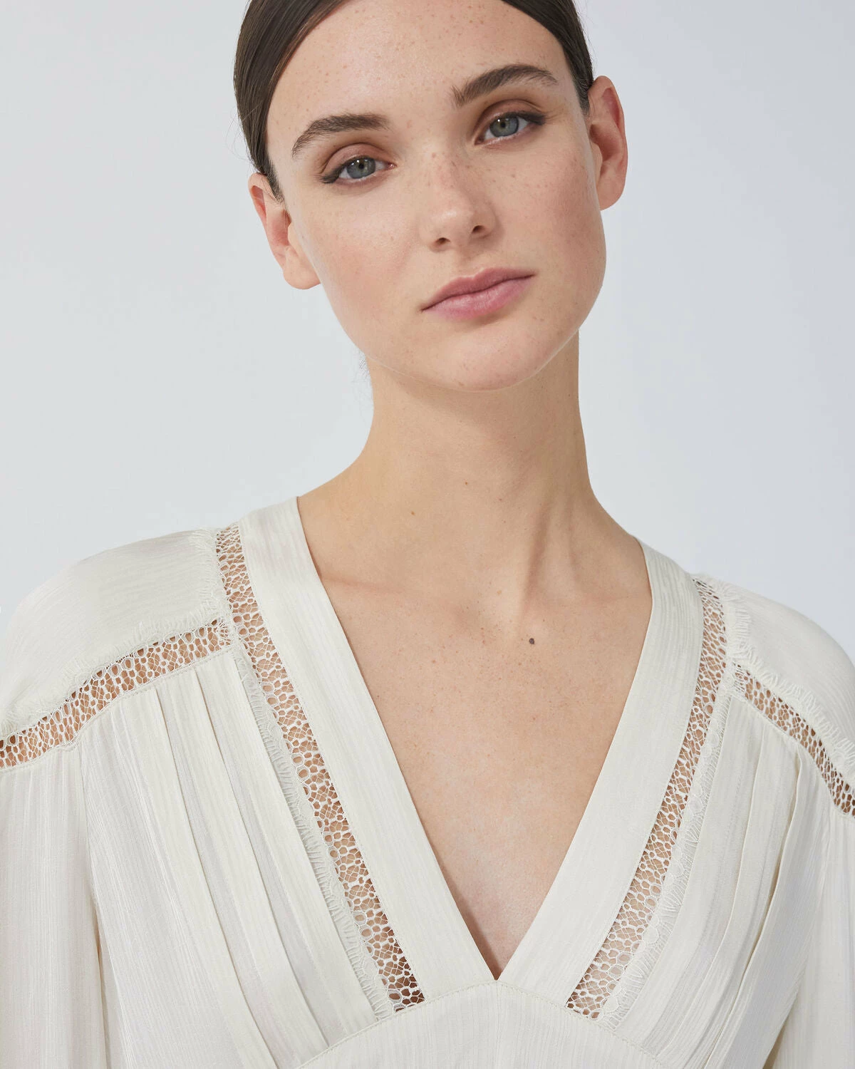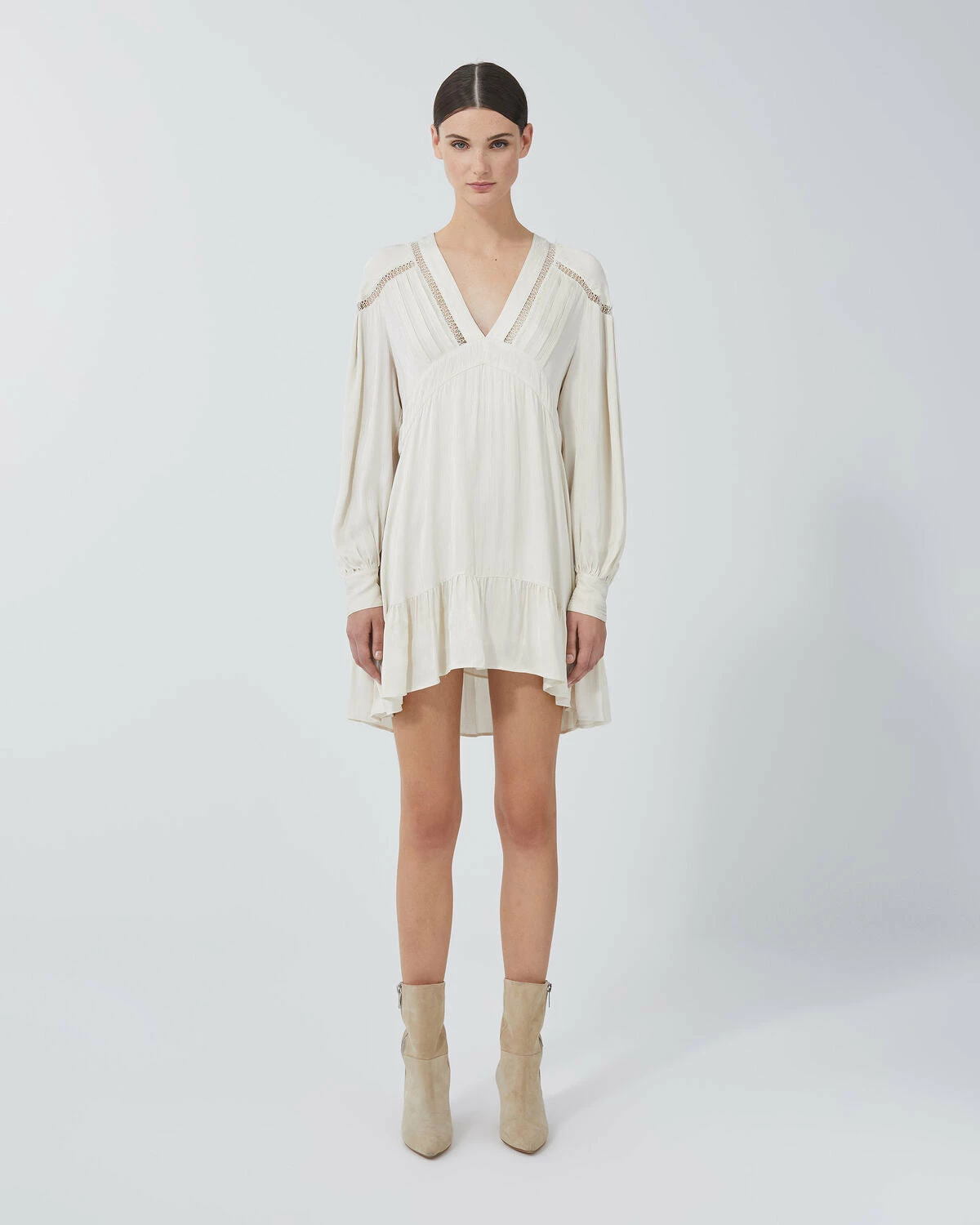 The IRO Bilam Dress in Ecru. A low-cut dress in fluid and airy crêpe de Chine. Featuring Front pleats and lace finishes and billowy sleeves.