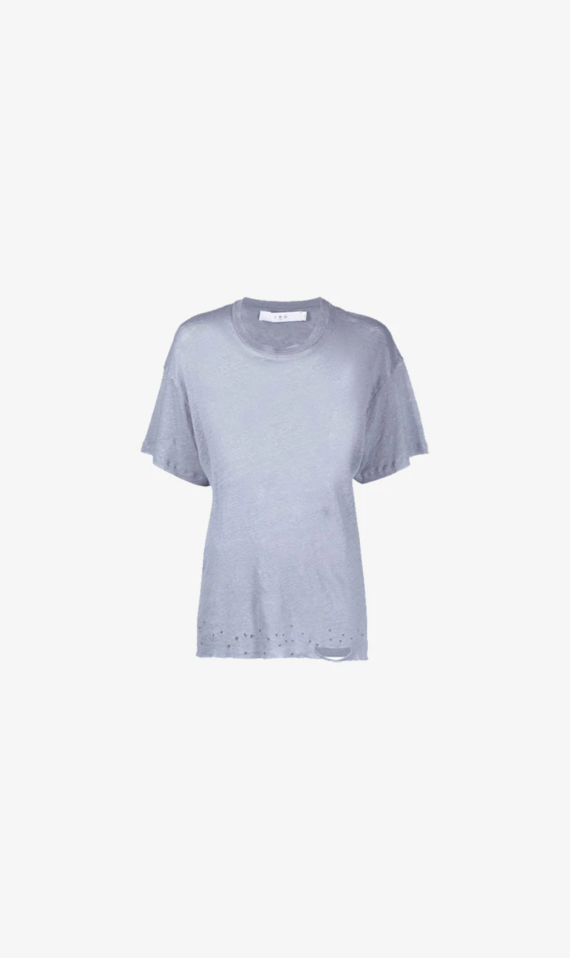 IRO Leena Tee Shirt in Pearl Blue. An updated basic tee style. Crafted from 100% linen for a lightweight handle and features perforated detailing and a raw-cut hem for a subtly distressed aesthetic.