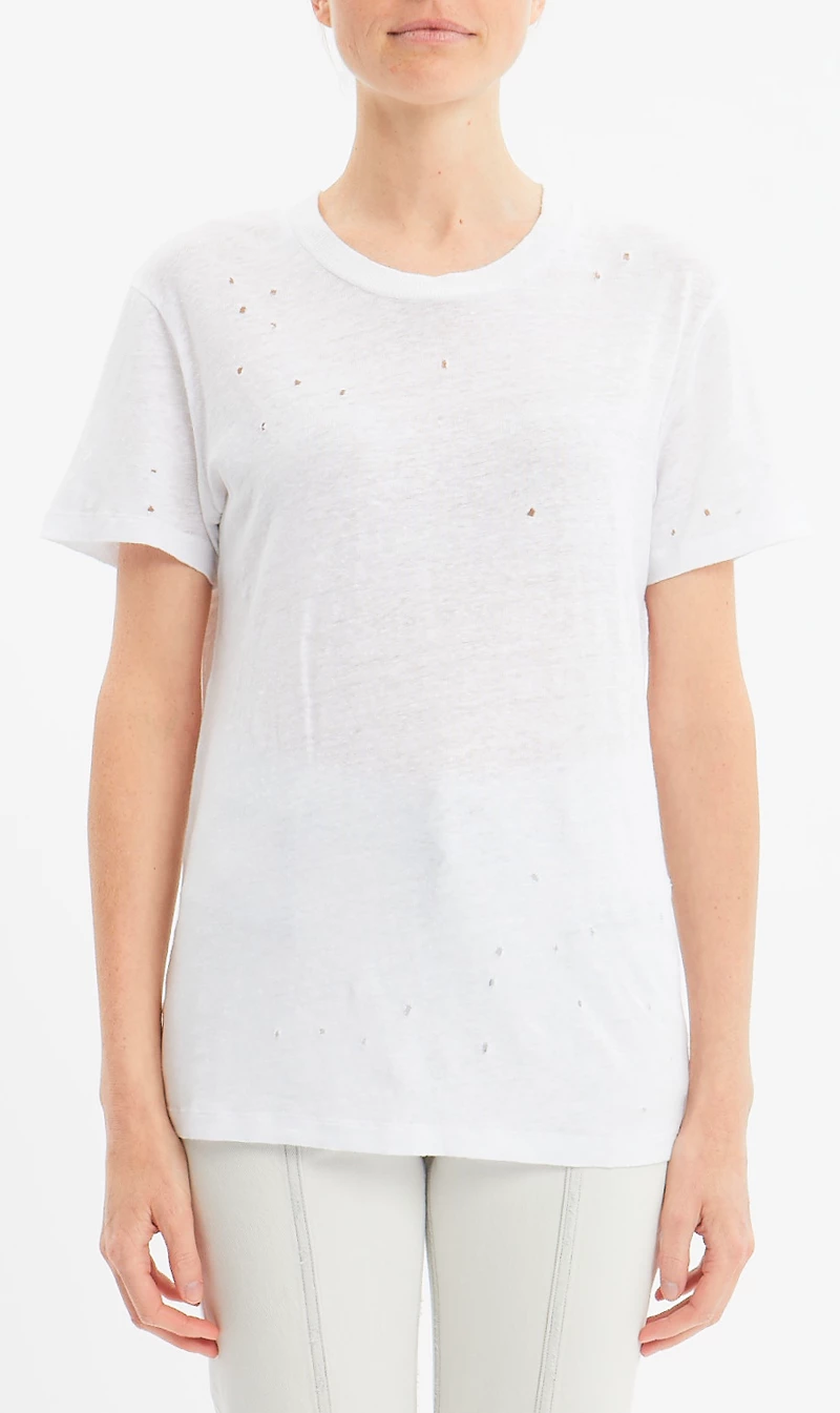 The IRO Leena Tee Shirt in White. An updated basic tee style. Crafted from 100% linen for a lightweight handle and features perforated detailing and a raw-cut hem for a subtly distressed aesthetic.