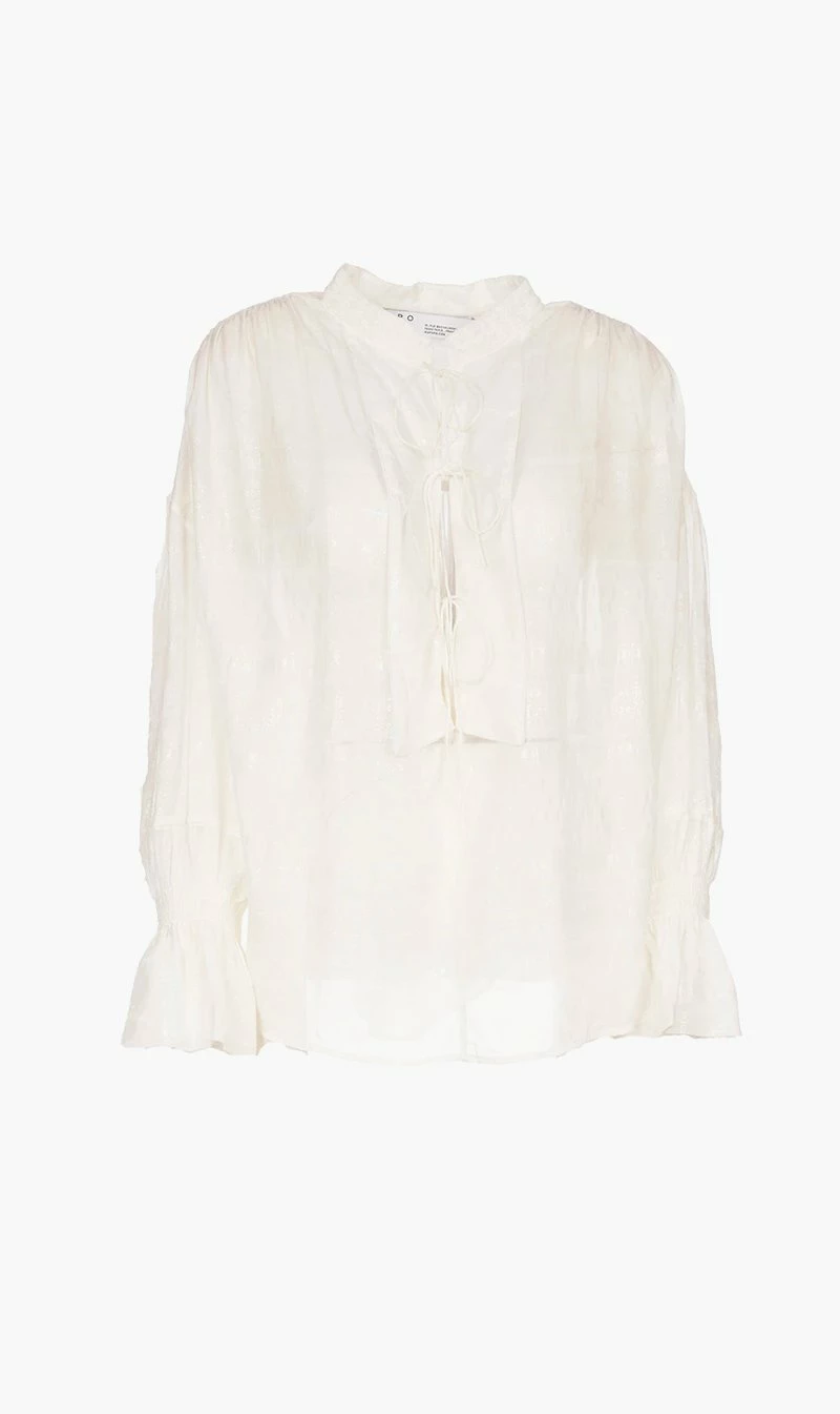 The beautiful IRO Shirana top is a wonderfully romantic, nonchalant top that perfect for pairing with casual jeans or dressy trousers. With tie front, slightly ballooned sleeves, and loose fit, this is a wardrobe must you will have for years.