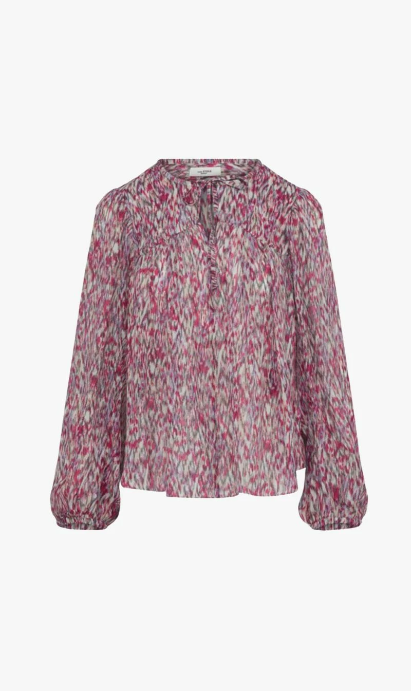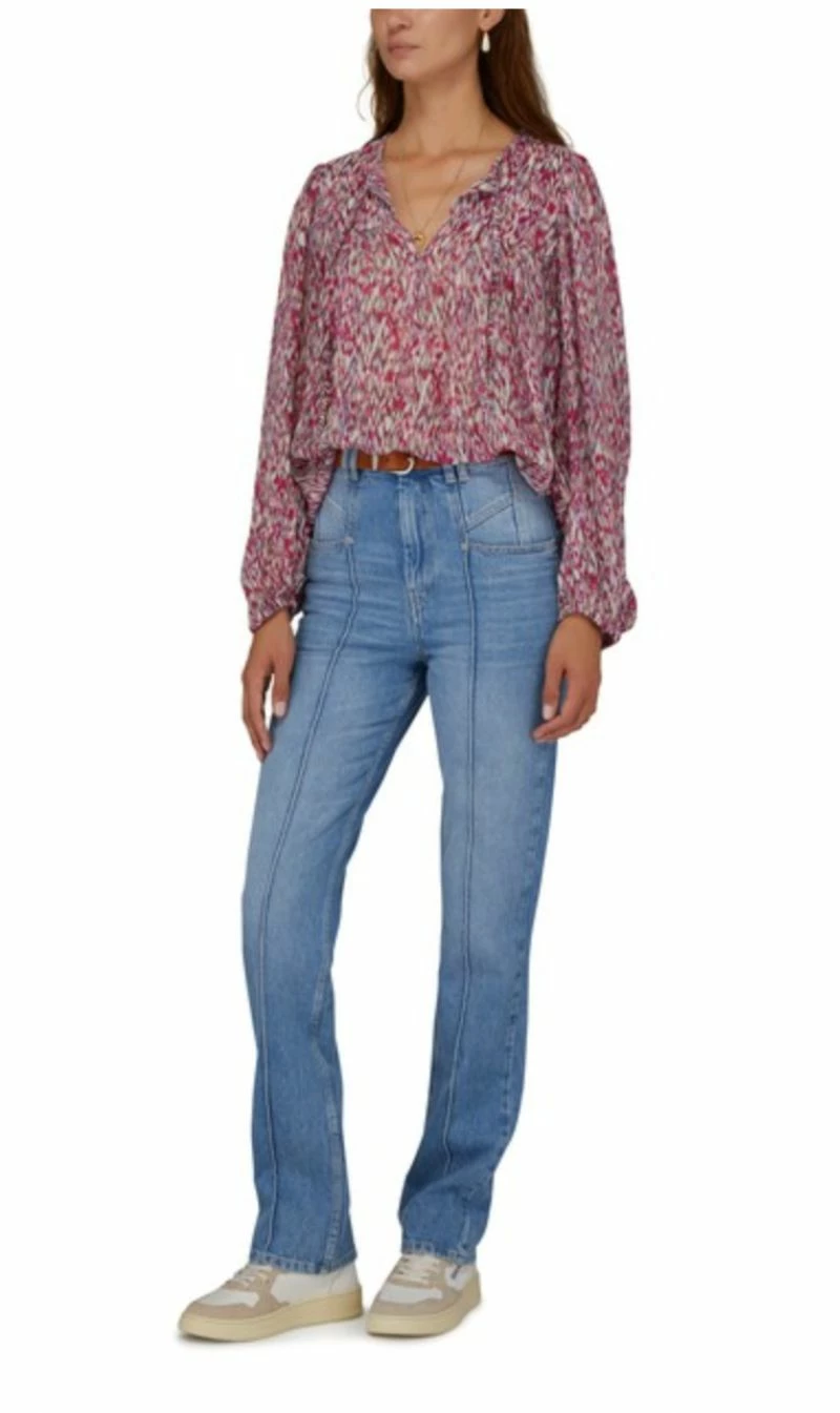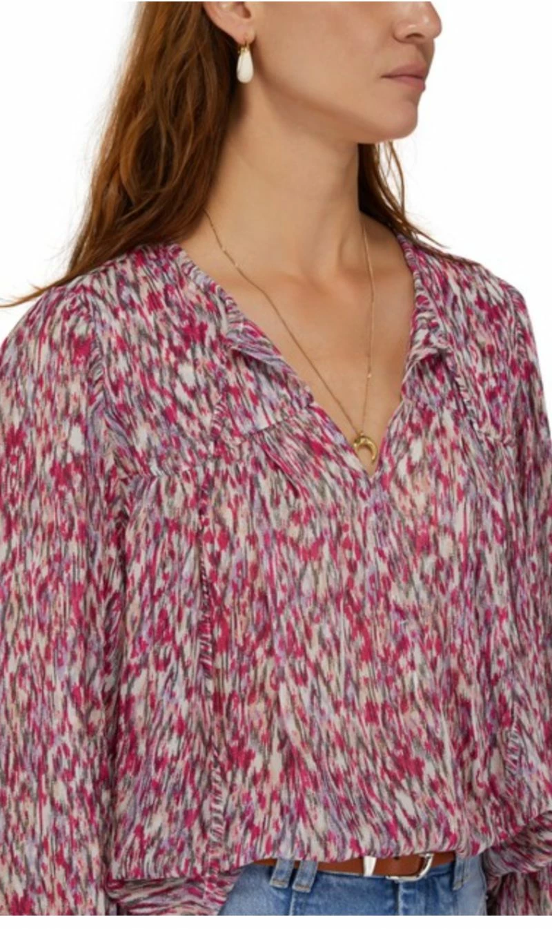 The Isabel Marant Daytonea Top in Raspberry. Features a long-sleeved blouse, buttoned fastening, v-neck, flowing fit, pleated details, multicolor print.
