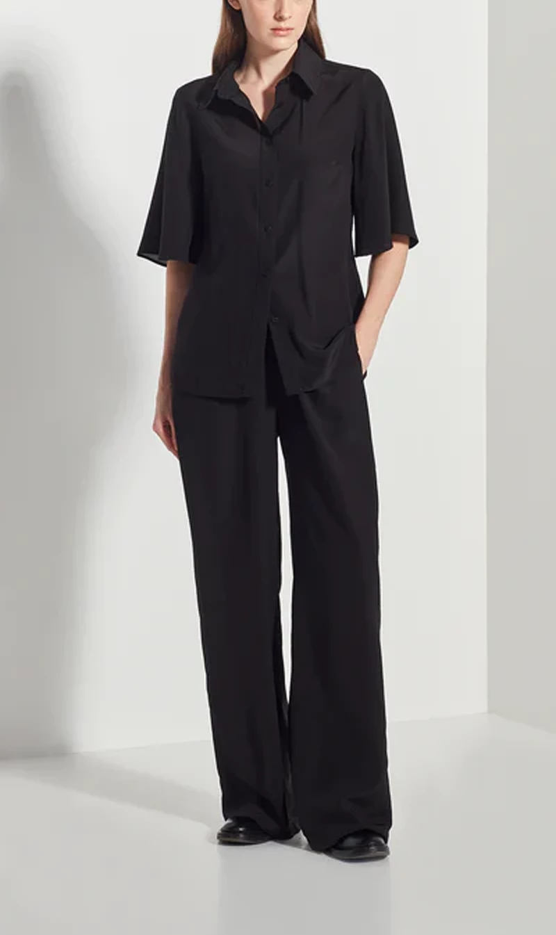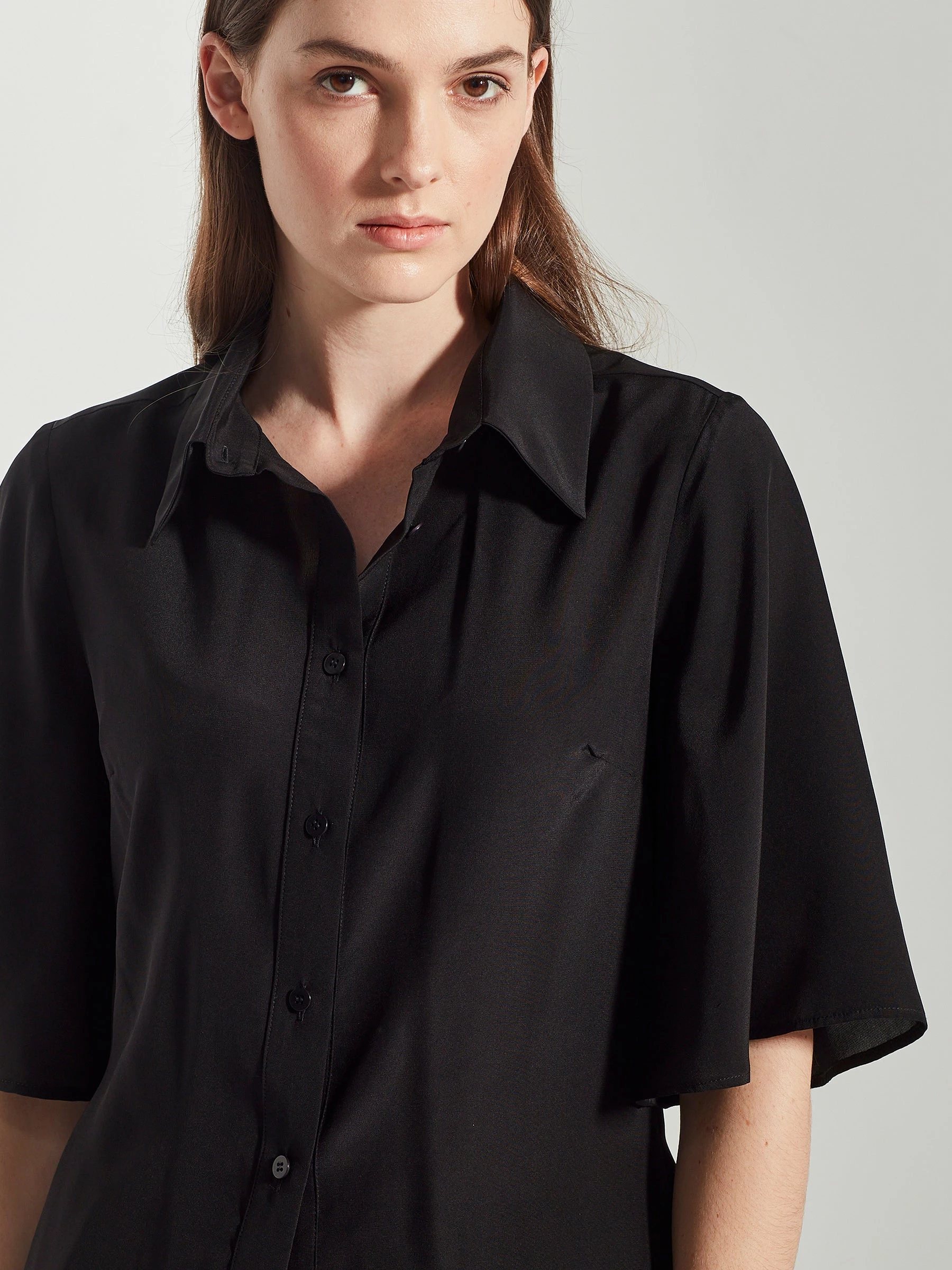The Juliette Hogan Jolie Shirt in Black is a timeless classic that instantly elevated any look. Crafted with 100% Silk, it brings understated elegance to any look. Featuring a shirt collar and flared raglan sleeves, this top is designed to work perfectly with any outfit.