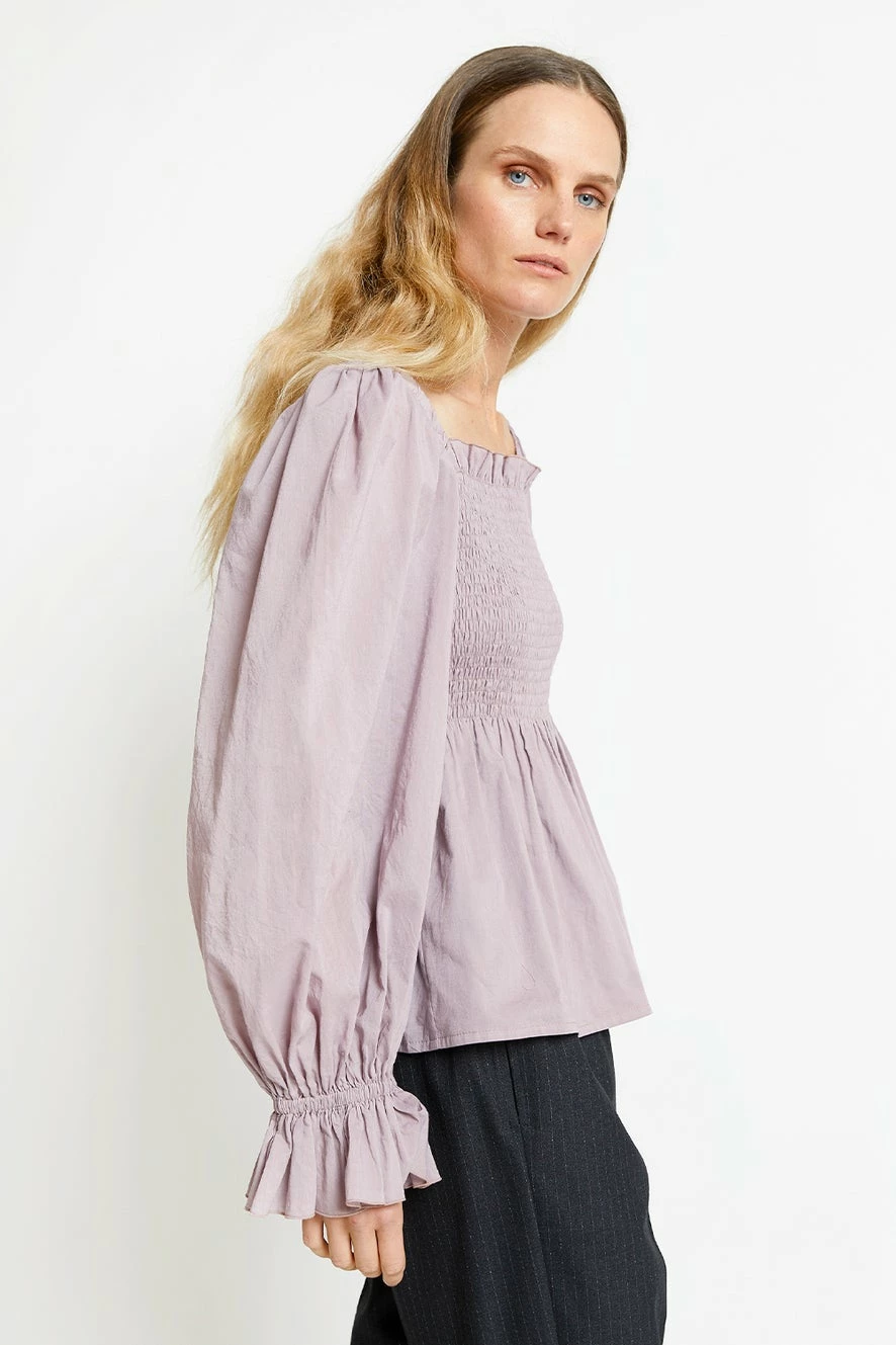 Cut in a light and breezy organic cotton voile, the Altitude Top combines form fitting shirring, statement sleeves and romantic detailing to create a poetic mood. It features an elegant square neckline, a shirred bodice that flows into a relaxed hem and voluminous balloon sleeves finished with an elasticated ruffle cuff.