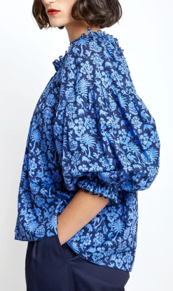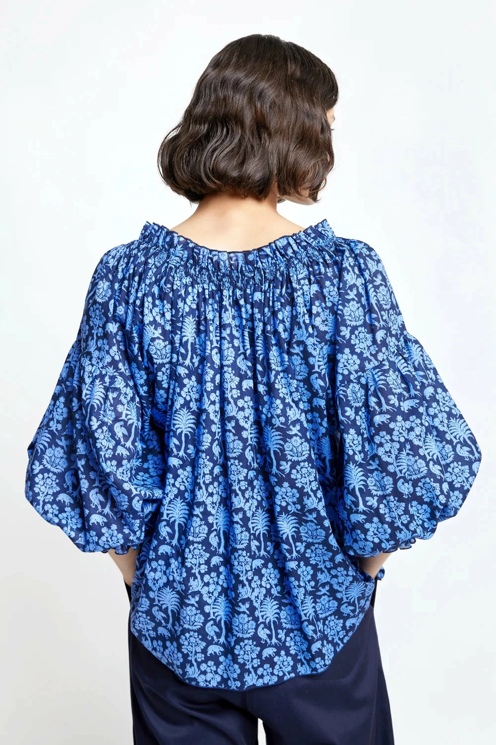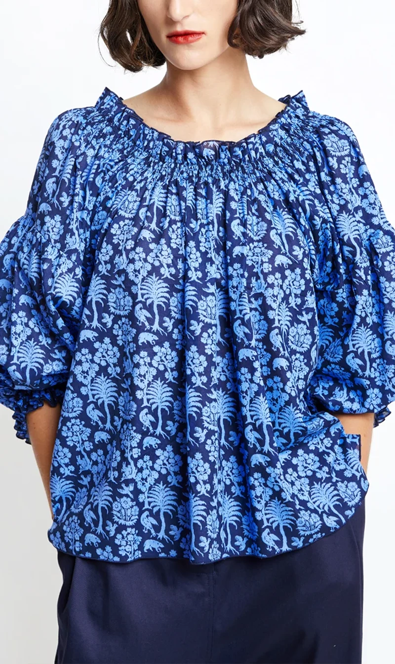 The Karen Walker Antonia Top in Navy/Cornflower is printed with whimsical wildlife that emphasizes the top’s poetic charm. Crafted in a lightweight organic cotton voile, it is a breezy and relaxed summer staple. Designed with billowing sleeved that are nipped at the cuff with elastic to create a beautiful voluminous look. With an elastic neckline, this top can be worn both on or off the shoulders. Pair with your favourite jeans, tailored pants, or skirt to complete the look.