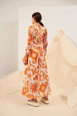 The Kate Ford Elis Cut Out Gown in Orange will add a fun pop of colour to your look. A Kate Ford exclusive hand-drawn print from the Spring Summer 2023 Collection, Divine Domain. A lightweight Ramie dress featuring side cutout detailing with a self-fabric drawstring channel. Wear yours to your favourite events, or simply just brighten your day!Â