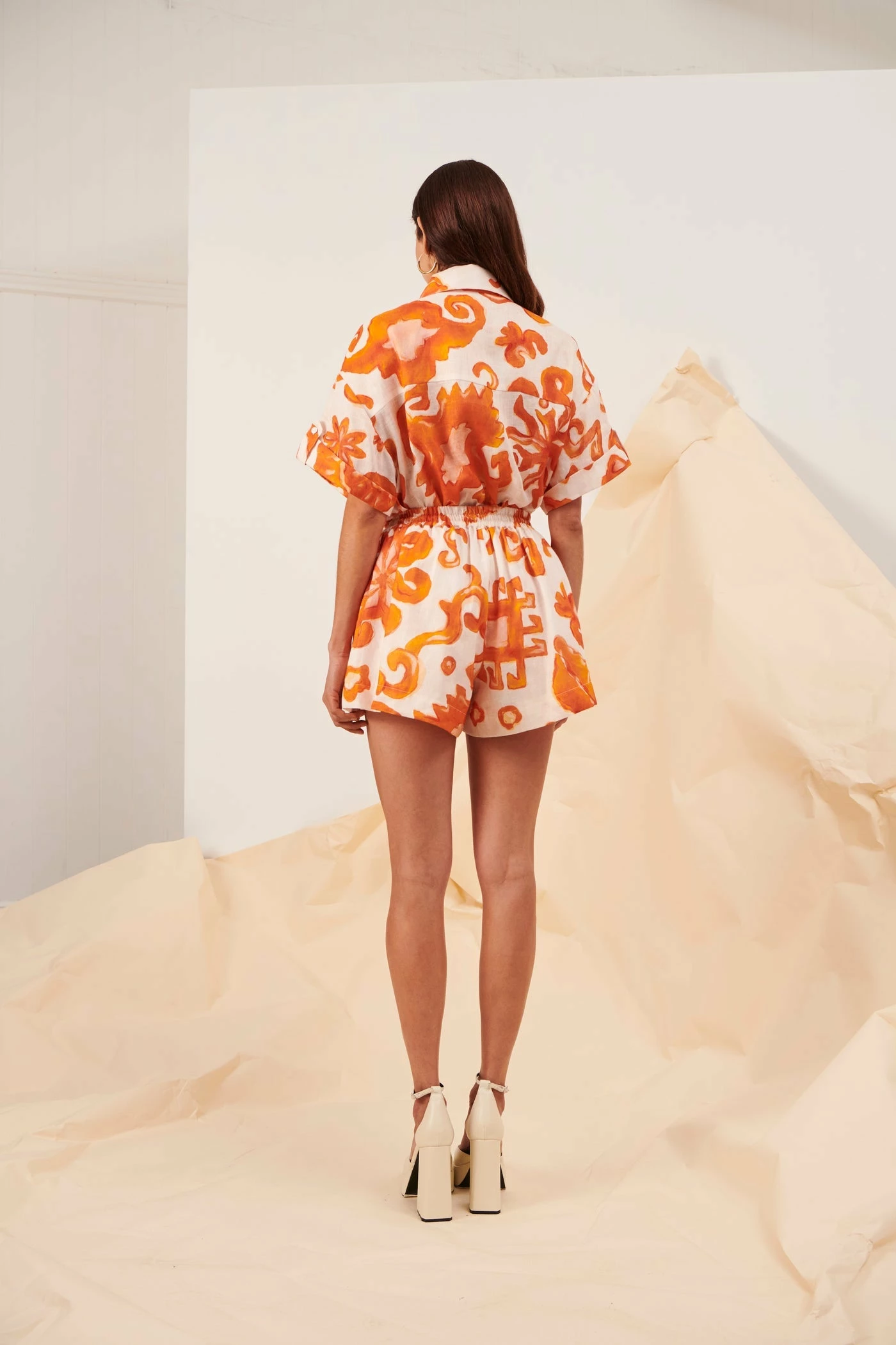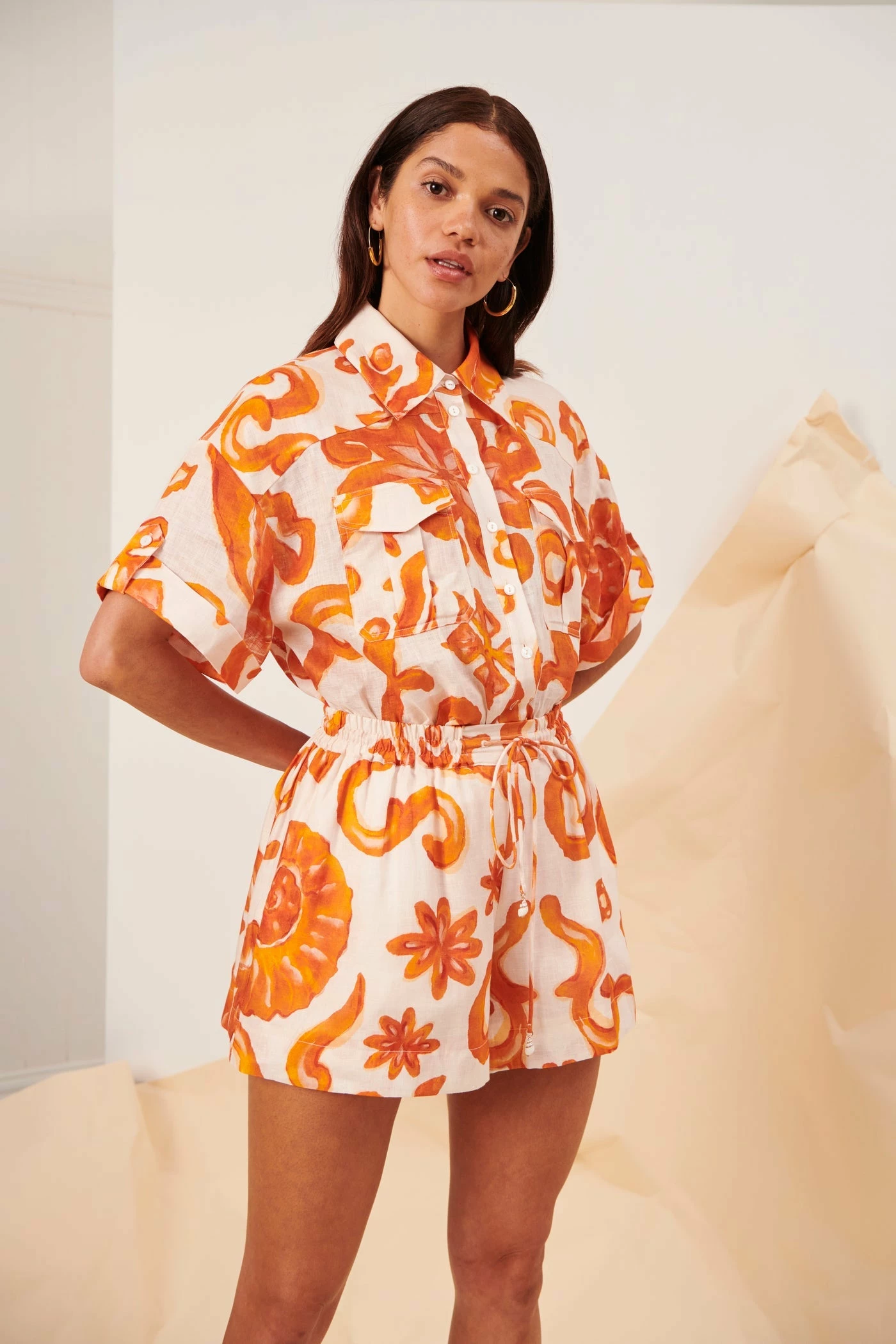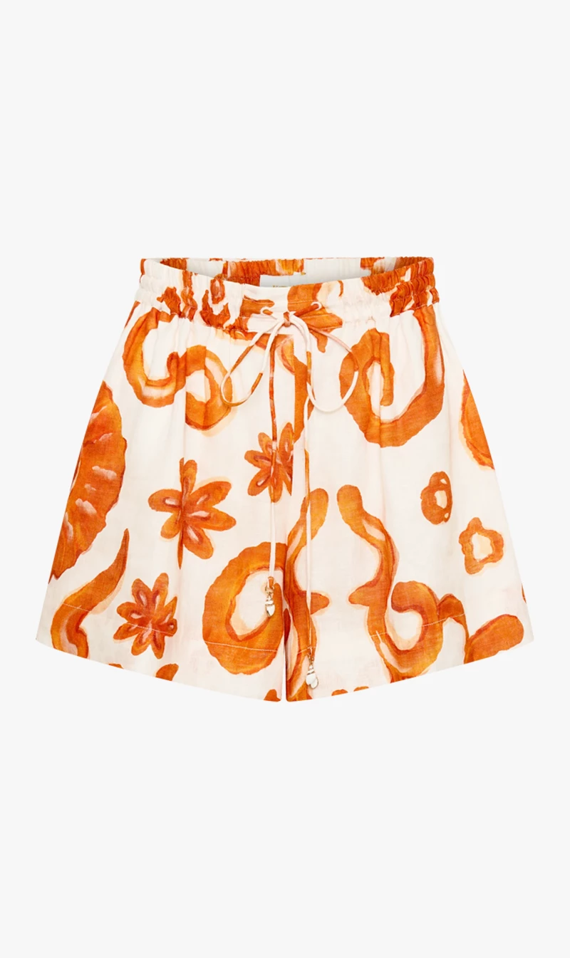 The Kate Ford Elis Flow Shorts in Orange will add a fun pop of colour to your look. AÂ Kate Ford exclusive hand-drawn print from the Spring Summer 2023 Collection, Divine Domain. A lightweight Linen shorts featuring a small shell toggle with o-ring detail. Wear yours to summer social events, or simply just to brighten the day.Â