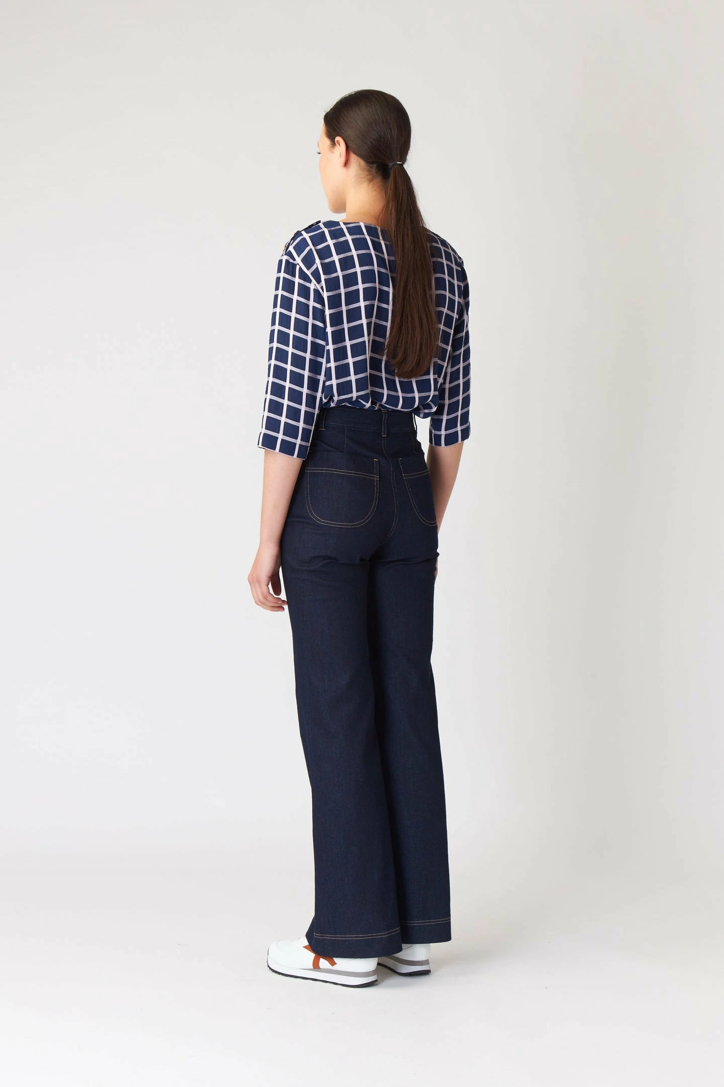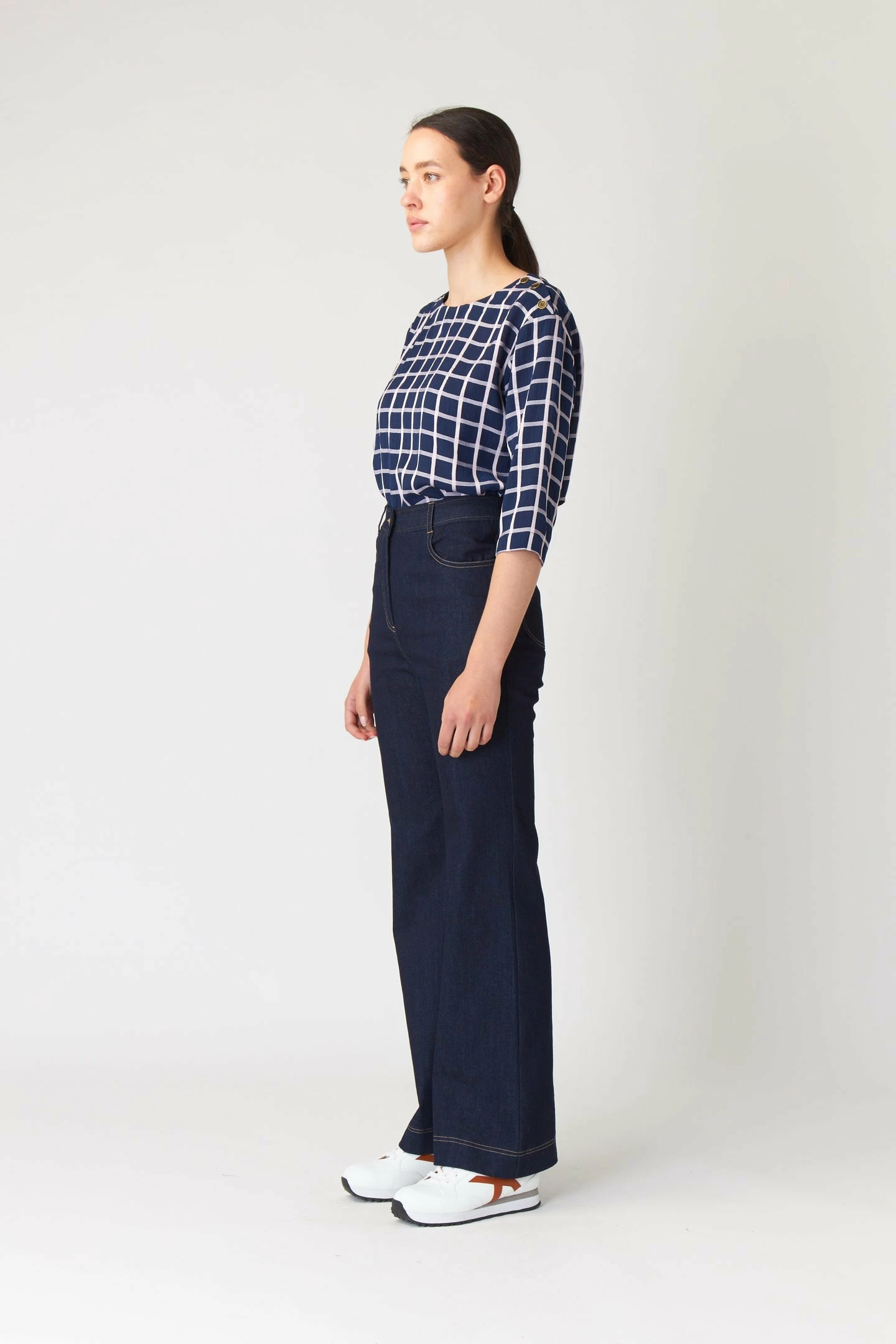 The Sylvester Check bateau top is a relaxed-fitting, boat-necked style with an elbow length sleeve, and features button detailing on the shoulders. Sitting just above the hip, it is perfect paired back with Denim or Utility styles for daytime ease.Â