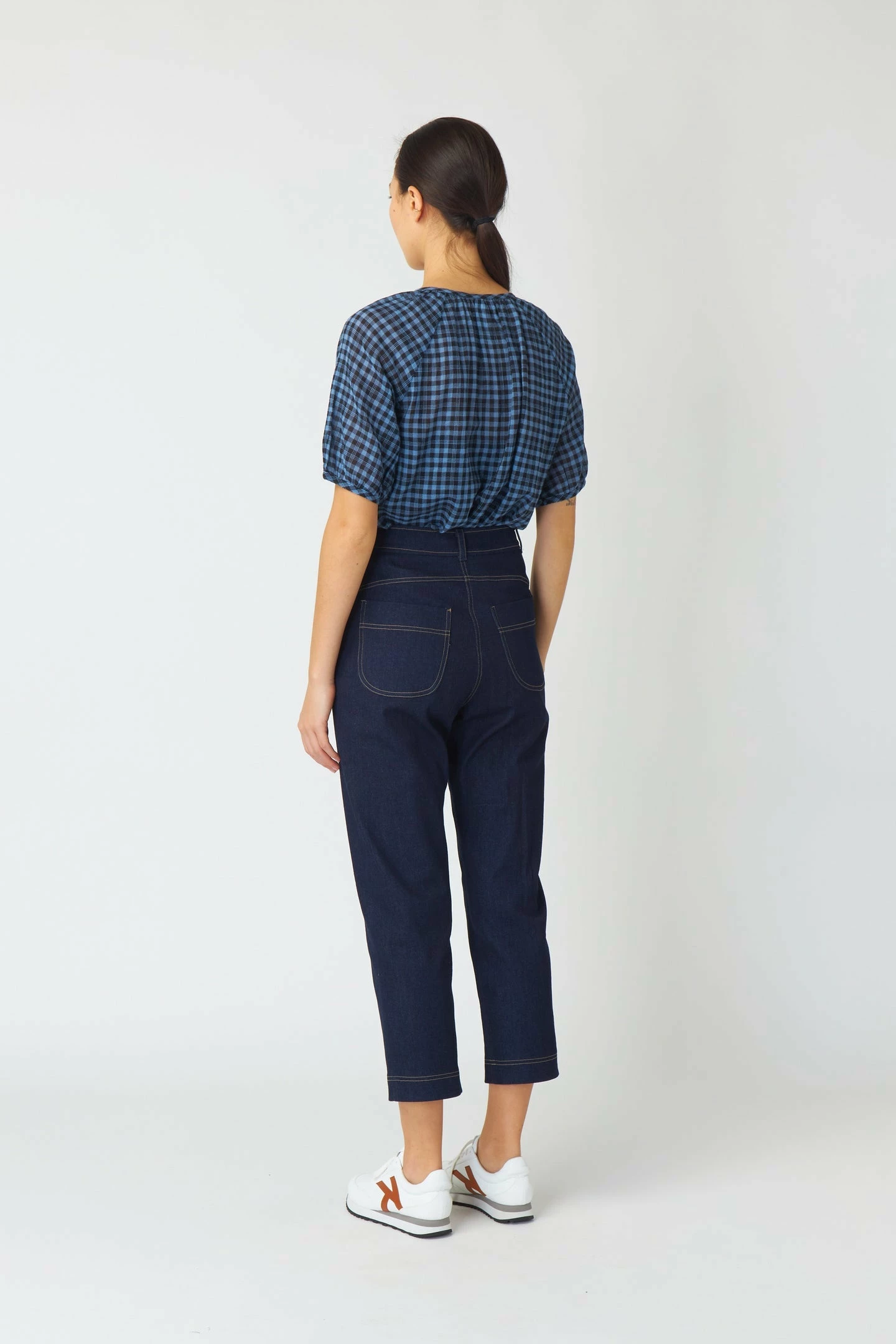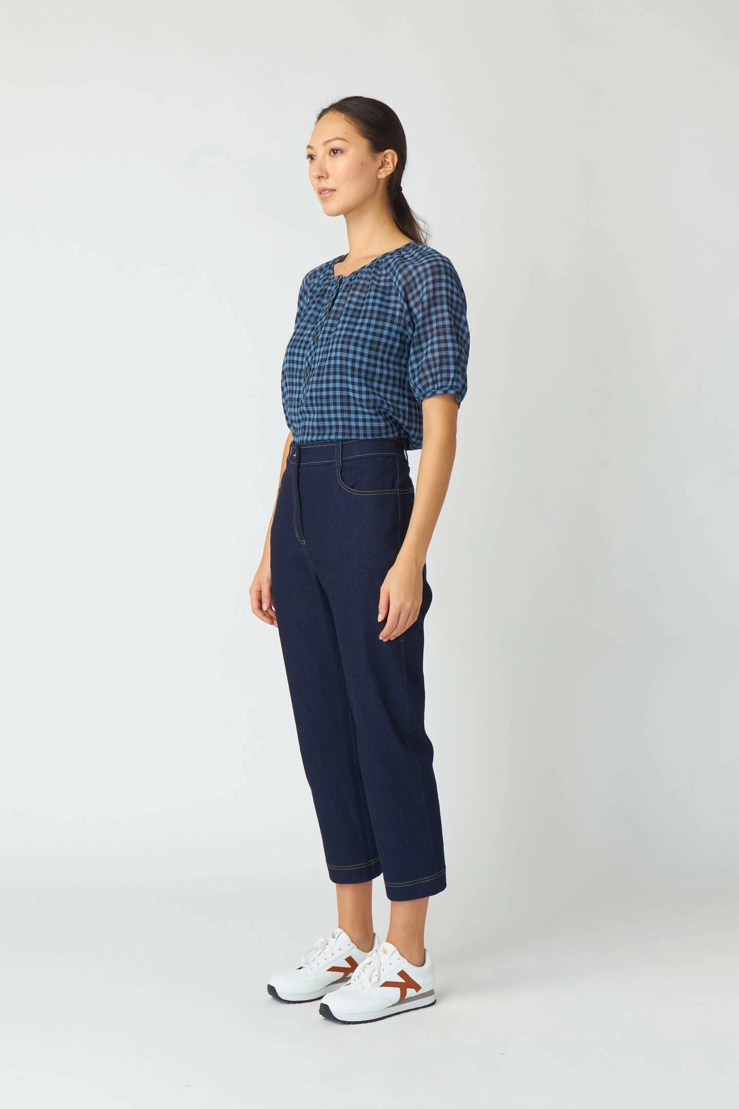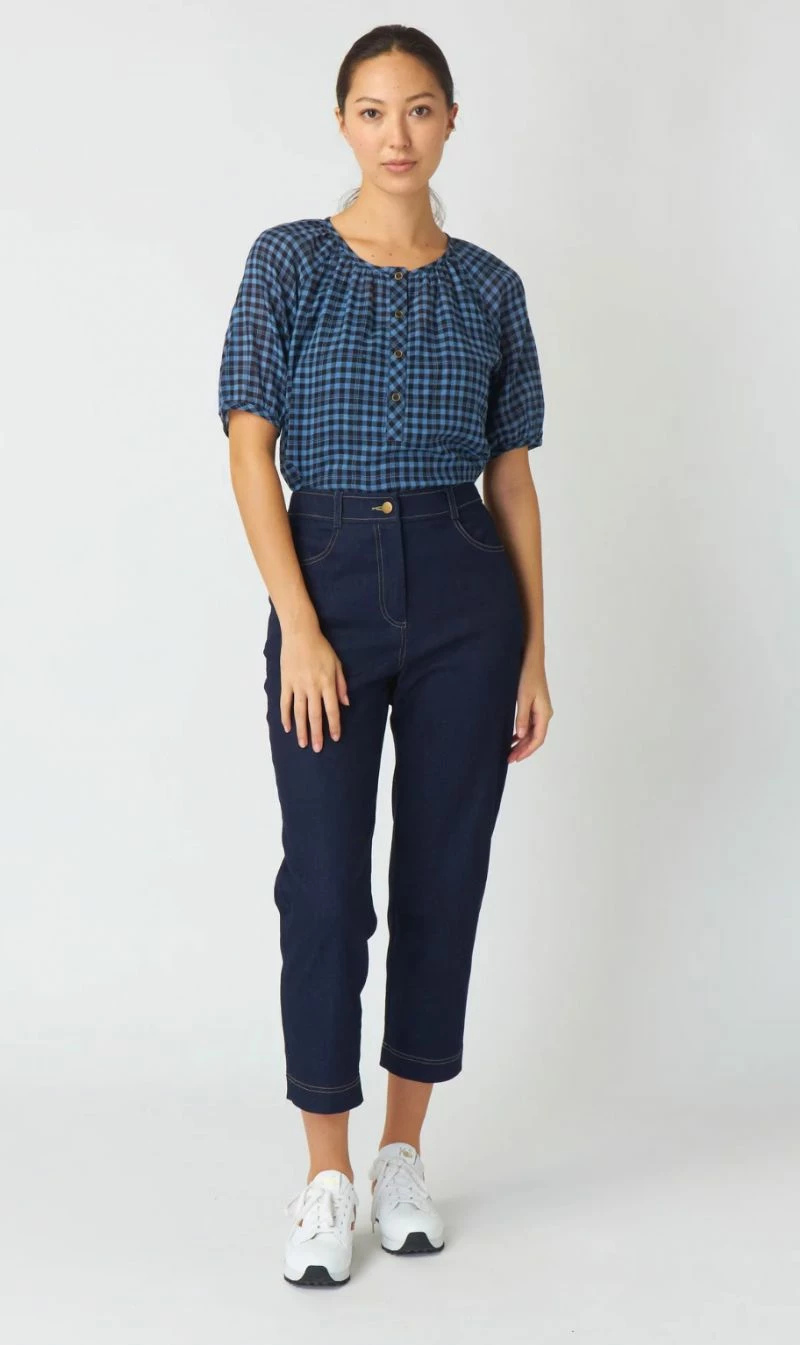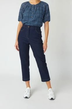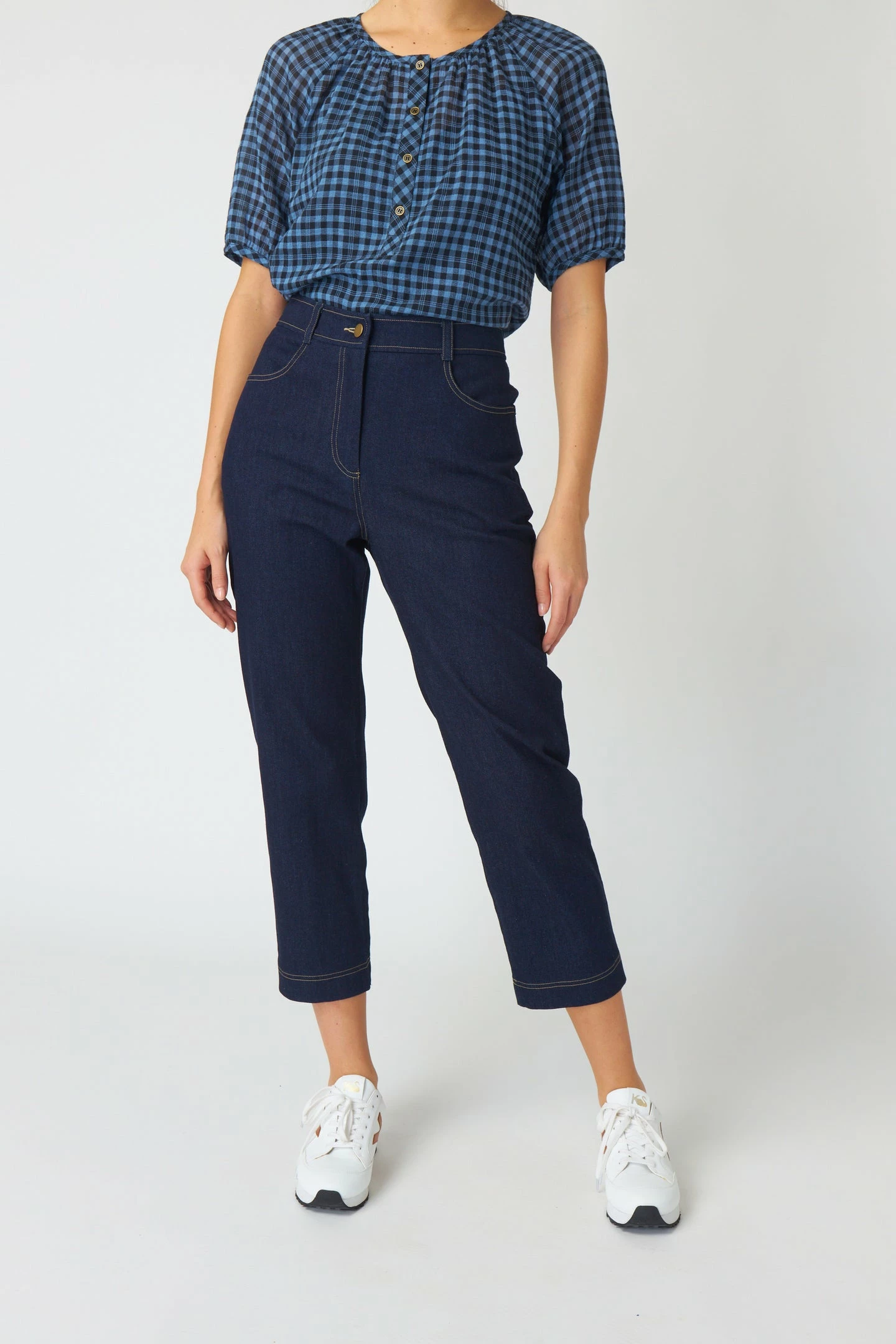 The Denim cropped trouser by Kate Sylvester is a classic straight leg trouser with a fitted waistband, contrast stitch detailing, flattering mid-rise cut and cropped length.