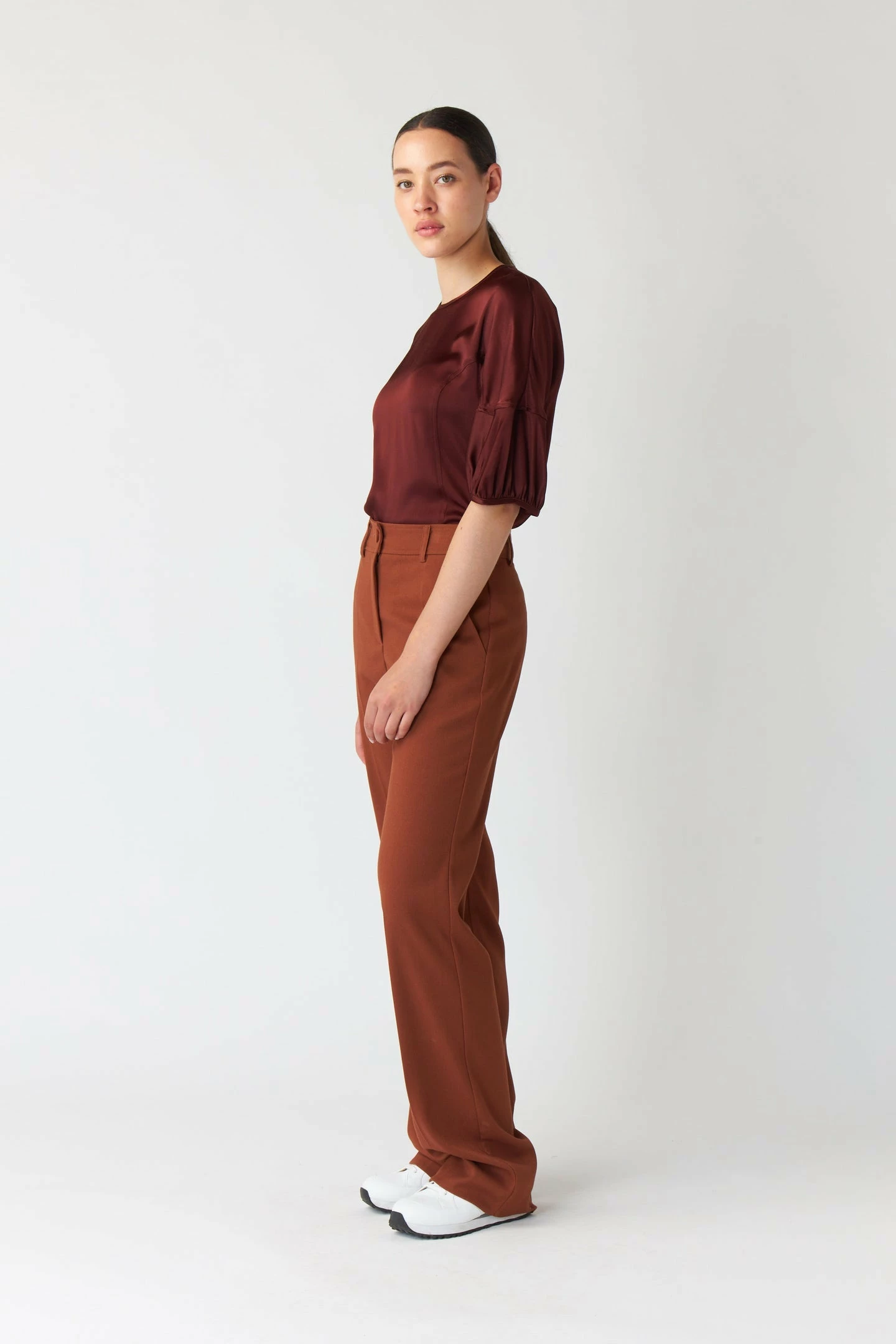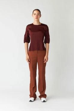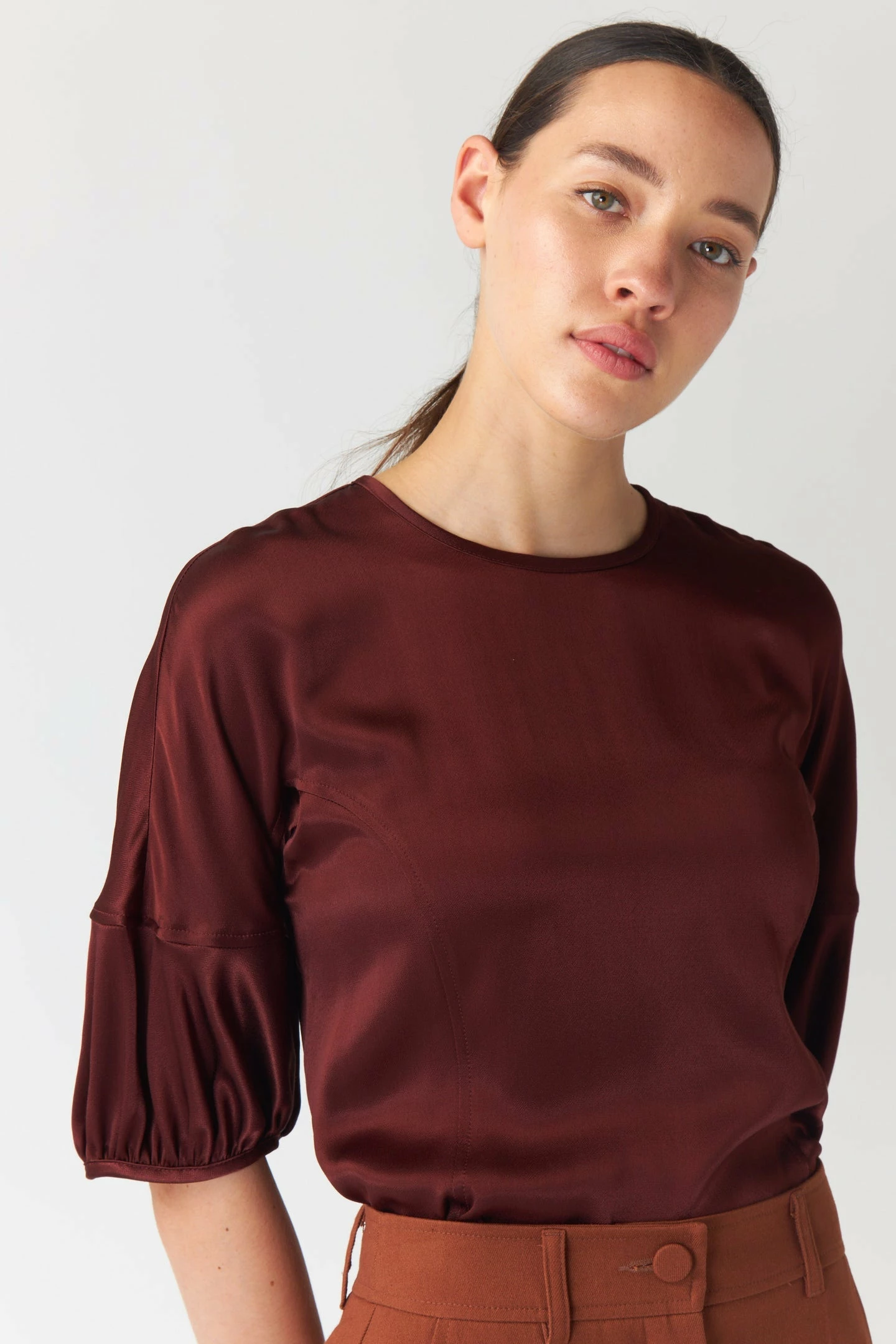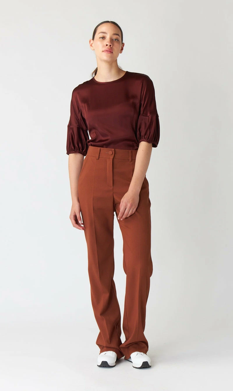The Lara top by Kate Sylvester in beautiful viscose satin crepe is fantastic paired back with classic suiting for effortless luxe. Made in New Zealand, it has a bound round neckline and features princess panel detailing with sleeve falling in soft gathers from an exaggerated drop shoulder. Sits just on the hip.