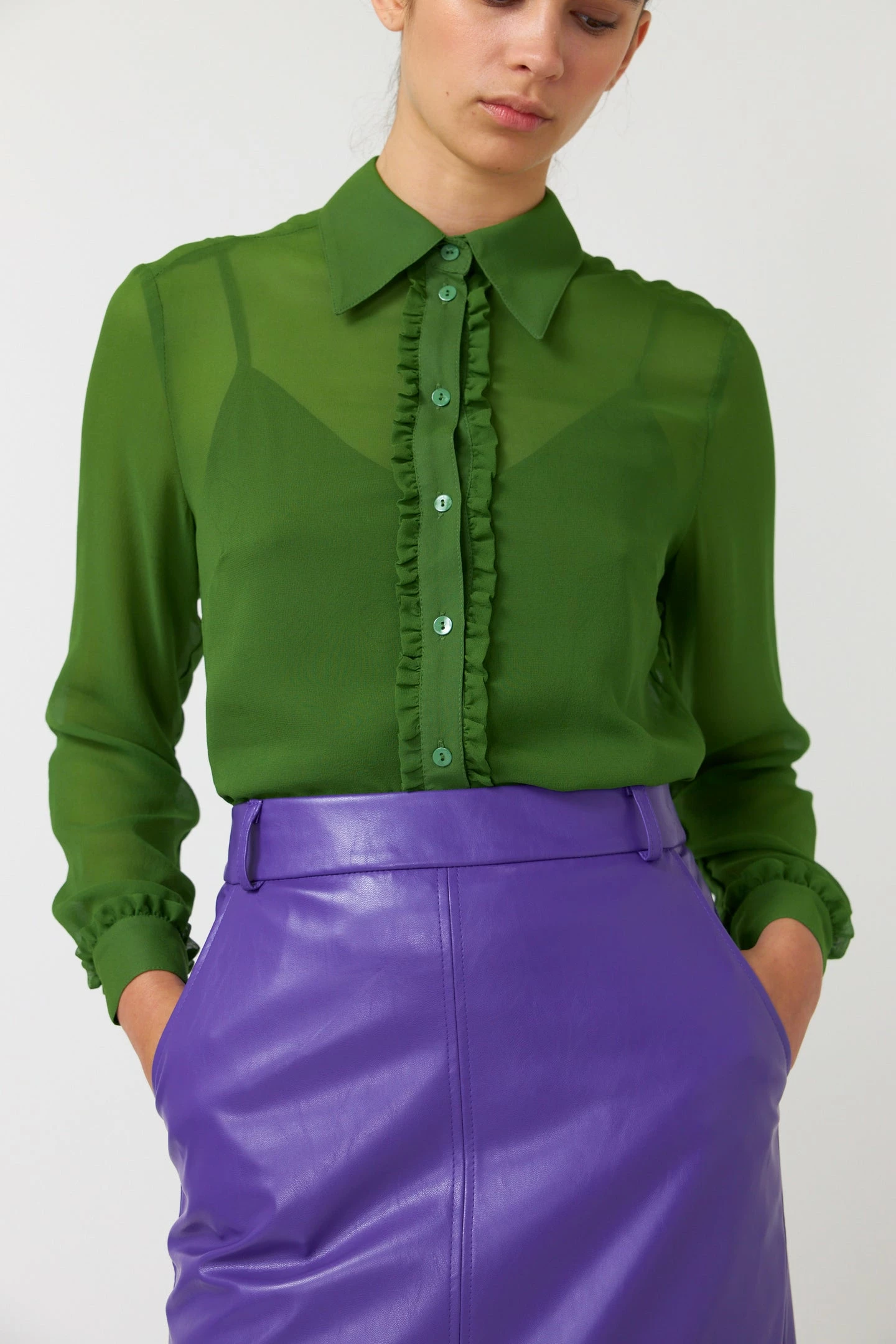The Kate Sylvester Valetta Shirt in Grass will be the wow piece to any look. Made in New Zealand in beautiful silk georgette, and features a button-through front with ruffle detailing. Pair this versatile piece with anything from denim to a skirt for an elevated look.