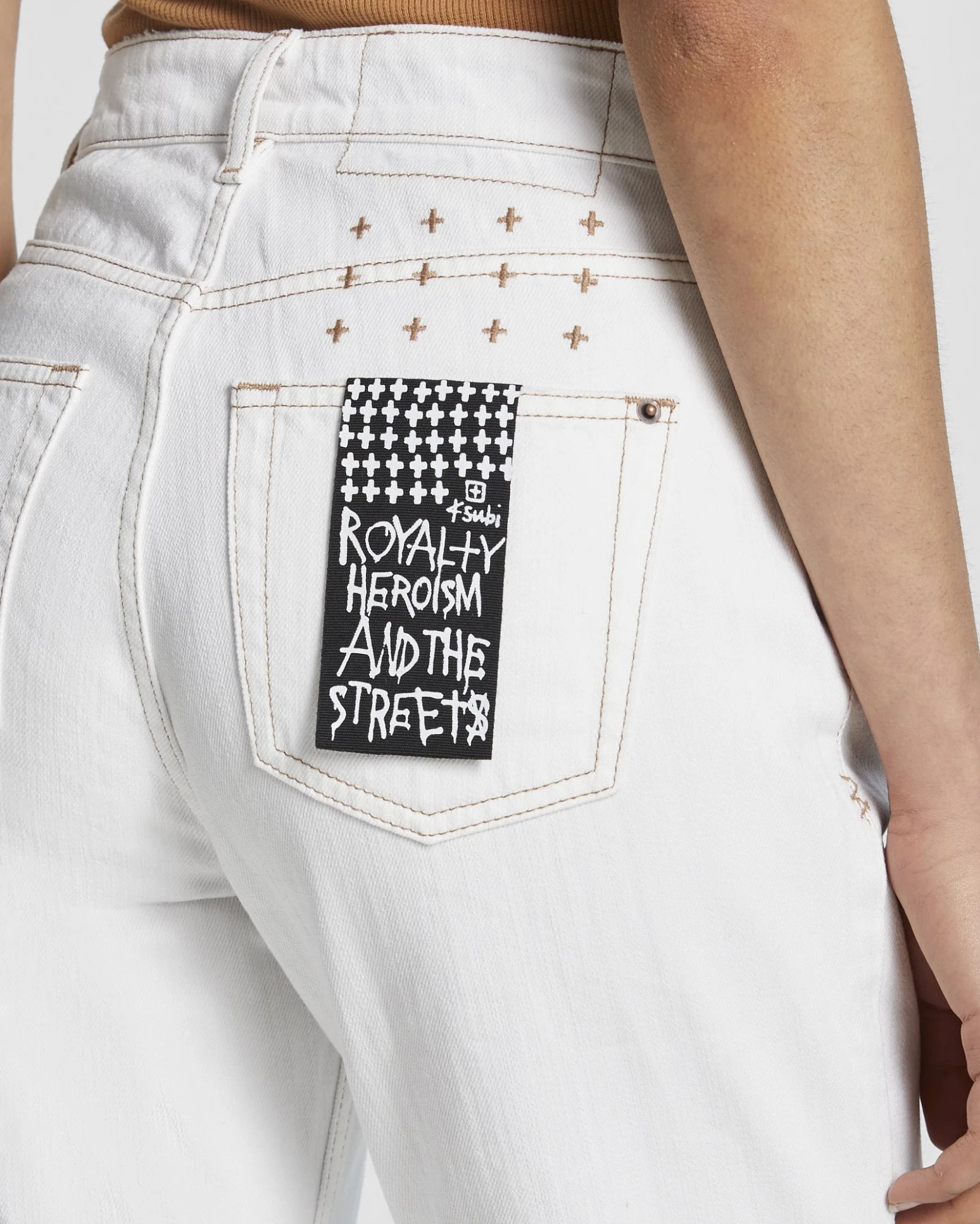 The Ksubi Nine O in Sugar Rush is a slim cigarette fit jeans with high rise waist and crop length. It features classic five pocket detailing, copper hardware, Ksubi T-box print and back cross embroidery.