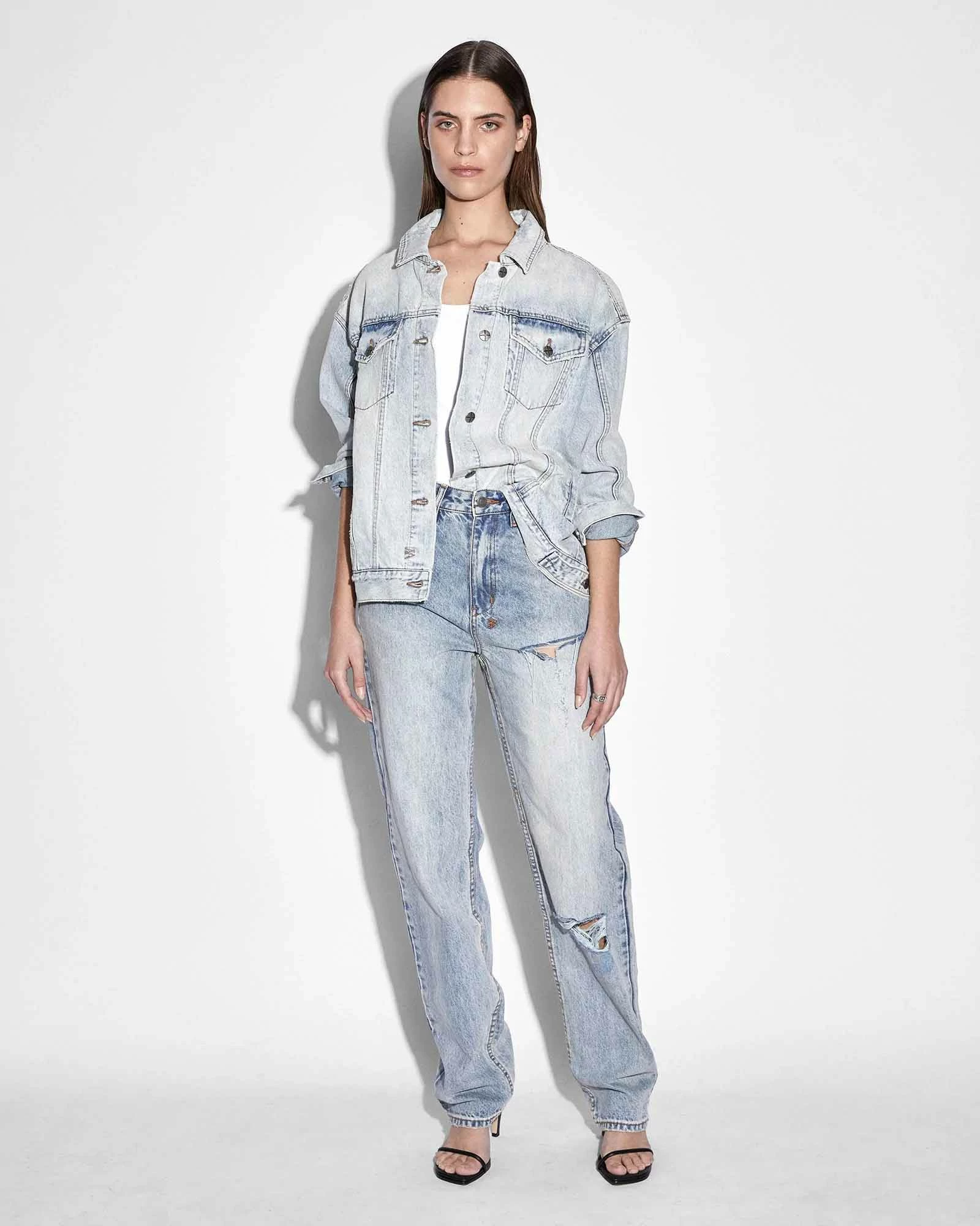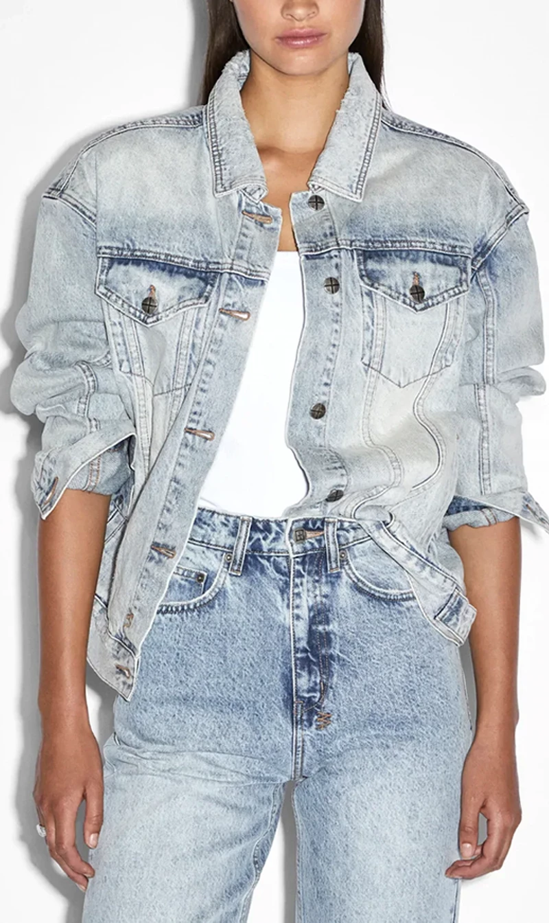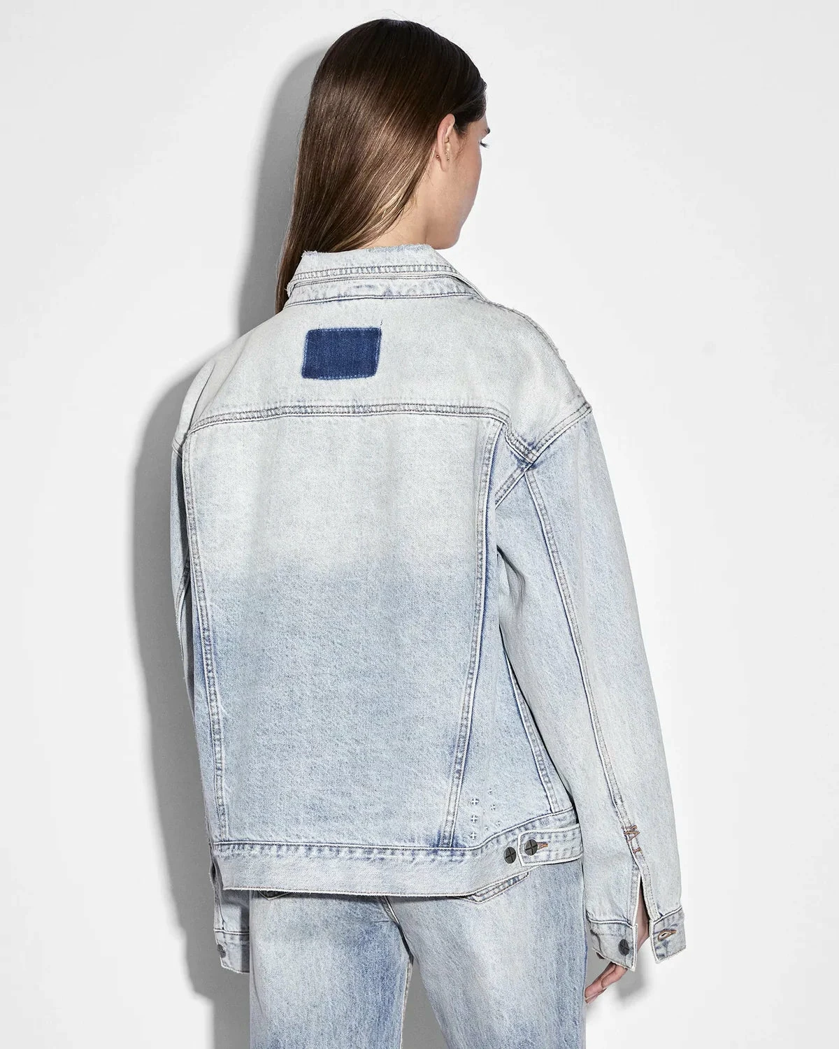 The Ksubi Oversized Jacket in Karma is a modern take on the classic denim jacket. Crafted with rigid denim in a light stonewashed blue colourway, featuring a relaxed loose trucker fit and signature branded detail. This will be your go-to denim jacket for all occasions.Â