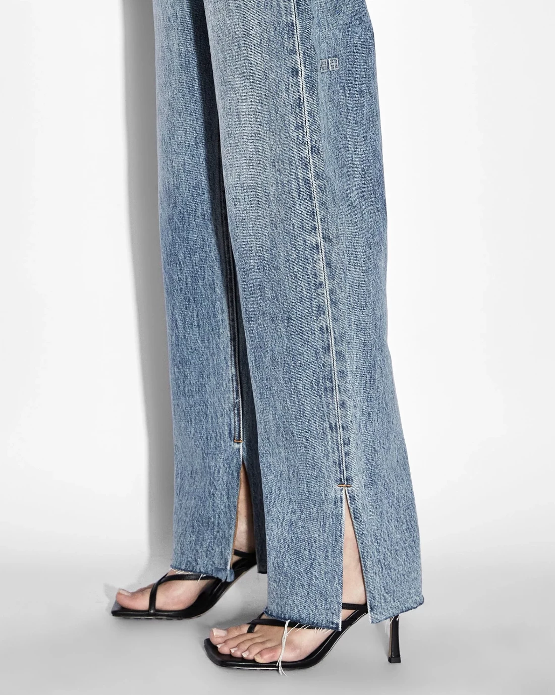 The Playback Haven Splits from Ksubi is constructed from premium rigid denim in a washed mid-indigo colourway with a raw-cut hem designed to fall over the shoes. This style features a relaxed straight-leg fit, a high waist, classic five-pocket detailing, a zip fly, and Ksubi branding.