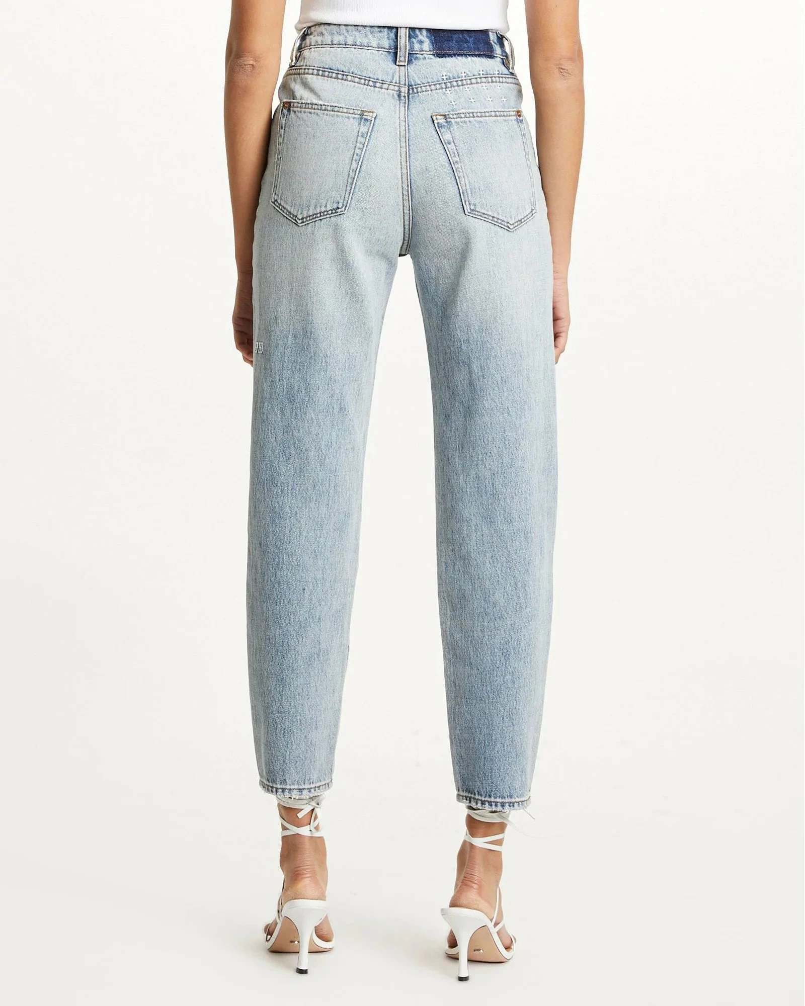 The Pointer by Ksubi is a high wasted relaxed leg jean which neatly tapers at hem with classic five pocket styling. Made from a premium rigid denim in mid-blue wash with stone wash and light contrast wear. It features Ksubi T-box print and cross embroidery.