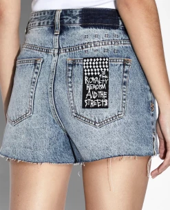 The Rise N Hi Shorts Haven Repair from Ksubi are a high-waisted cut-off short constructed from premium rigid denim in mid-blue washed indigo colourway. This style features a raw hem, five pockets, a zip fly, side splits, and classic Ksubi branding.
