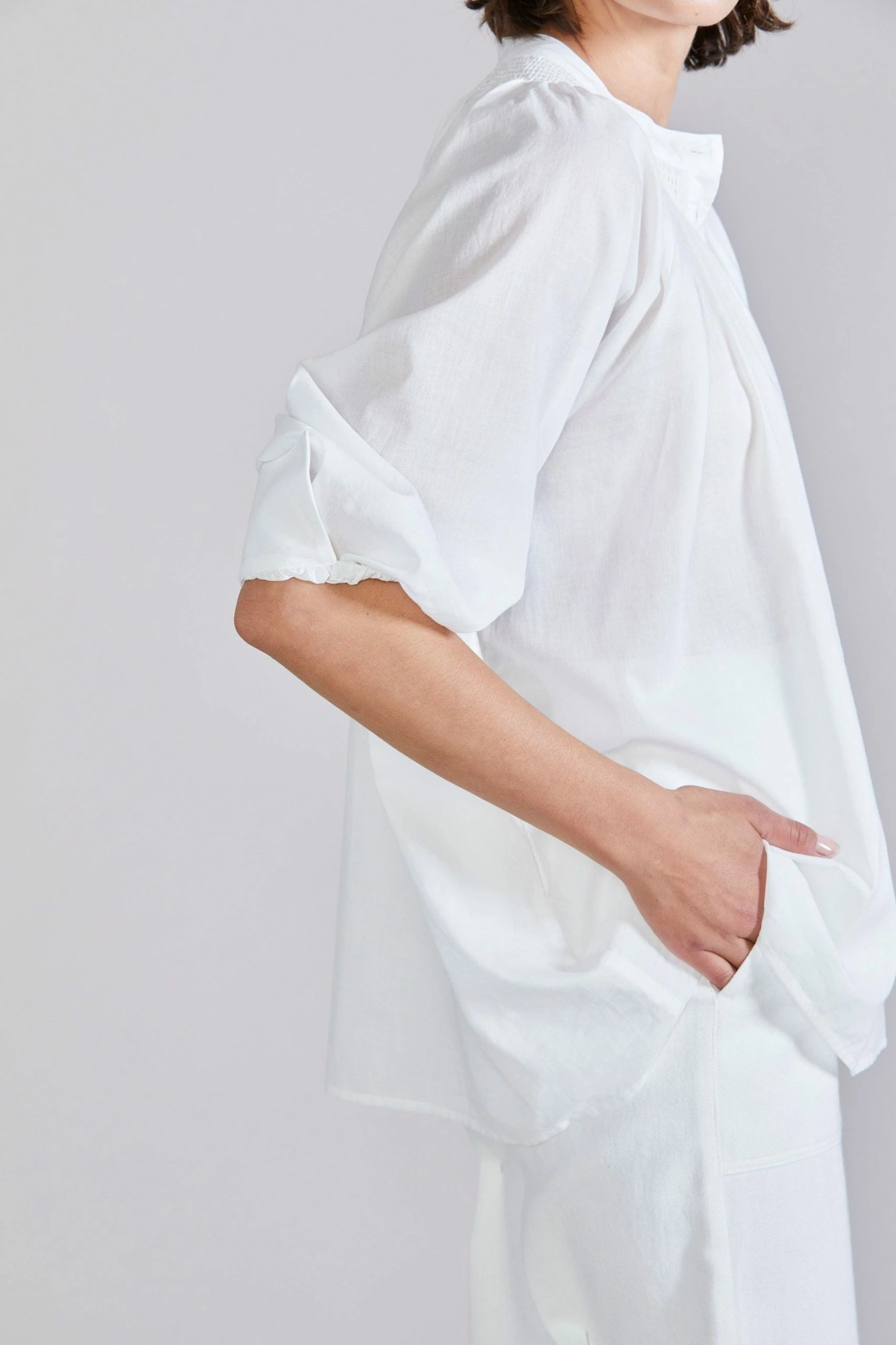 Understated yet feminine, the Ellie Blouse from Laing is a quintessential summer piece. Crafted from 100% cotton voile, the Ellie is ever-so-sheer, with elegant pintuck detailing at the neck with a half cuff feature at the elbow length sleeve.Â