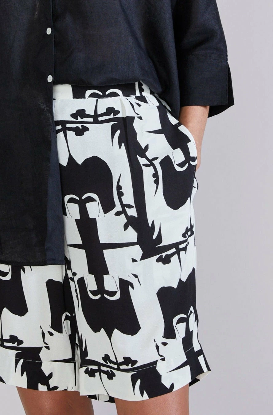 The Laing Scout Short is a relaxed style short in the brand’s limited edition print with Walker & Bing. Cut from a crepe-style blend of fabric that has a beautiful drape, these shorts sit just on the knee and are an easy, everyday pull-on style with a flat front and half-elastic waist and are finished with deep side pockets. Pair with an elevated sandal and black cami for an off-beat evening look.Â
