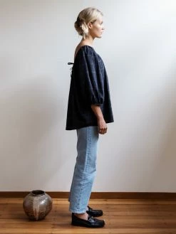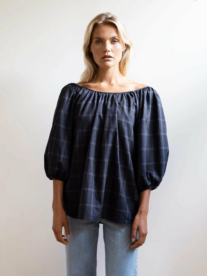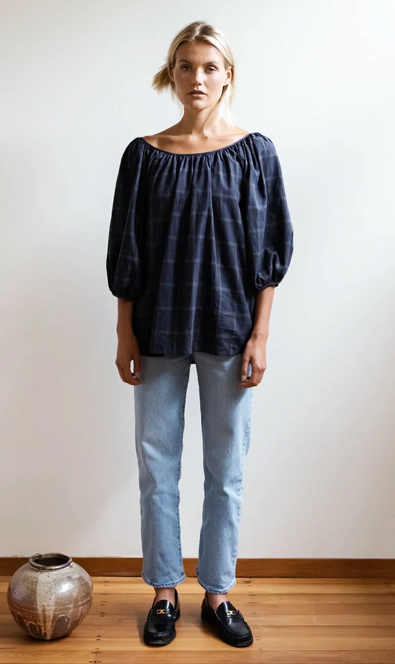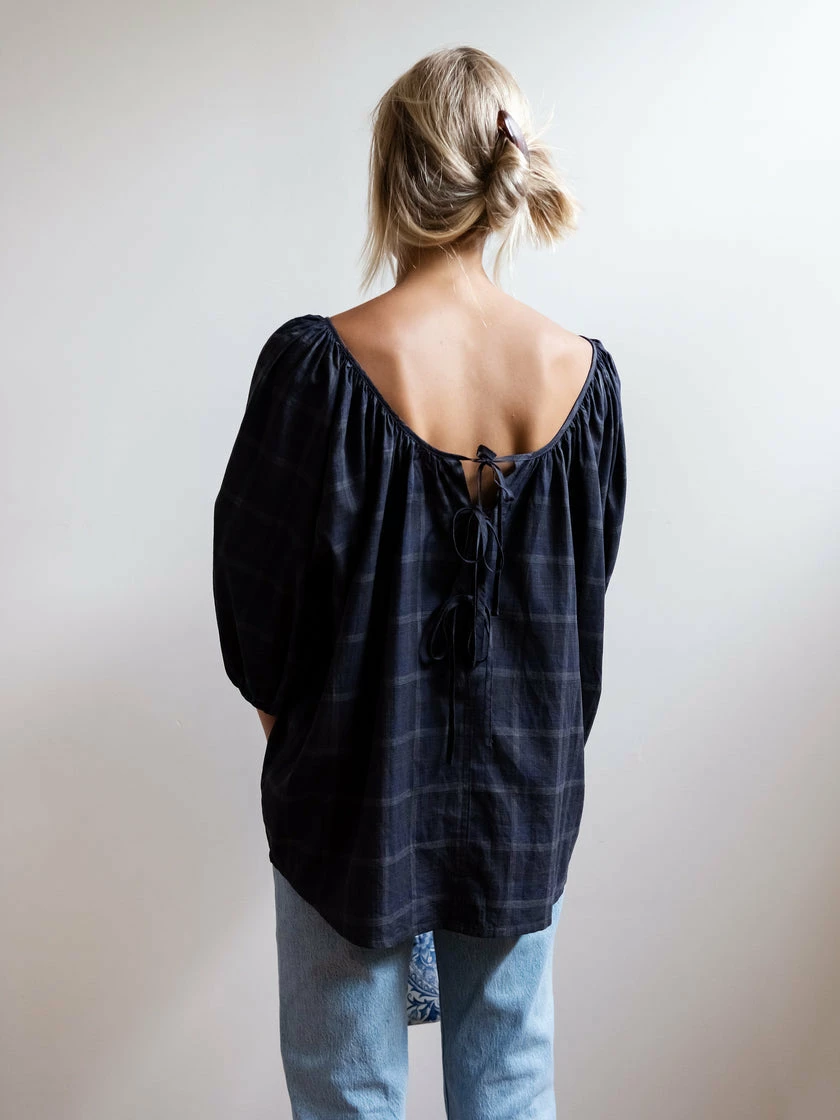 The Mahsa Ballet Blouse in Yarn Dye Check Ink. An evolution of the Ballet O’Keeffe Dress, the Ballet Blouse is a gracefully simple piece that draws attention to the collarbone and curve of the neck into the shoulder. Featuring a lightly gathered scoop neckline and 3/4 sleeve, the back dips to mid-upper spine and is finished with fine binding and triple-tie detailing. Made in the softest cotton for everyday comfort and ease.