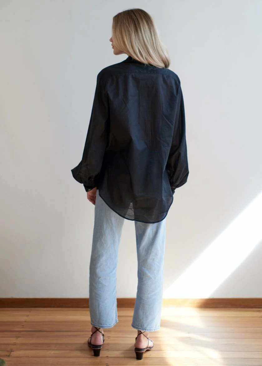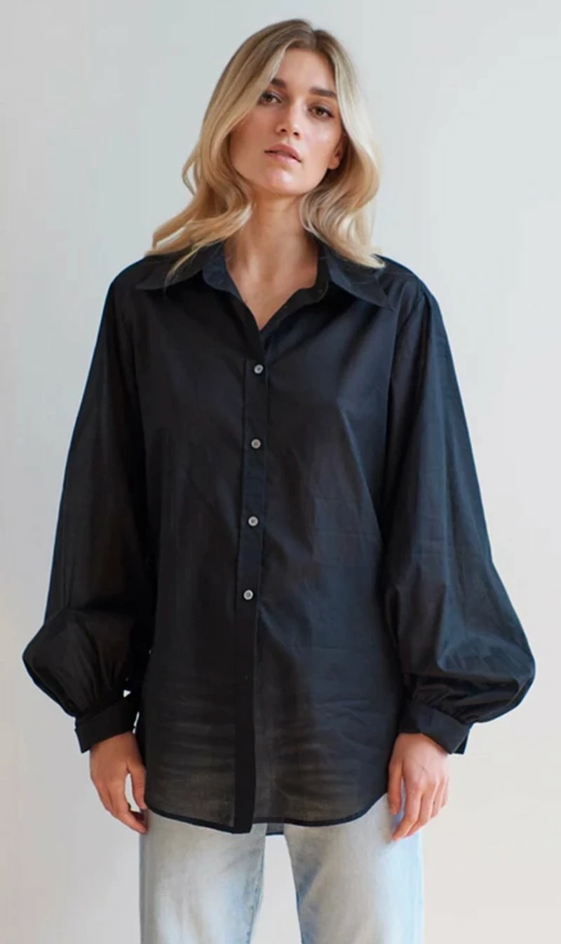 The stand collar and cuffs say ‘serious business’, but the billowing sleeves and trailing length whisper ‘and later, the dance floor awaits’. Masculine meets feminine in this classic men’s button-down shirt given the Mahsa twist with oversize bell-shape sleeves and delicate textiles. Shell buttons add a textural contrast to the delicate textiles: cotton voile