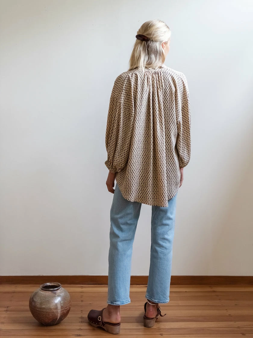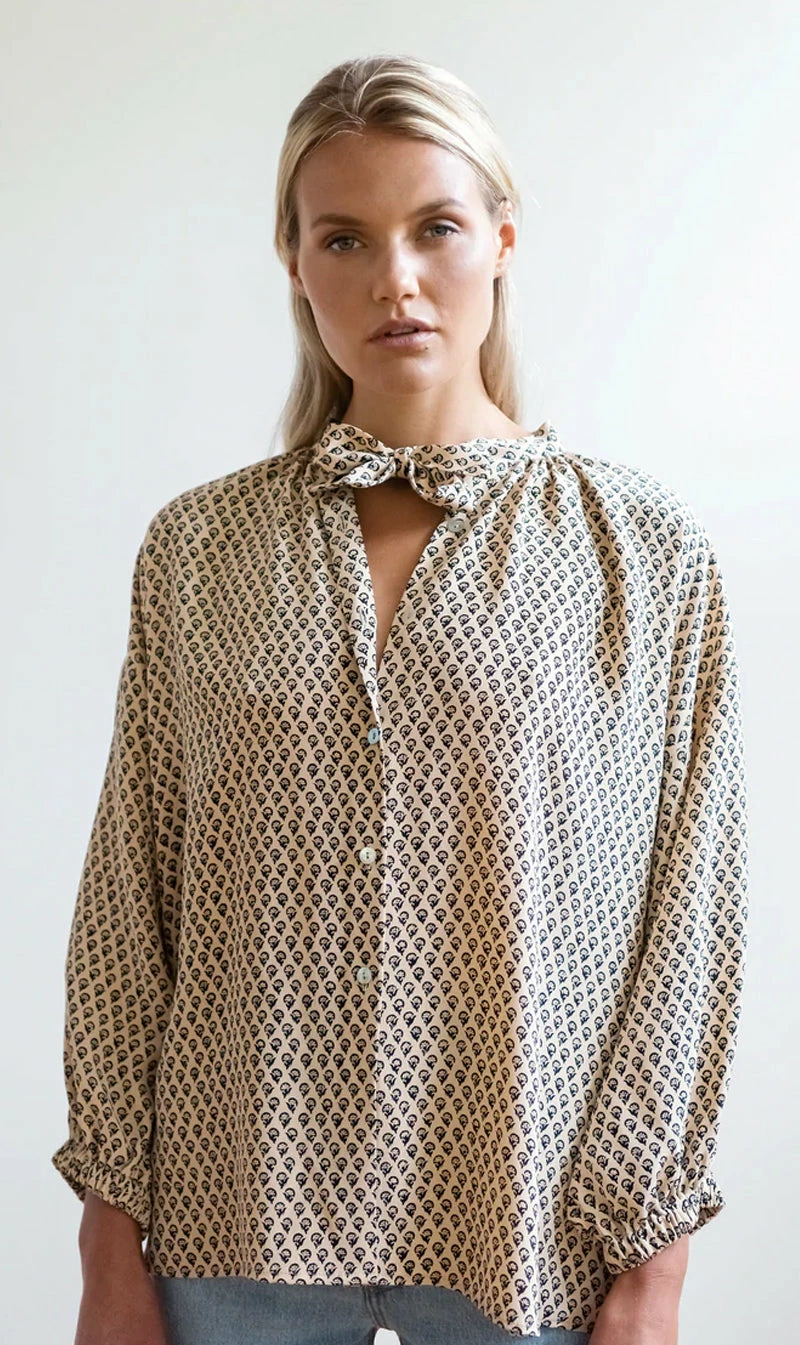 The Mahsa Don’t Tie Me Down Blouse in Paloma Print. The indispensable Don’t Tie Me Down Blouse is back in a diverse palette of trans-seasonal fabrics, with Agoya shell buttons to add a subtle shimmer. This iteration of the Everyday Blouse retains the simple ease of the original with the addition of a neck tie that can be bowed, tied or worn free. Featuring a relaxed three-quarter sleeve and classic shirt tail.