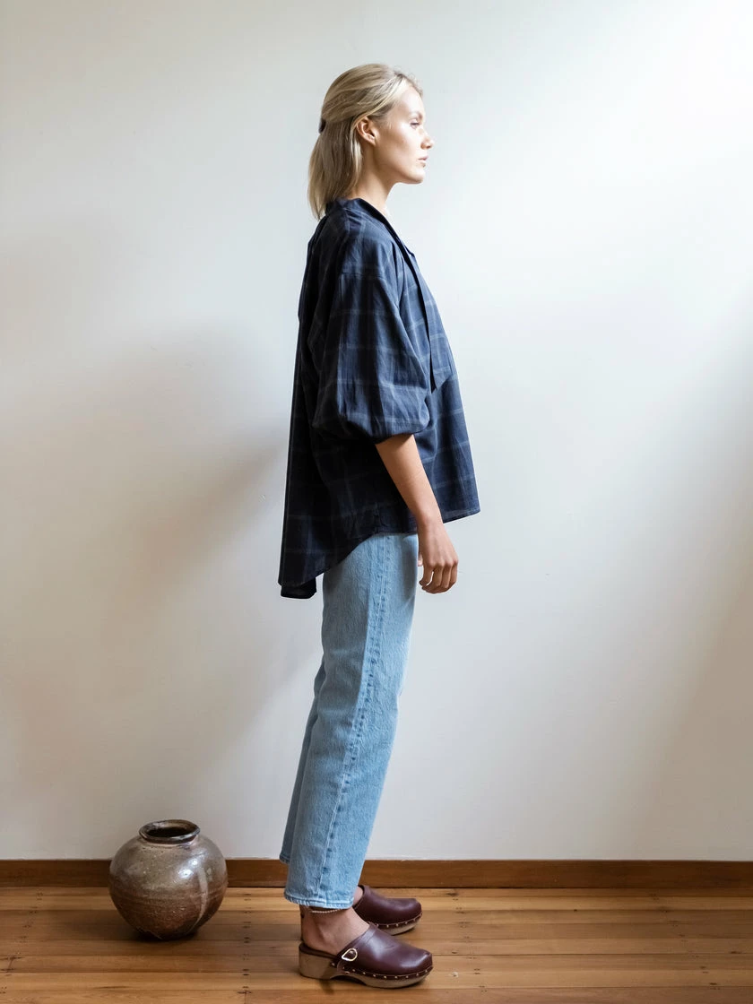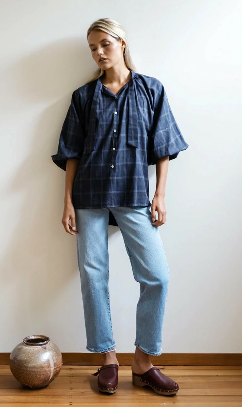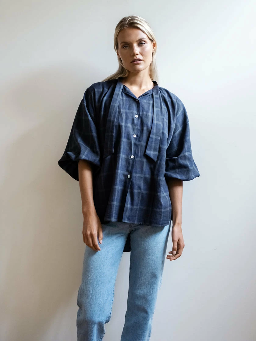 The Mahsa Don’t Tie Me Down Blouse in Yarn Dye Check Ink. The indispensable Don’t Tie Me Down Blouse is back in a diverse palette of trans-seasonal fabrics, with Agoya shell buttons to add a subtle shimmer. This iteration of the Everyday Blouse retains the simple ease of the original with the addition of a neck tie that can be bowed, tied or worn free. Featuring a relaxed three-quarter sleeve and classic shirt tail.