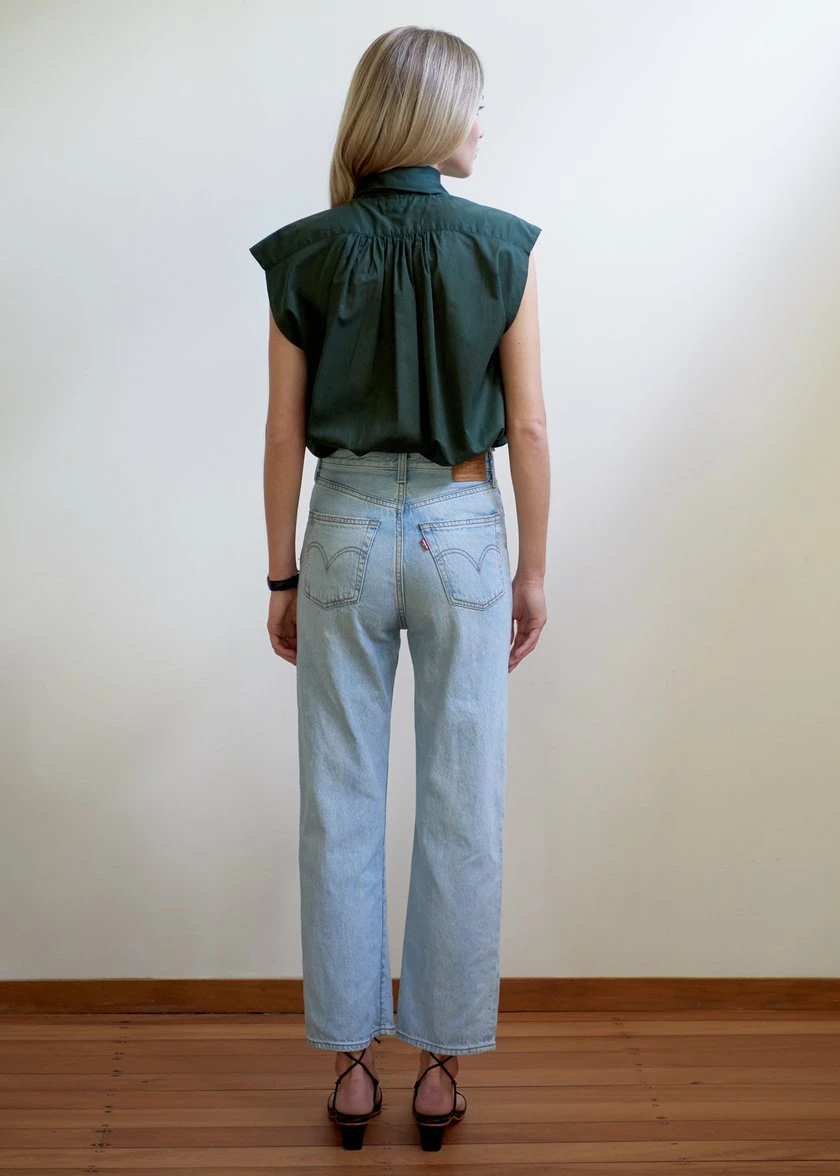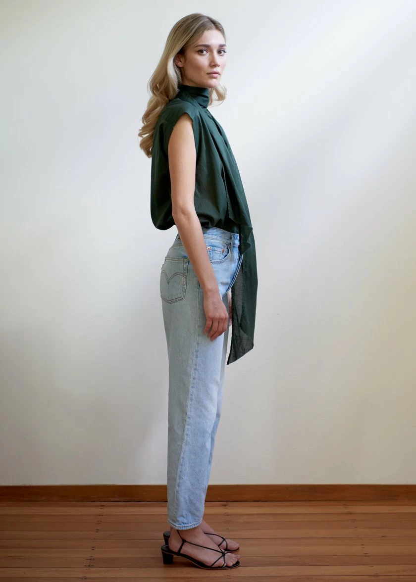 The Mahsa Short Bow Blouse in Jungle. An iteration of the Classic Bow Blouse, with a relaxed sleeveless shoulder that plays off against the traditional tied-up primness of the pussy-bow. The long neck ties can be gathered into a high, voluminous bow, knotted loosely with the raw edges grazing the thigh, or wrapped casually as a scarf. Wear fresh from the clothesline with for a nonchalant vibe or press to crispness and pair with a pencil skirt or denim – depending on where your day takes you, this piece offers flexibility ~ dress up or down. Agoya shell buttons add a gleam of the beach.
