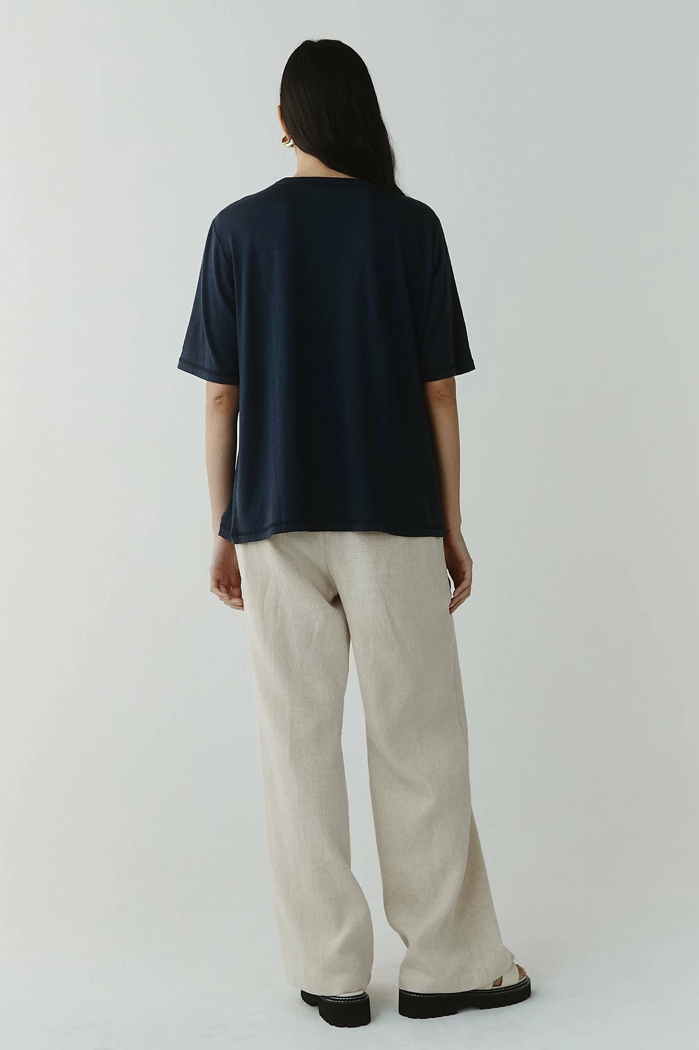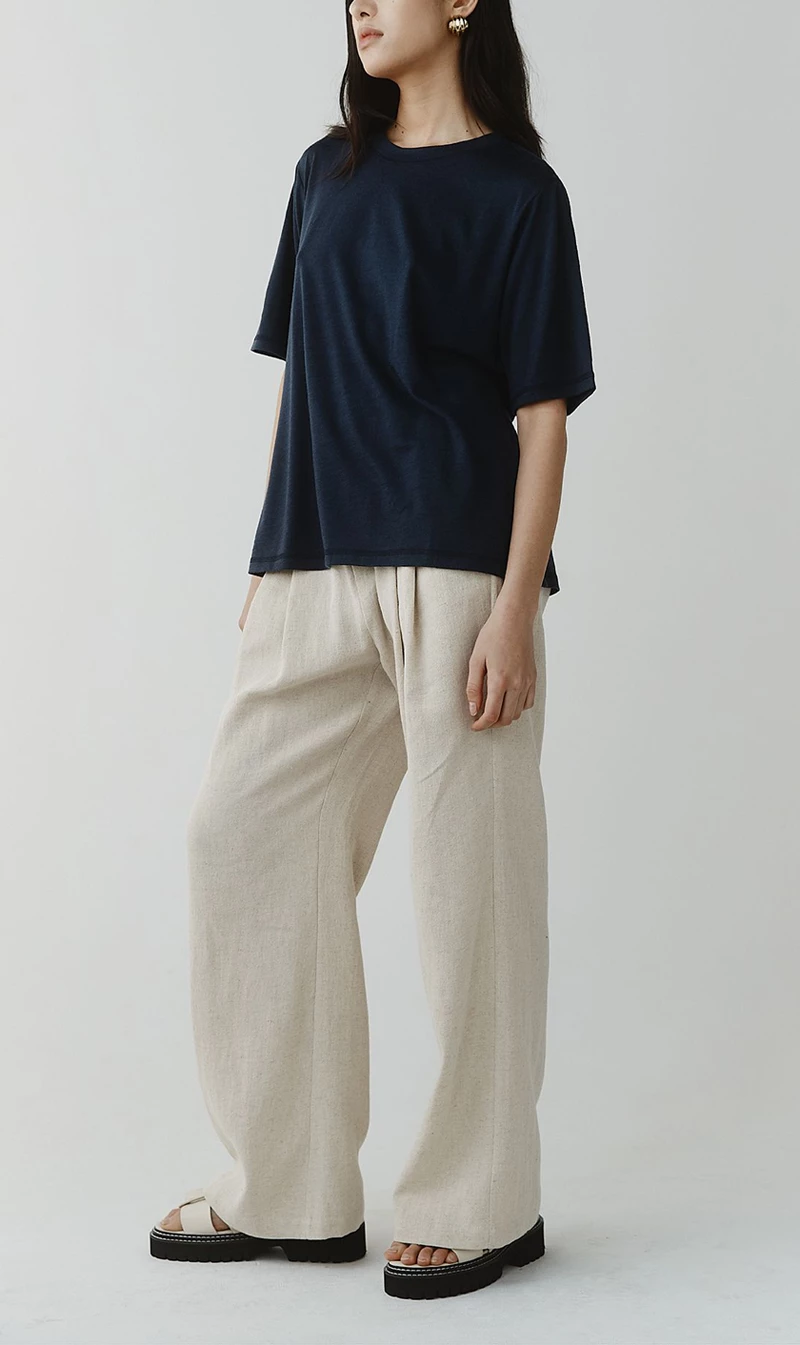 The Aria Top in Blueberry is a modern take on a classic tee. Crafted in fine merino wool, it is an oversized silhouette, with long t-shirt sleeves and a loose fit through the body. Pair this tucked into tailored pants with a blazer for a timeless look.