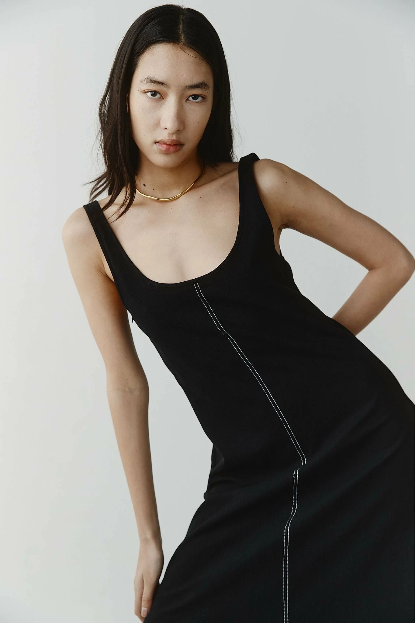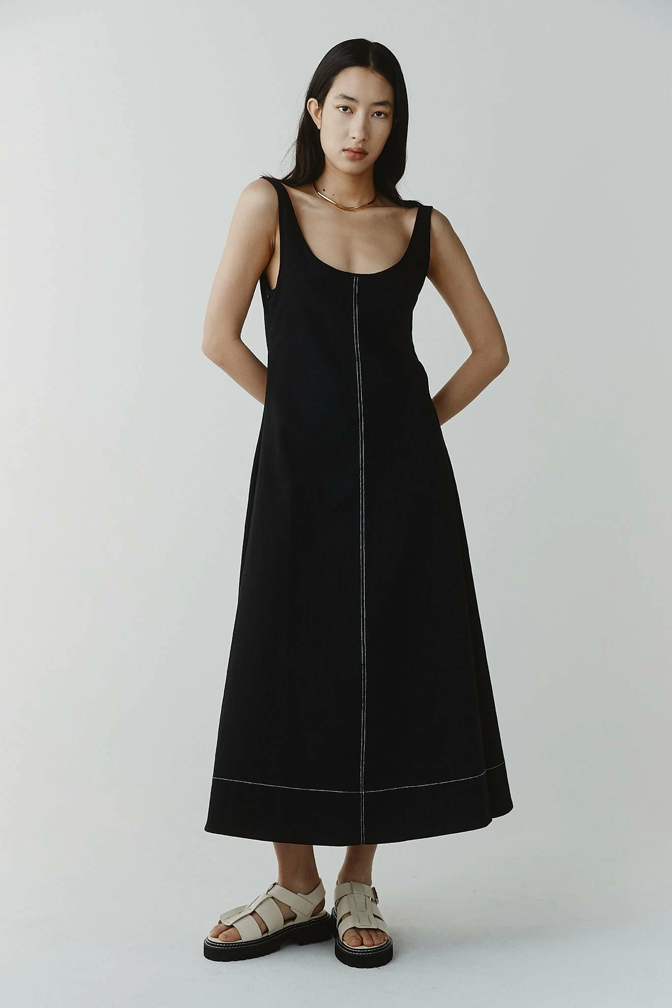The Emile Dress in Black is an iteration of the adored Anouk dress. It features the same fitted silhouette through the waist and chest before falling into an A-line skirt through the bottom. This dress is crafted in a ramie/cotton cloth and features a soft round neckline, and wide straps and is secured by an invisible zipper at the side. This dress is finished with a contrast stitch detailing through the middle and bottom hem.