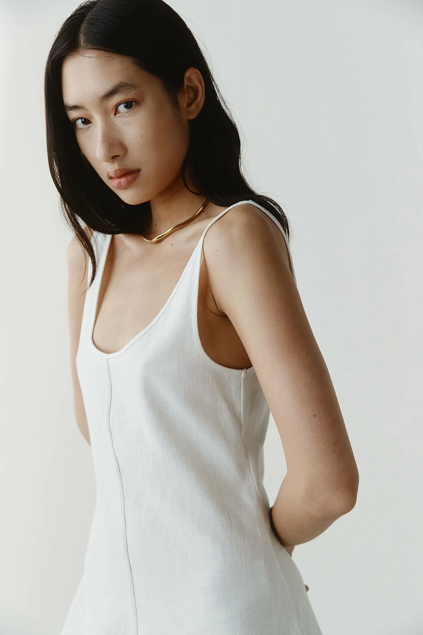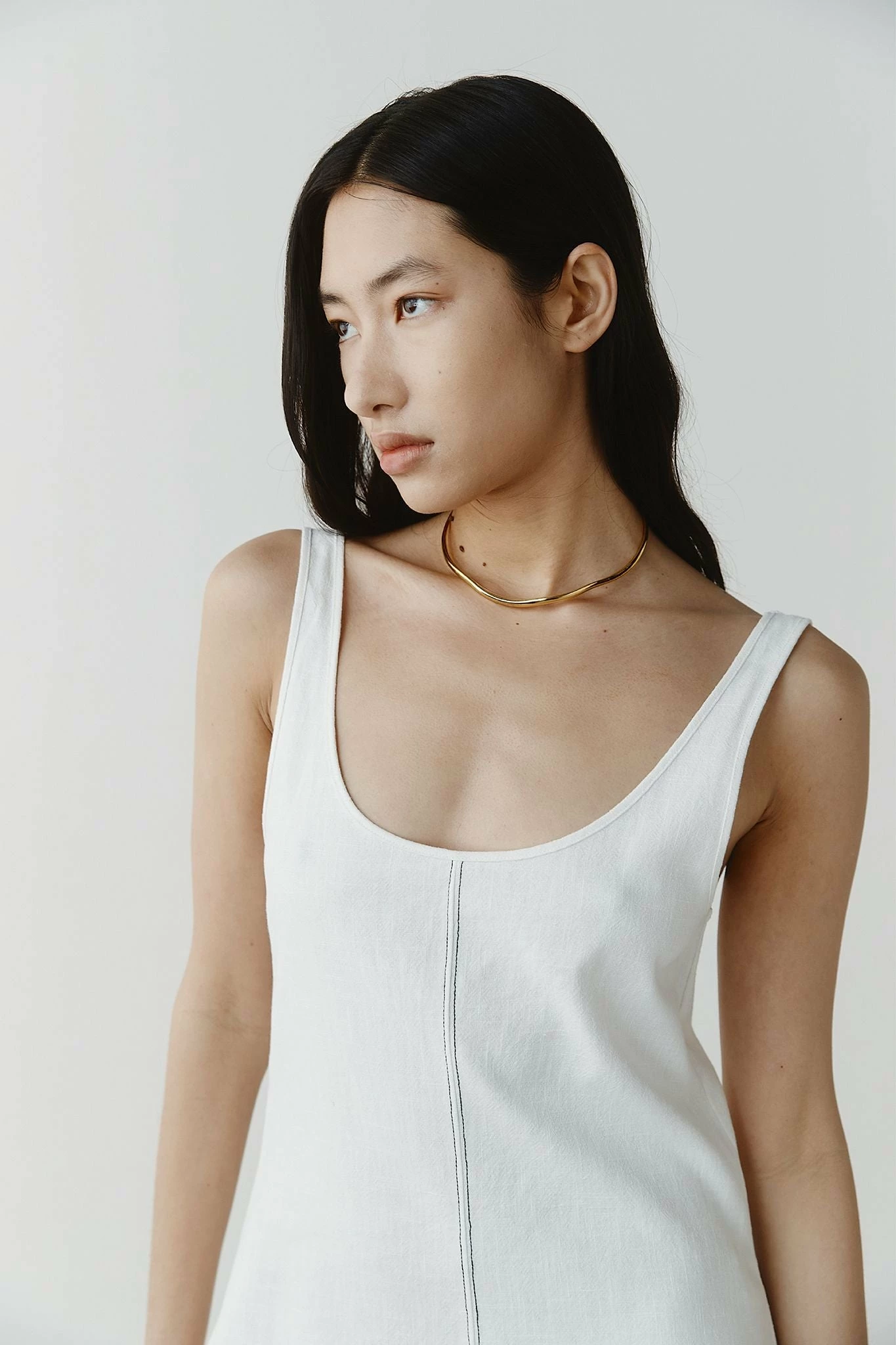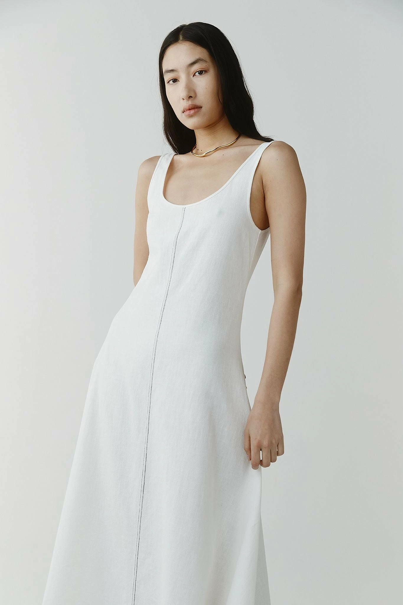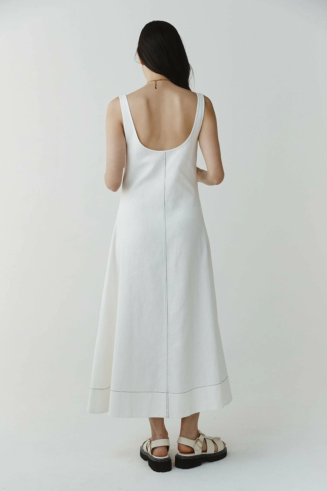 The Marle Emile Dress in Rice is a fresh take on the fan favourite Anouk dress. It features the same fitted silhouette through the waist and chest before falling into an A-line skirt through the bottom. This dress is crafted in a ramie/cotton cloth and features a soft round neckline, wide straps, and is secured by an invisible zipper at the side. This dress is finished with a contrast stitch detailing through the middle and bottom hem.